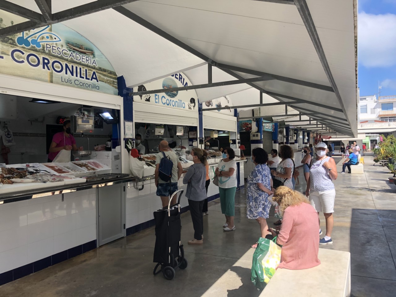 Als eerste vanmorgen hebben we voor 2 dagen proviand ingeslagen. Toen gingen we voor een lange wandeling. Als eerste kwamen we door een gezellige brede winkelstraat, waar we een terrasje bezochten waar het Spaans gezellig was. Via een uitgestorven Mercado, waar maar 10 procent van de stalletjes bezet waren met een paar viskramen en maar 1 fruit en groente kraam en 1 vleeskraam. Of dit met corona te maken heeft of met de opkomst van de supermarkten? Wij weten het niet.