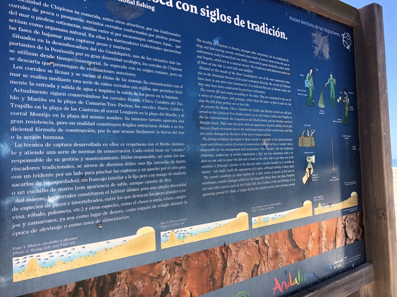 Na onze exclusieve boordmaaltijd (sollomilo, patatas bravas en calabacin met tomates) ben ik naar de boulevard gewandeld. In dit stadje hebben ze een aparte manier van vissen. Ze hebben voor de stranden een soort van hele grote bassins (los corrales) gemaakt. Deze blijven bij laag water gedeeltelijk gevuld, zodat de vissers met netjes en schepjes de vissen en schelpen gemakkelijk kunnen vangen. Helaas waren ze vandaag niet aan het vissen.