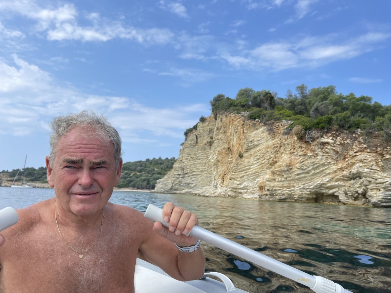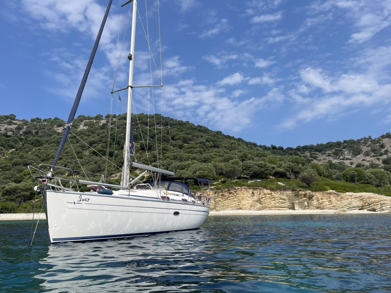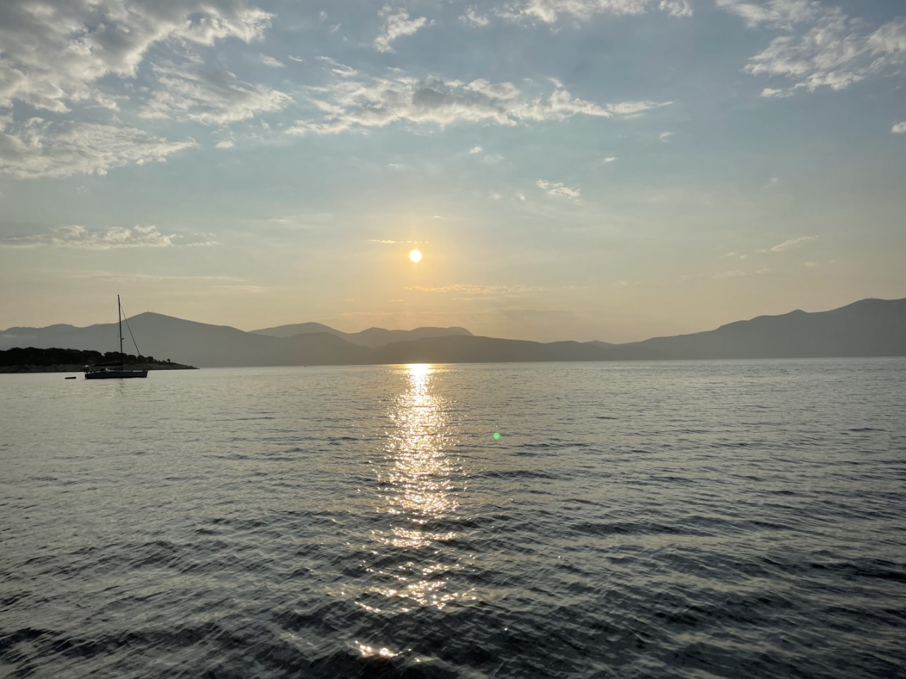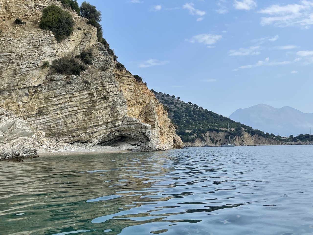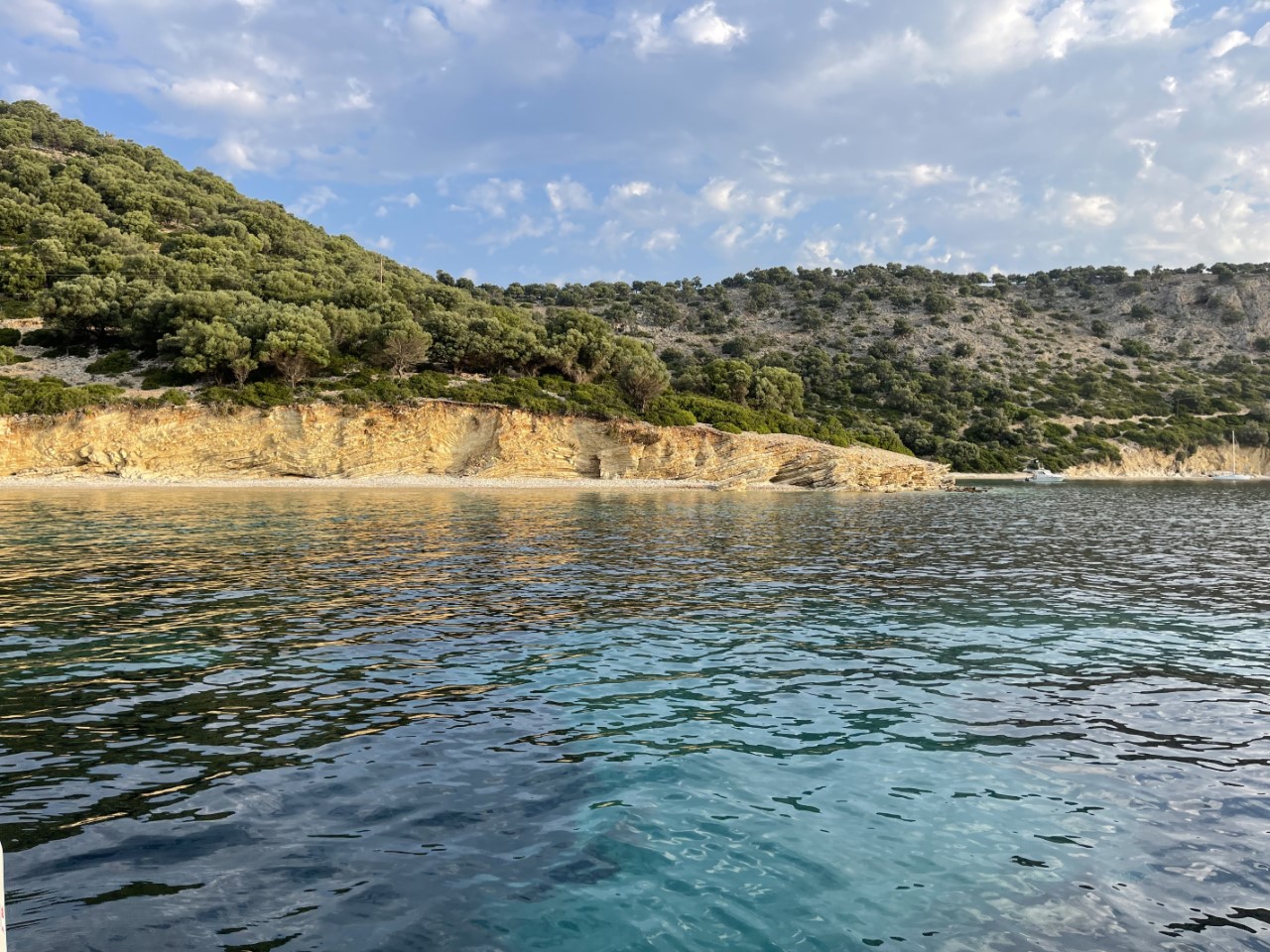 We hadden verwacht, dat we vanmorgen gewekt zouden worden door mekkerende geitjes, dat was niet zo, maar wel door een mooie zonsopkomst. Wat doe je op zo’n dagje op een hele mooie ankerplek. We roeien eerst naar een rots, waar we een grot hadden verwacht, dat echter een klein strandje verborg. Dan roeien we nog iets verder naar een ernaast gelegen strandje, waar de geitjes zich wel laten horen. Bij terugkomst op de Just hebben we het warm gekregen van het roeien en nemen snel een duik.