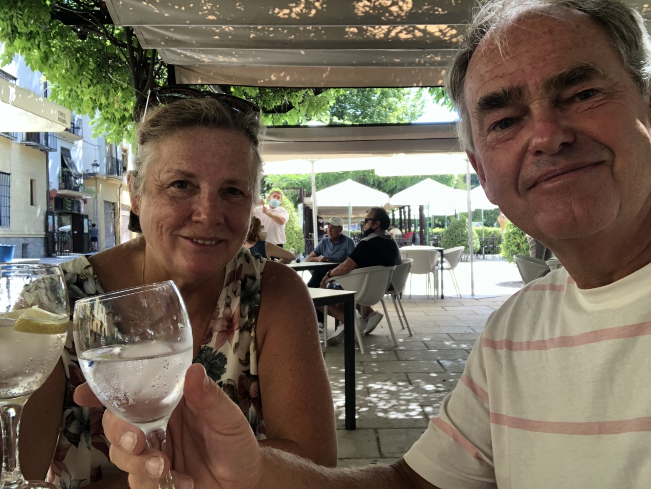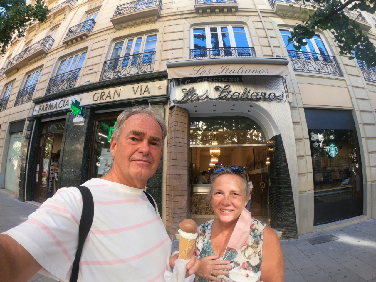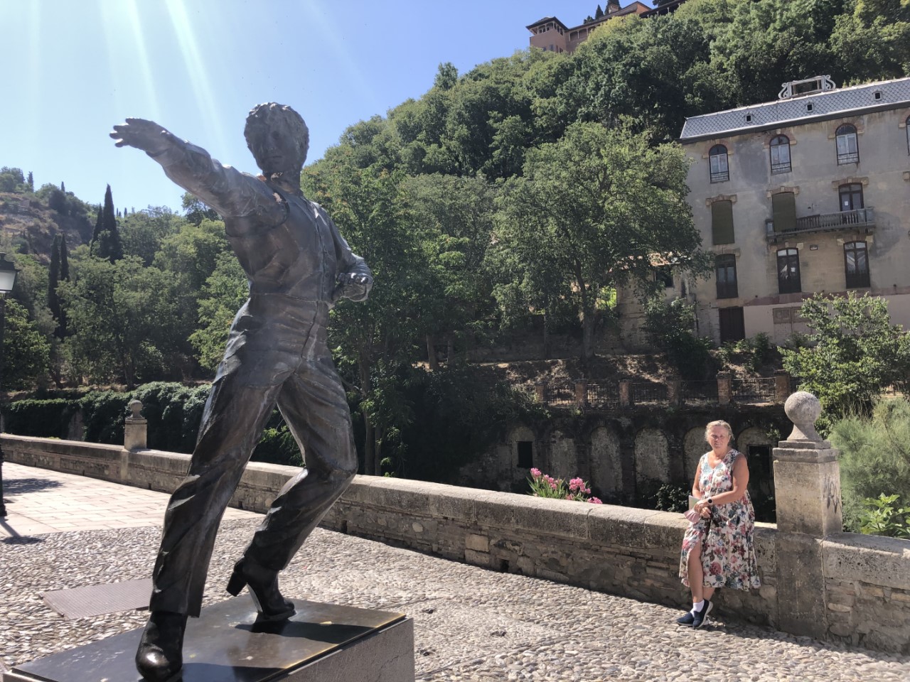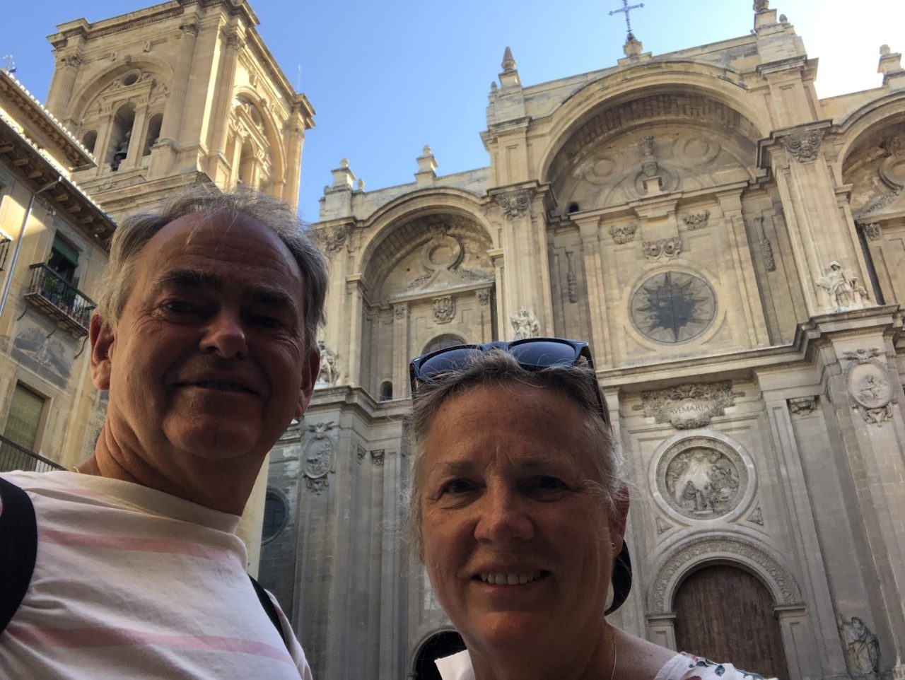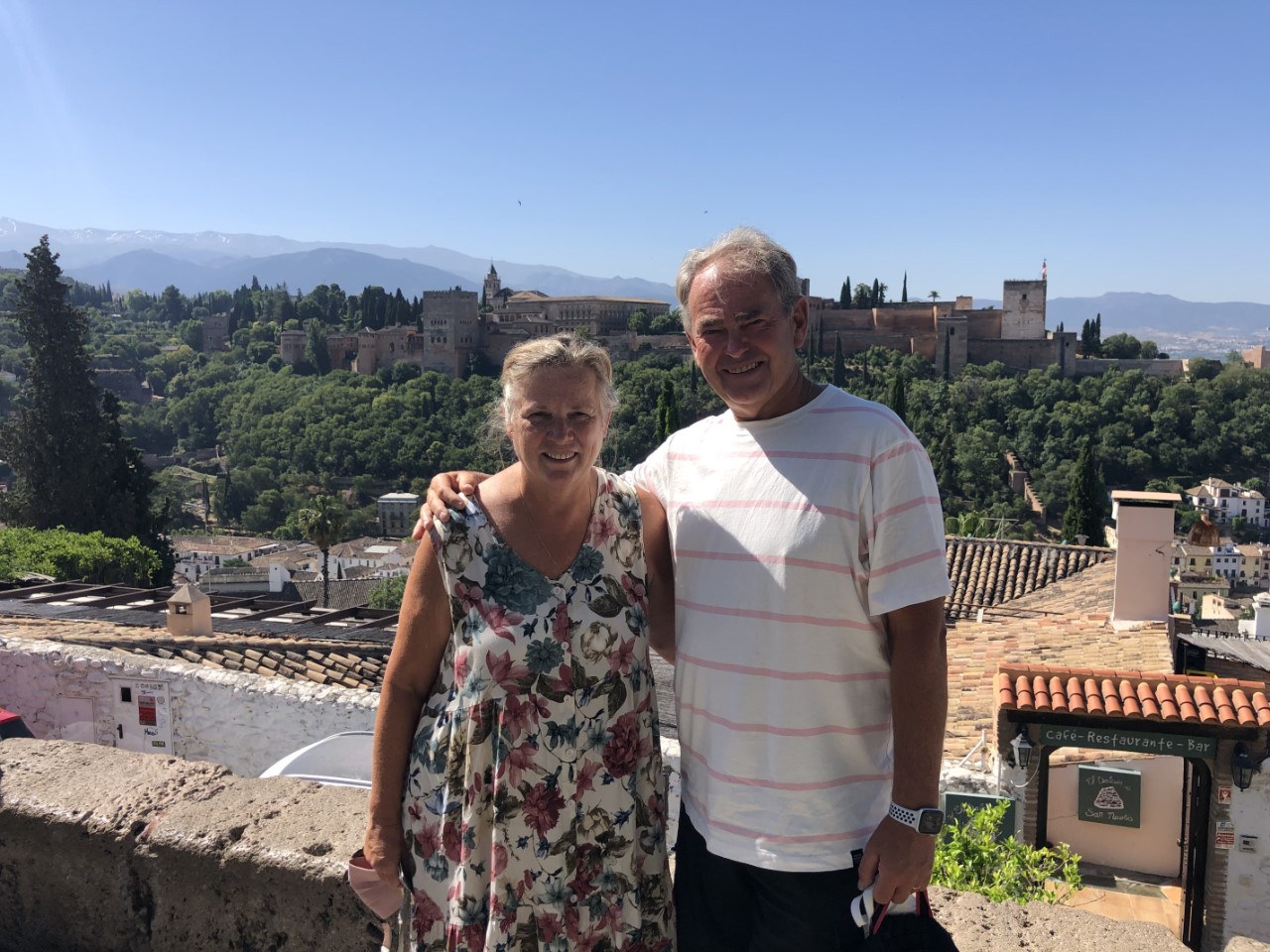 We zijn vroeg uit ons bed. Snel ontbijten en om 7:30 uur de taxi in. We moeten om 8:00 uur bij het busstation zijn voor de bus naar Granada. De rit ging door de bergen de Sierra Navada met veel kunstige viaducten en een flinke hellingshoek. Links en rechts was een prachtig uitzicht op de mooie valleien, stuwmeren en bergtoppen. De rit duurde ruim anderhalf uur. Dichtbij het centrum zijn we uitgestapt en hebben snel een terrasje opgezocht samen met Marion en Paul van de Flegma.
