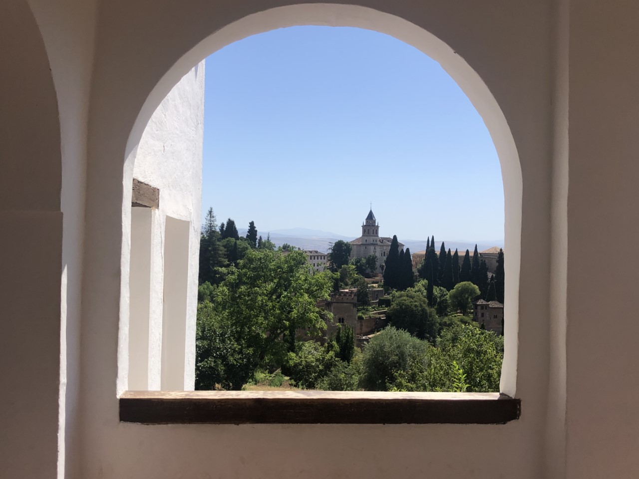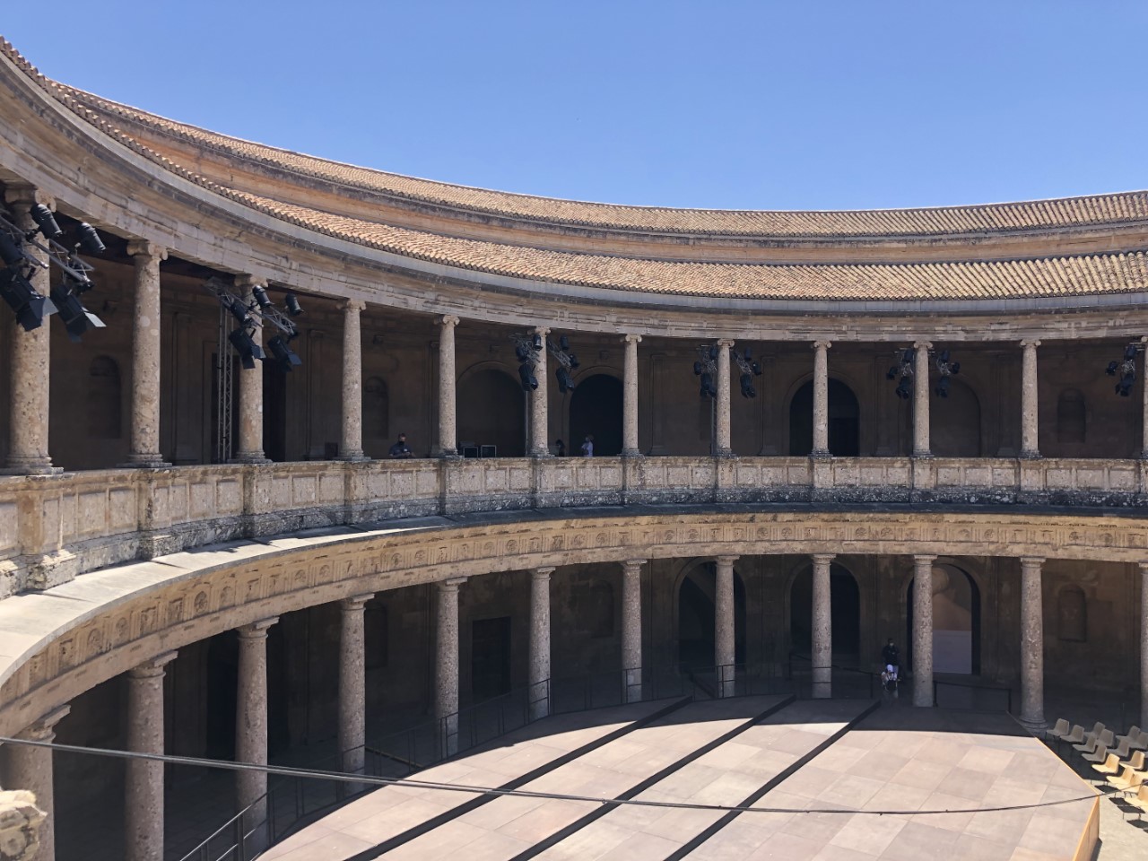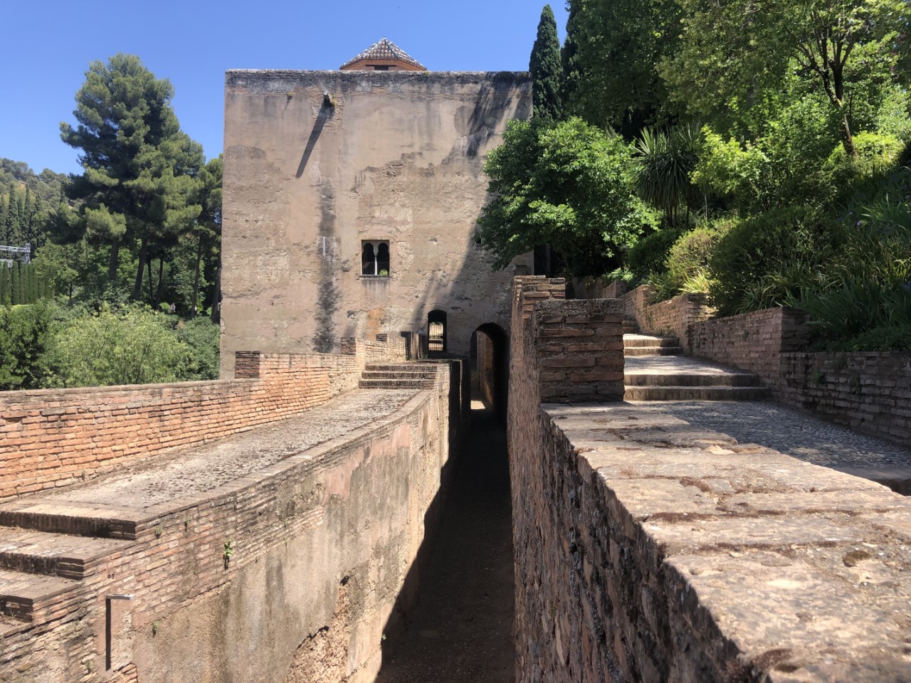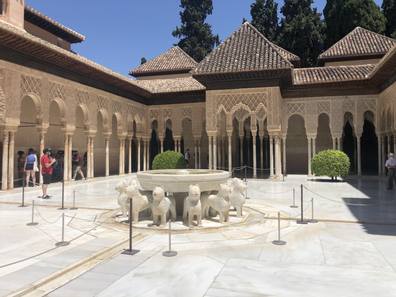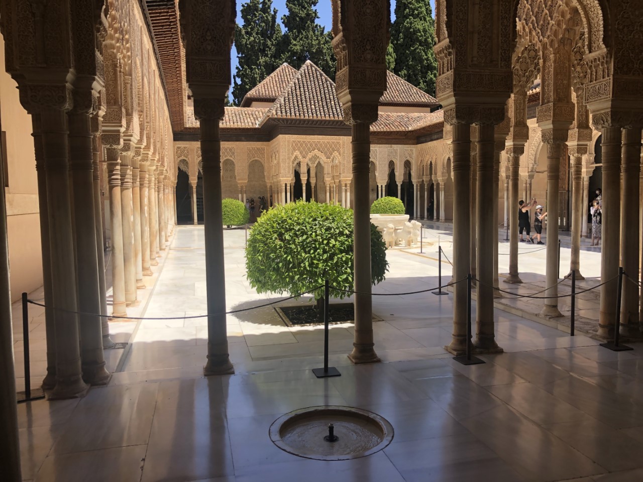 Dat is weer een hele steile klim en dan met een temperatuur van rond de 30 graden. Bij verschillende plekjes in de schaduw nemen we even rustpuntje en we zijn niet enige. Bij de entree van het Alhambra is een strenge controle met toegangsbewijs en paspoort. Jammer genoeg niet met een audiotour (Covidregels) of een plattegrond (óók Covidregels). Dan maar zelf de beste weg op het complex zoeken (wat best een puzzel bleek te zijn, want er staat maar hier en daar een bordje). Via een mooi pad met een lange rij coniferen, die geknipt waren met poortjes er in, komen we op een centraal plein. We lopen tegen het paleis van Karel de Vijfde aan. Daar binnen bevindt zich een soort arena met twee galerijen. En een klein museum met wat oude troep (museum van de schone kunsten).