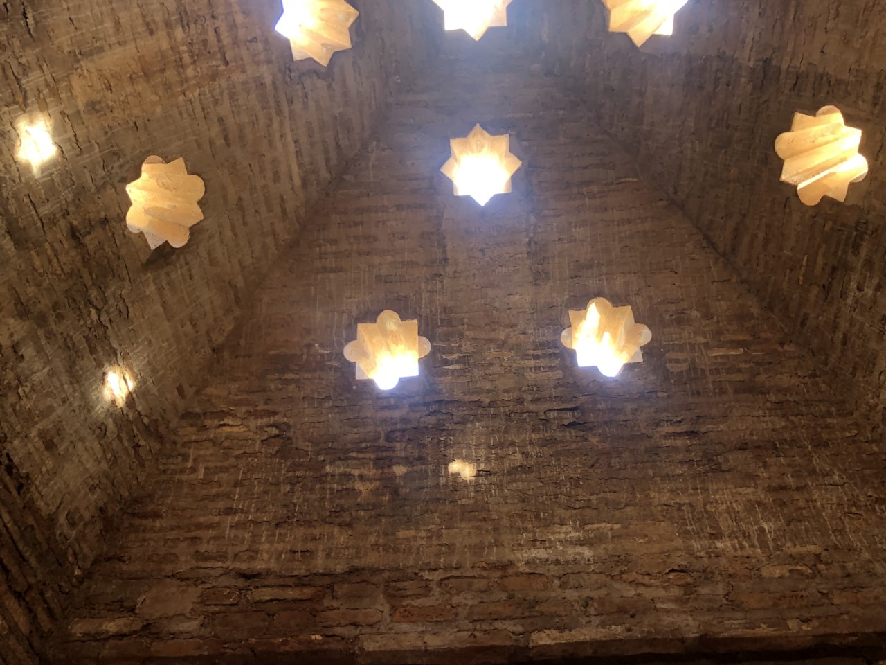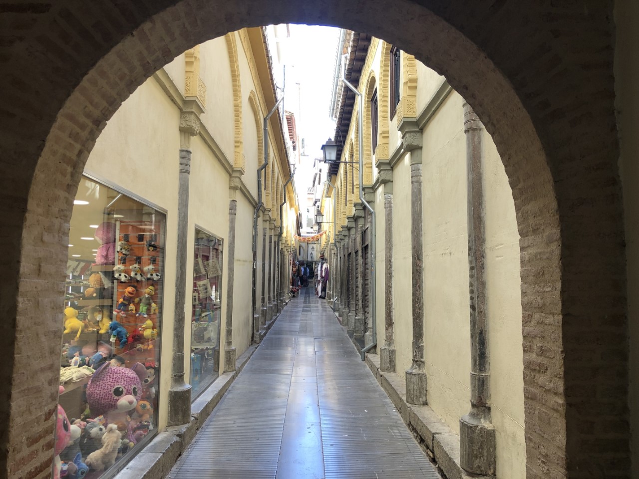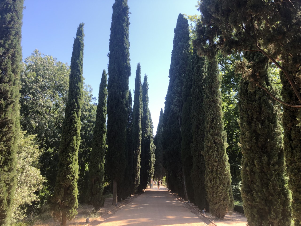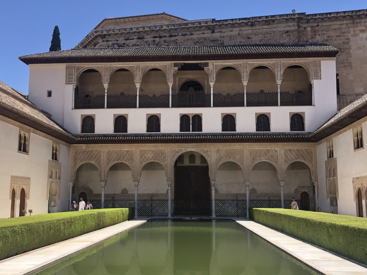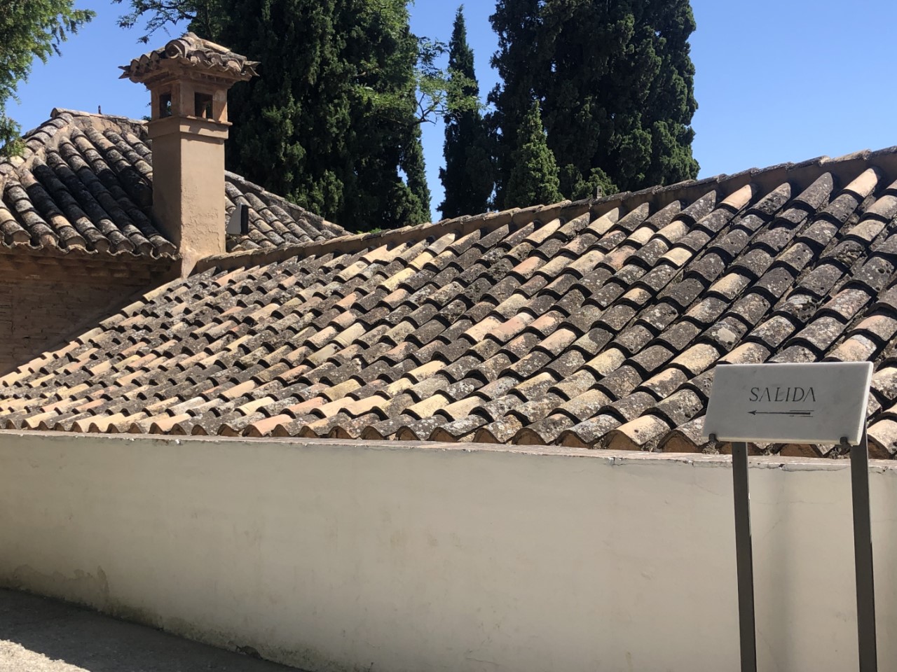 Dat is weer een hele steile klim en dan met een temperatuur van rond de 30 graden. Bij verschillende plekjes in de schaduw nemen we even rustpuntje en we zijn niet enige. Bij de entree van het Alhambra is een strenge controle met toegangsbewijs en paspoort. Jammer genoeg niet met een audiotour (Covidregels) of een plattegrond (óók Covidregels). Dan maar zelf de beste weg op het complex zoeken (wat best een puzzel bleek te zijn, want er staat maar hier en daar een bordje). Via een mooi pad met een lange rij coniferen, die geknipt waren met poortjes er in, komen we op een centraal plein. We lopen tegen het paleis van Karel de Vijfde aan. Daar binnen bevindt zich een soort arena met twee galerijen. En een klein museum met wat oude troep (museum van de schone kunsten).