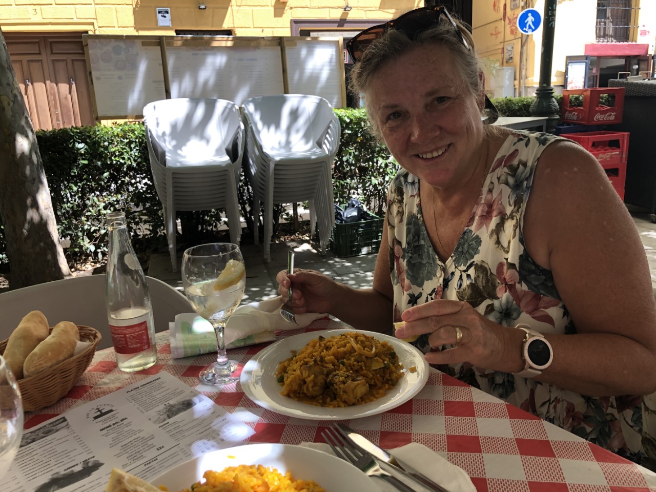 Bij de Kathedraal van Granada scheiden onze wegen en gaan we met z’n tweetjes verder. We hebben van Roberto onze havenmeester wat tips gekregen over wat we moeten bezoeken in Granada. De eerste tip was Los Italianos, de beste ijssalon. Dat was een goede tip en we hebben daar ons eerste ijsje genomen, 2 bolletjes voor maar € 1,50. We gaan door naar Plaza Nueva, Paseo de Los Tristes en Mirador San Nicola’s. Met elk bezichtigingspunt gaan we steeds hoger de bergop via steile hellingen en hoge trappen. Maar alles is mooi. Op het laatste punt hebben we uitzicht op het Alhambra en de terrassen gaan open voor de lunch. We hebben daar lekker gegeten. We kregen eerst een tapas, aardappelsalade met ei. Toen een flinke portie paella gevolgd door gefrituurde visjes met friet en ik ging voor de albondigas (gehaktballetjes met saus) en friet. Nog een toetje na en we hebben energie genoeg om het Alhambra te bezoeken.