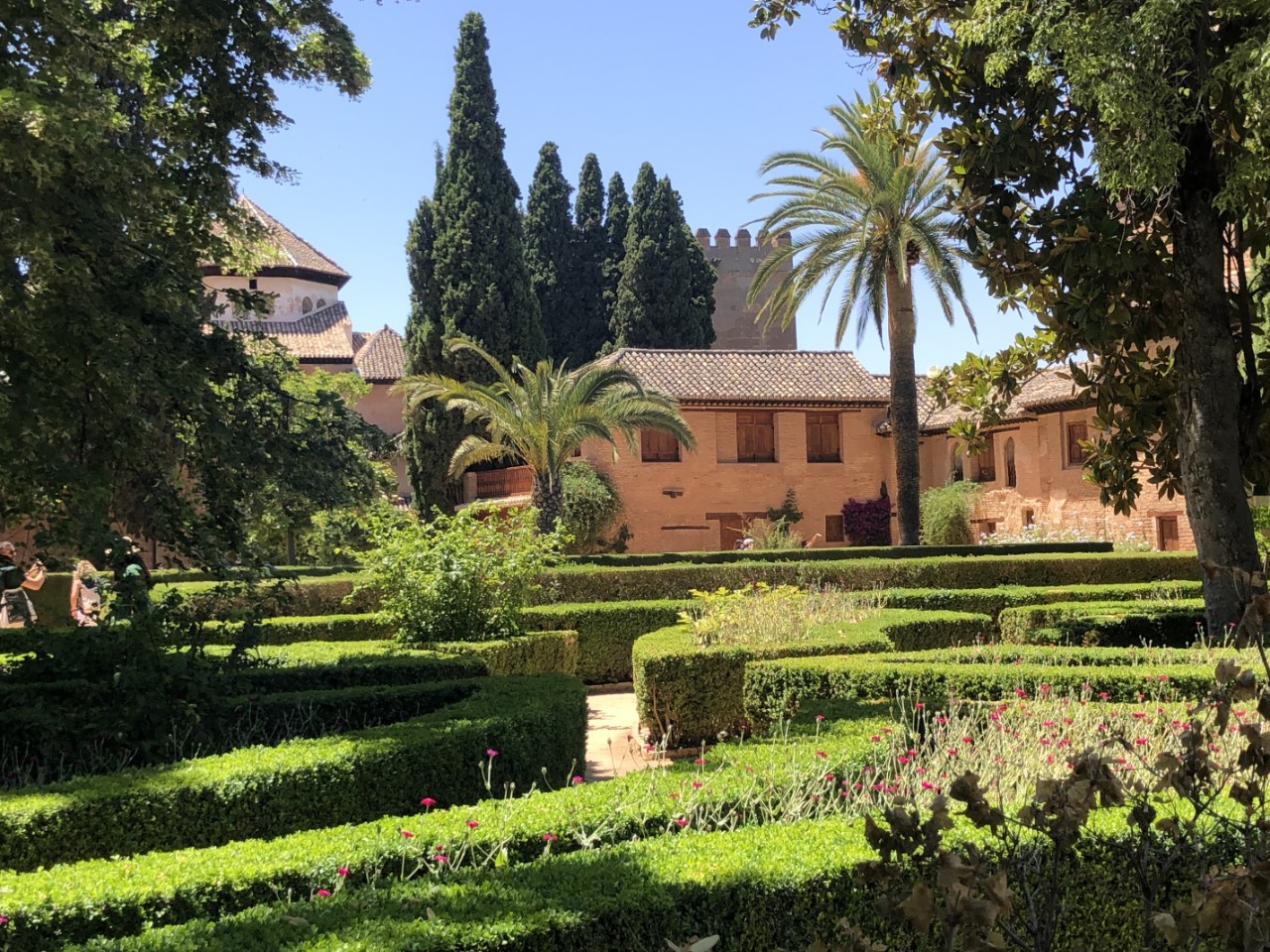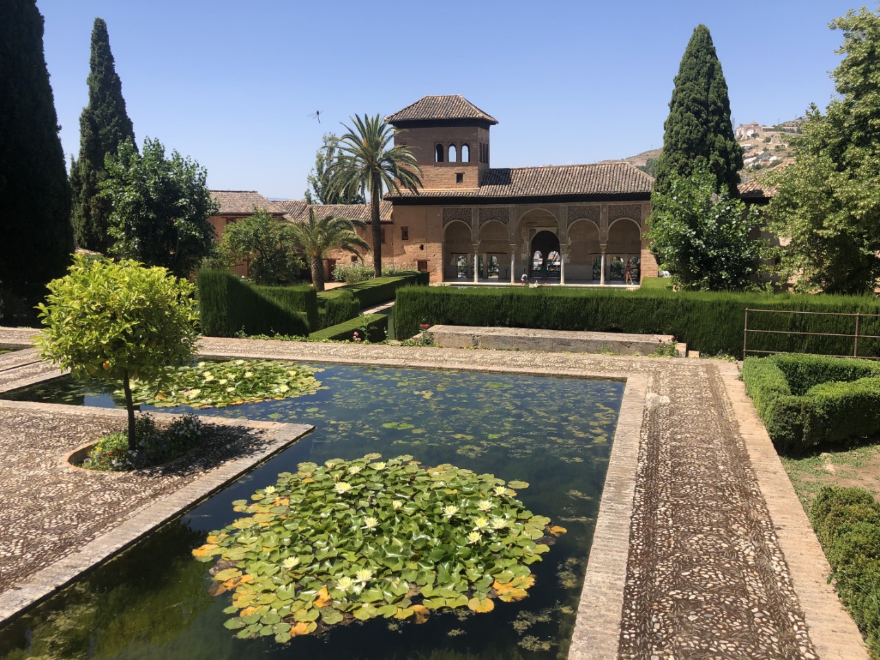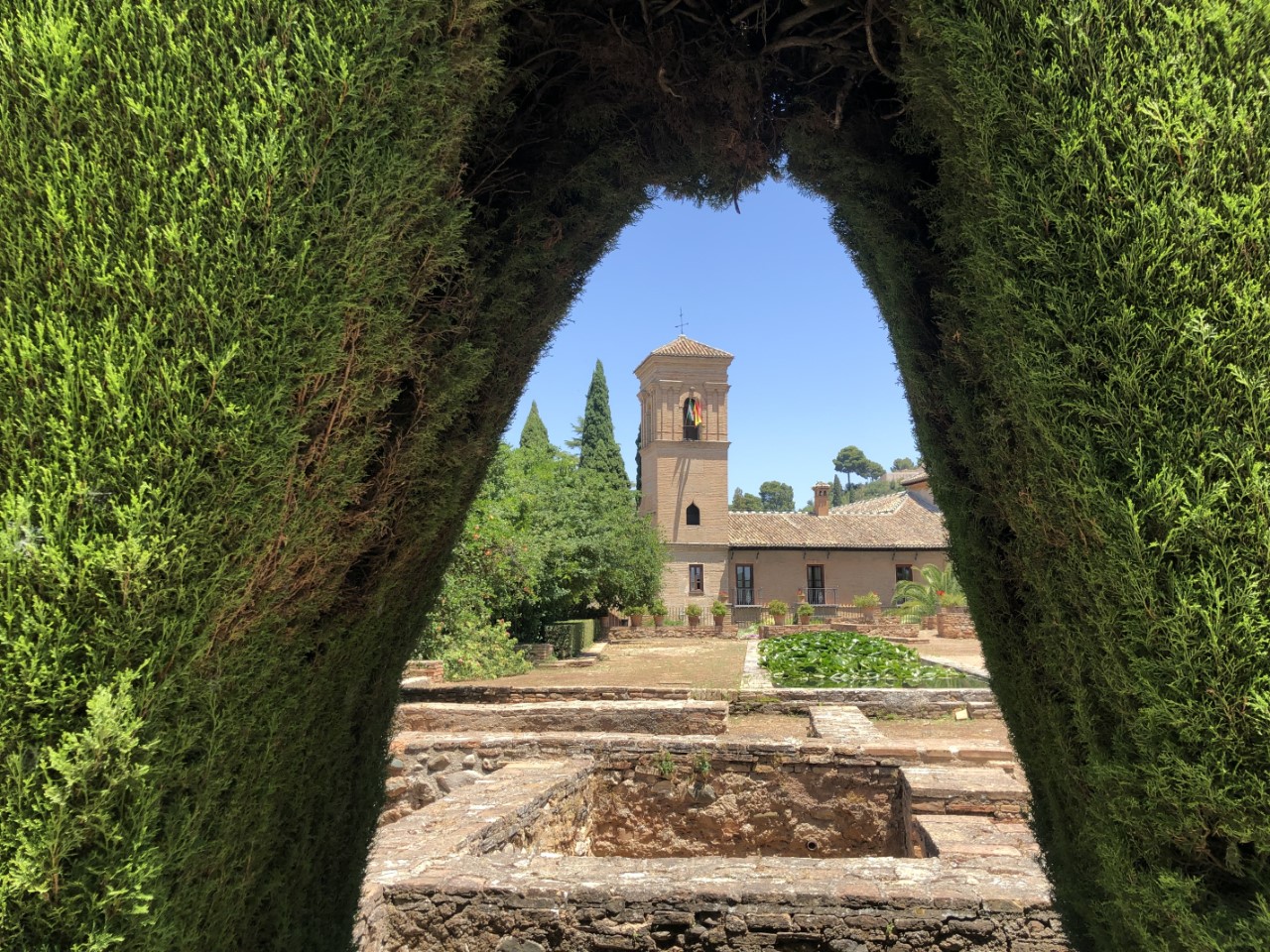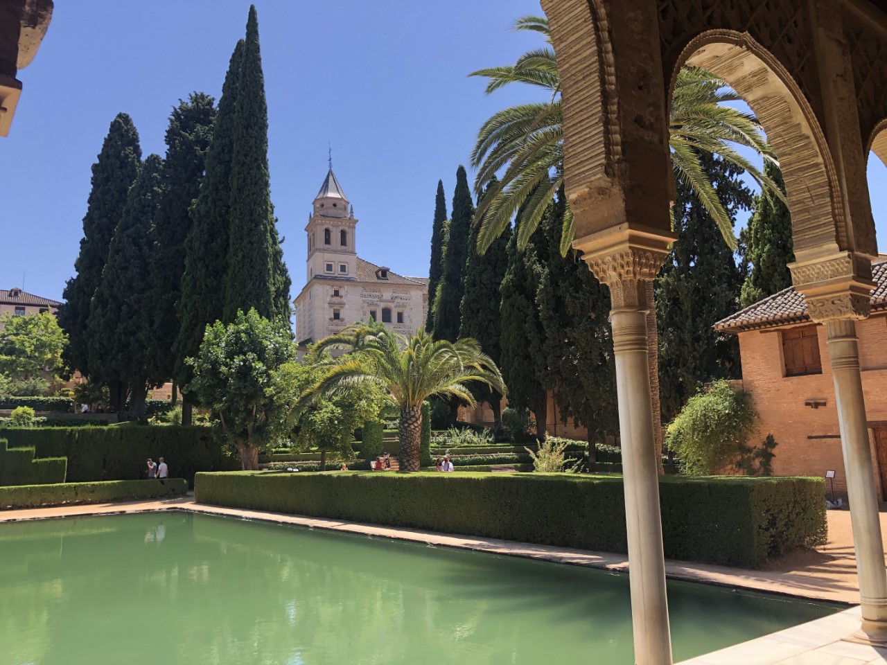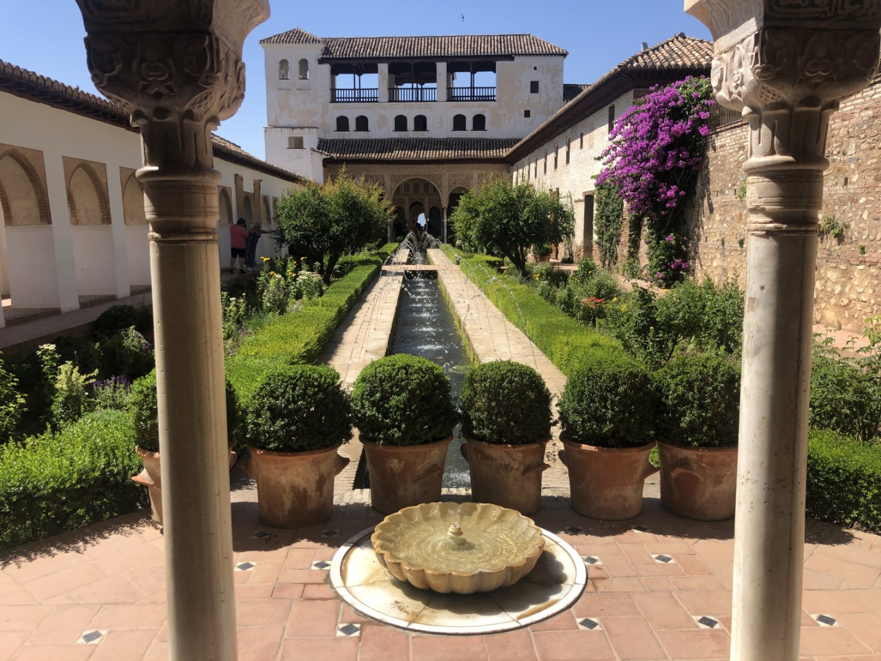 Als laatste gaan we naar Generalife. Dat is de tuin van het zomerpaleis, wat prachtig is aangelegd met daarin veel waterpartijen. Ons bezoek zit er op en we nemen de kortste route terug naar Granada met als doel de Italiaanse ijssalon, die we een tweede bezoekje waard vinden. We zitten lekker met ons ijsje op een bankje, als Marion en Paul komen langsgelopen en met hen zijn we samen naar het busstation gewandeld.