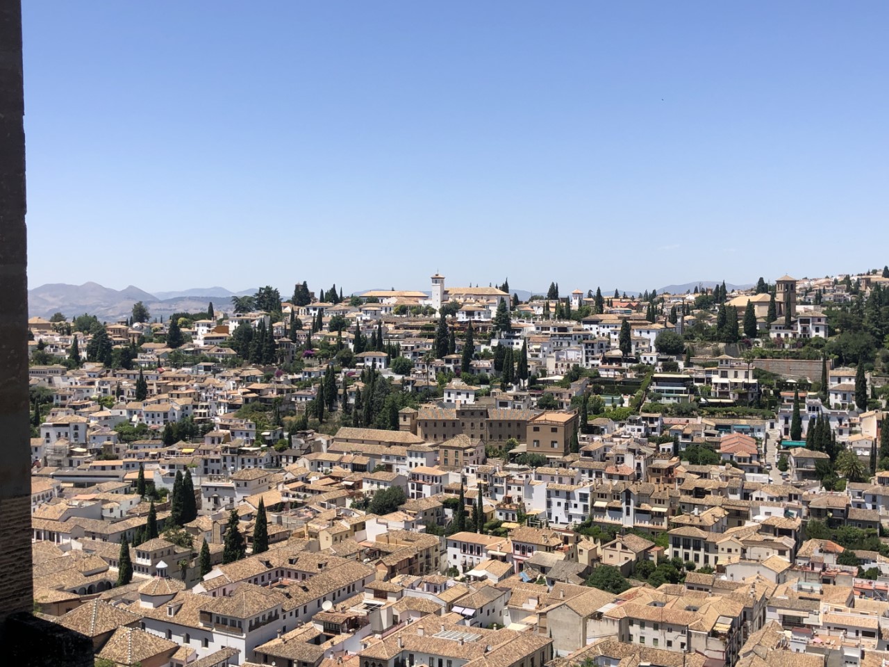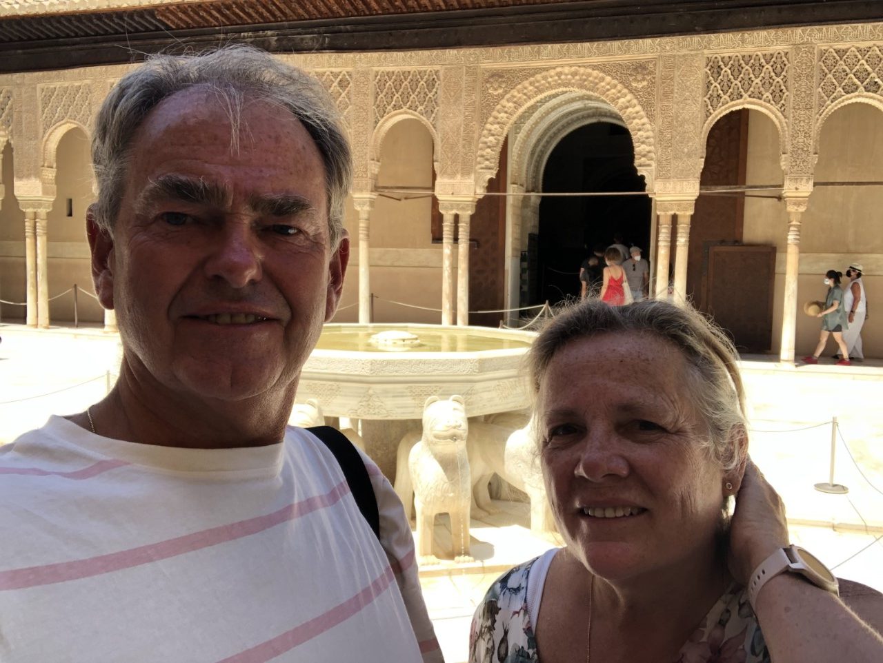 De rij naar het Nasrid paleis begint zich al te vormen en wij zijn maar aangesloten voor onze toegangstijd van 14:30 uur. Eenmaal binnen hebben we de pracht en praal van een echt paleis kunnen bewonderen. De ene kamer nog mooier dan de andere en vele binnentuinen met fonteinen, vijvers en doorkijkjes. In het middelpunt bevindt zich de Leeuwenfontein en Marianne met haar sterrenbeeld voelt zich daar helemaal thuis. We zijn toen wat lopen dwalen rond de tuinen om het paleis en hebben verschillende Palacio’s bekeken. Het oude Alcazaba is onze één na laatste bezichtiging. Het is een oud Moors kasteel van vele jaren geleden met een steile trap in de toren, waar je een mooi uitzicht hebt over de stad Granada.