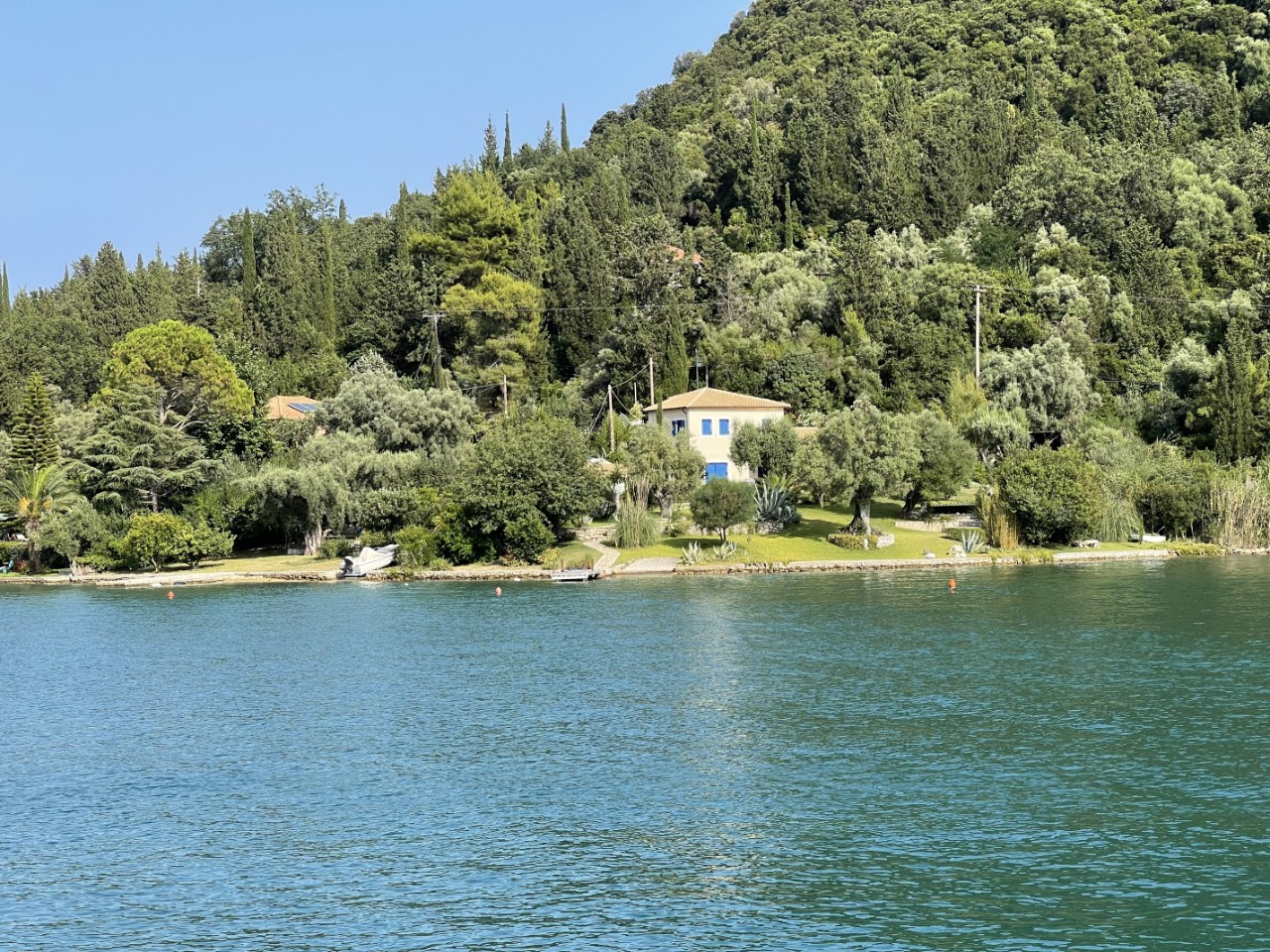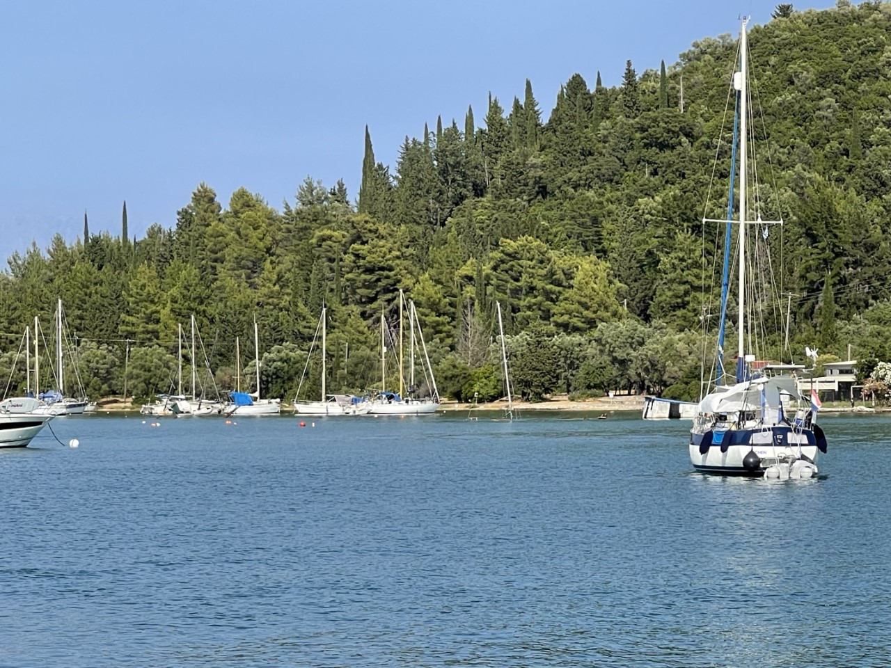 Tegen de middag gaan we met het bijbootje een paar boodschappen halen. We hebben geen zin met deze temperaturen verder te wandelen in Nydri. Aan boord hebben we meer verkoeling en een zwembad met heerlijk water rond de Just.