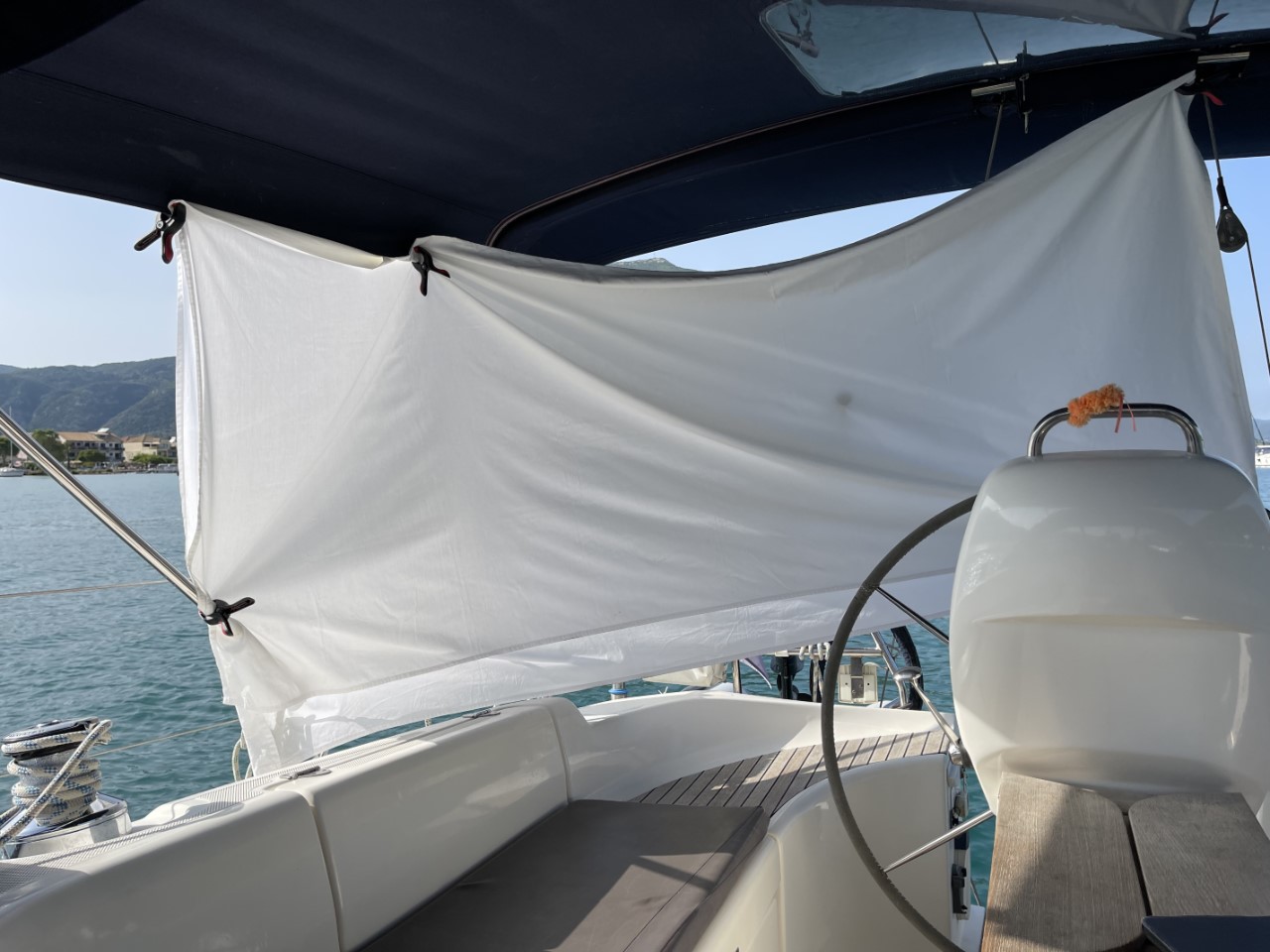 Als de zon weer onderweg is naar beneden en de bimini zijn dagtaak heeft volbracht, hangen we een groot laken op tegen het brandende zonnetje.