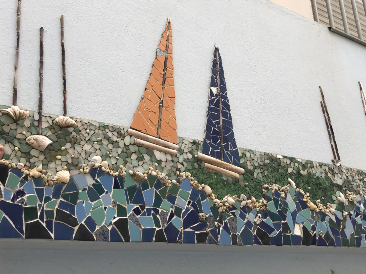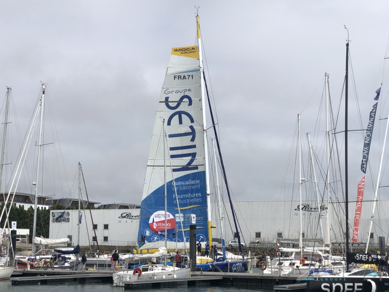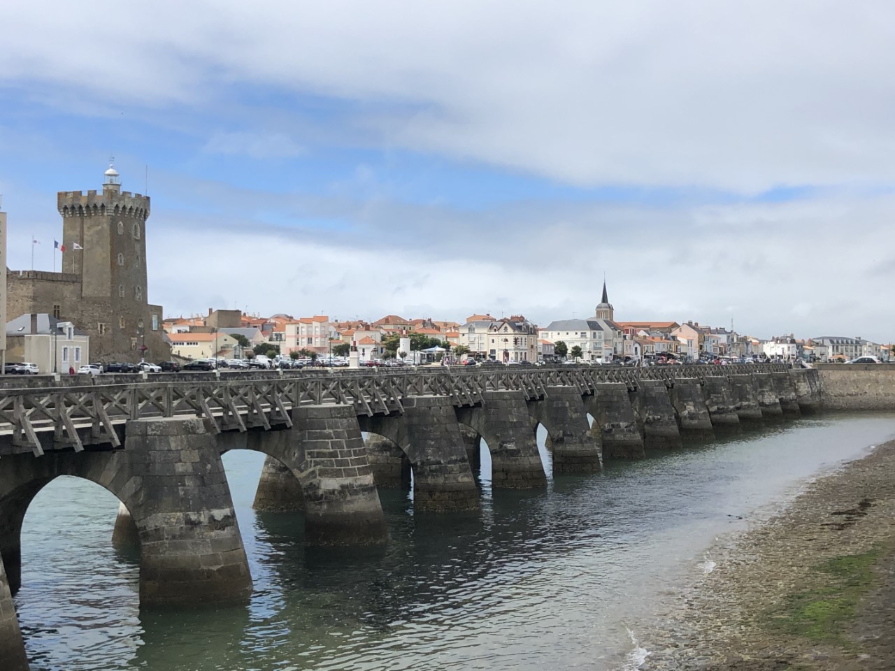 Zelfs ik kon uitslapen, wat ik natuurlijk niet doe. De broodjes deden we oppiepen in de wonderpan. Het had een lui dagje kunnen worden, maar Marianne had besloten de was te doen. Na het douchen op zoek naar muntjes voor de wasserette. Tijdens het wassen werden alle vloerluiken geïnspecteerd op resterend water van het ongelukje van onze eerste dag in La-Roche-Bernard. Inderdaad moesten we weer dweilen en kunnen we er nog steeds geen spulletjes in stouwen. Daarna gingen we naar de supermarkt voor eten voor de komende dagen en nog wat brood voor morgenochtend als we vroeg gaan vertrekken. Het plan is 06:00 uur. Voorlopig doen we de middag rustig aan en gaan we op ons gemak het stadje verkennen. Marianne hoopt het budget nog even uit te geven, maar kan toch niet slagen voor een jurkje. We bekijken even de kerk. We wandelen langs de boulevard en zitten een tijdje uit te kijken over de oceaan. Er zijn ondanks de lichte miezerregen en de dichte bewolking vrij veel mensen aan het zwemmen en op het strand. De boulevard is druk en het stadje gezellig. Er gaat een pontje de haveningang over en die weten we net te halen. De schipper wilde alleen Marianne meenemen, ik ben met trois, zei ze. De schipper lachte dat die twee er ook nog wel bij konden. Pas de peur als er te veel mensen op het pontje zijn. We waren flink moe geworden van de lange wandeling en konden nog net ons maaltje bereiden. Hè, hè, toch nog heel wat gedaan vandaag.