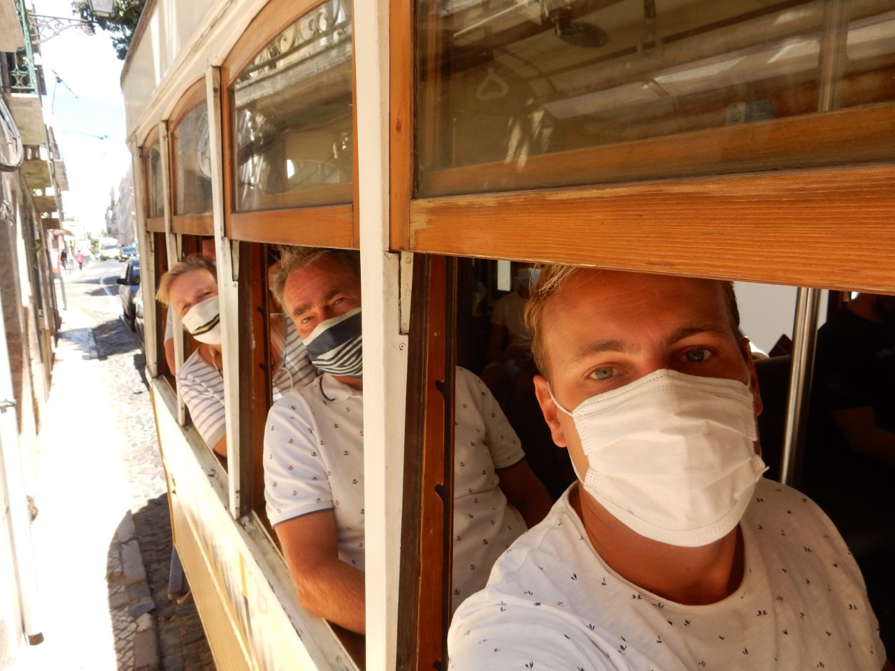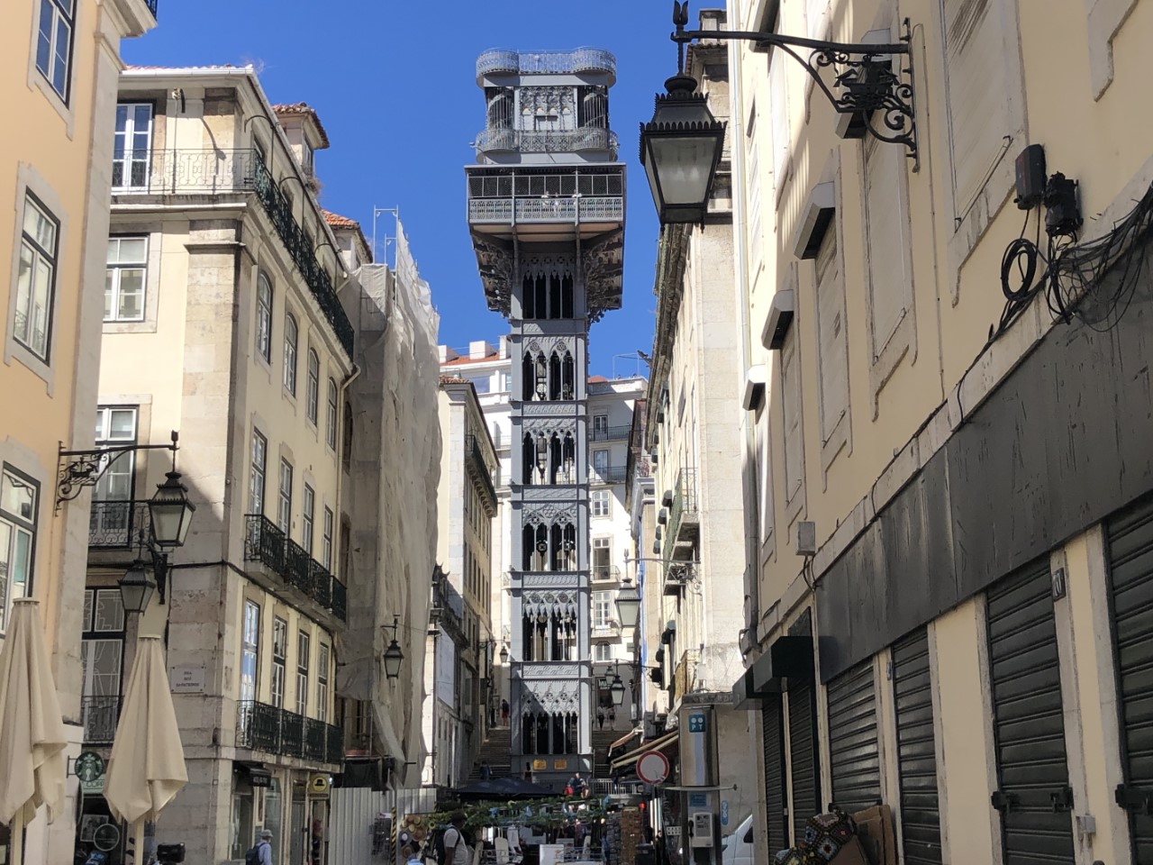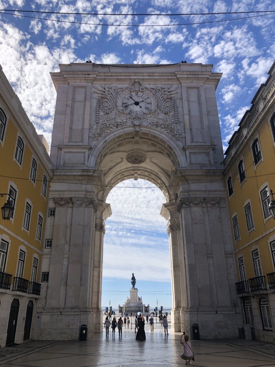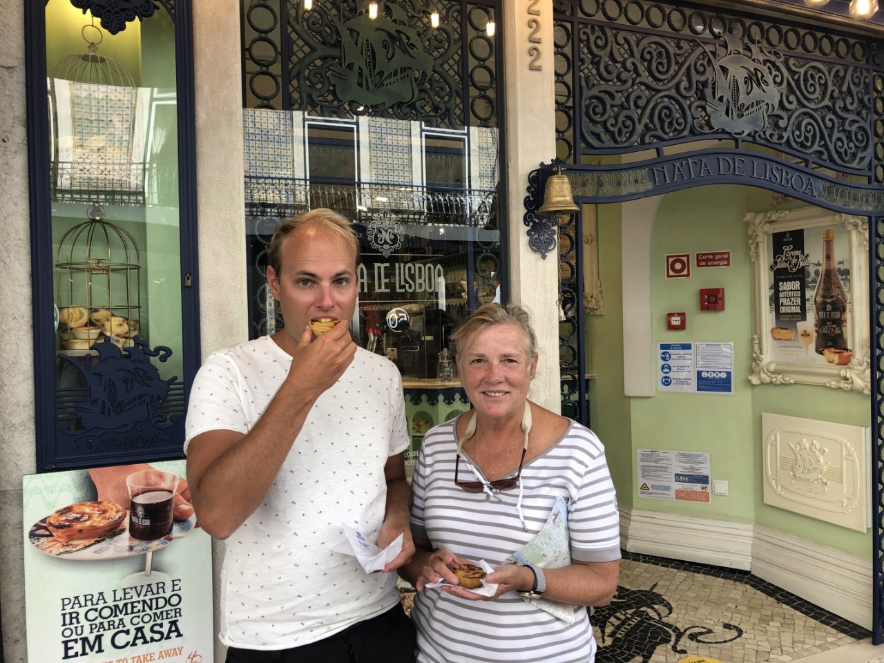 In 22 minuten stonden we in Lissabon. In de trein hadden we wat lopen zoeken naar wandelroutes en alle hoogtepunten. Met de kaart in de hand gingen we eerst naar de triomfpoort, Arco da Rua Augusta, die gelegen was aan een heel groot plein. Toen we onder de poort door liepen, kwamen we in een brede winkelstraat de Rua Augusta. Tijd voor onze eerste Pastéis de Nata bij Manteigaria, een taartenfabriekje, waar ze de lekkerste Nata’s hebben. Toen we iets verder liepen kwamen we langs Nata de Lisboa en ook die hebben de lekkerste Nata’s en hebben we ook maar even geproefd. In een straatje zagen we ineens een oude hoge ijzeren liftschacht, beetje Eifeltorenachtig, de Santa Justalift, die stond ook op Marianne’s verlanglijstje. Toen we boven op die berg waren, zijn we weer afgedaald naar het beginpunt van Tram 28 die ons rondreed door de smalle steile straatjes van Lissabon. We dachten dat het een rondrit zou zijn, maar we werden bij een parkje eruit gezet. In dat parkje hebben we een beetje gekeken, wat we nog willen zien.