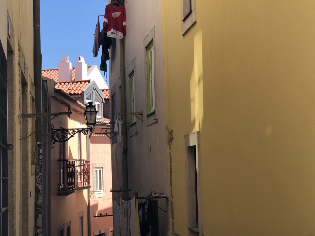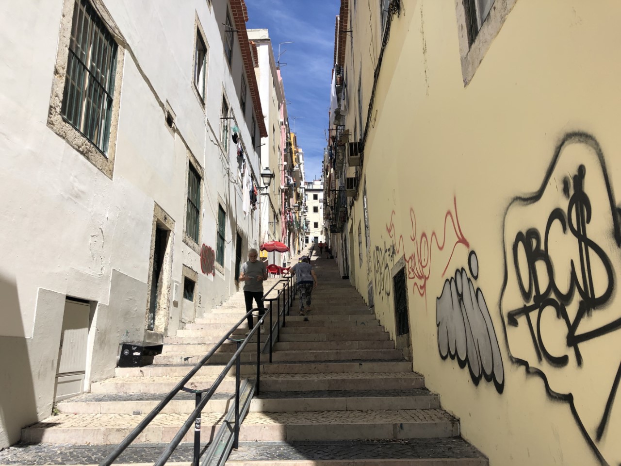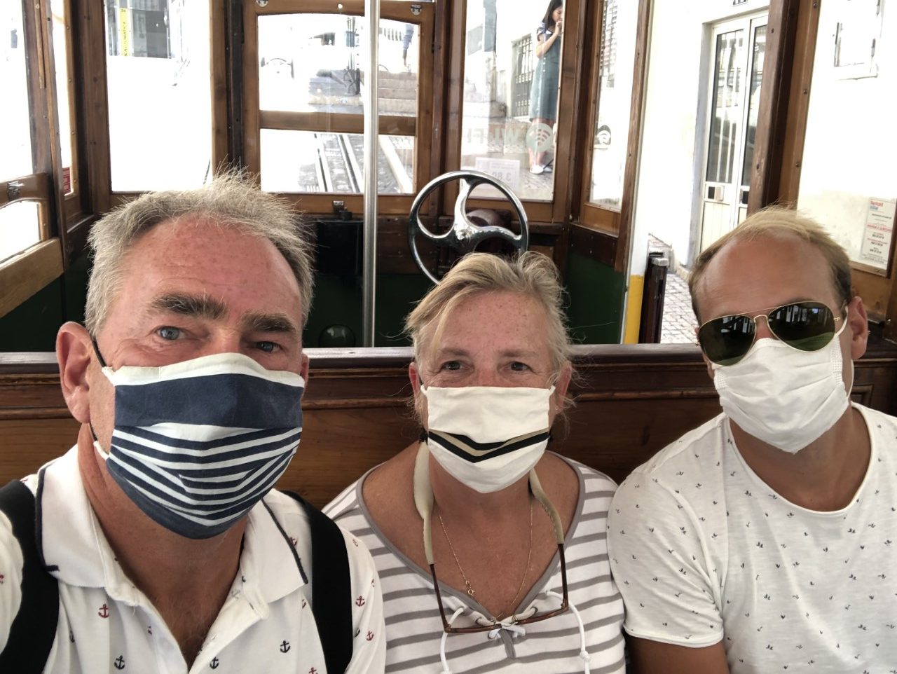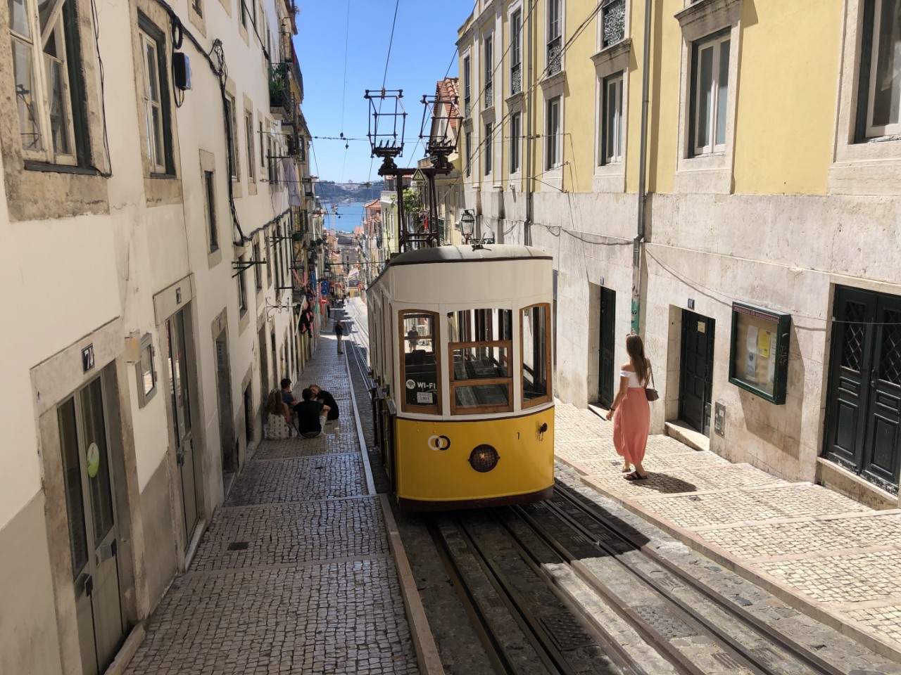 In ieder geval willen we met de gele tram mee naar beneden door een heel steil smal straatje. Eenmaal beneden waren we vlak bij het treinstation. We zijn toen een stuk langs de Taag gelopen en met bewondering gekeken naar de zeilbootjes, die tegen de sterke stroming in probeerden te varen. We gingen deels met tram 28 richting Kasteel, Castelo de São Jorge, wat hoog op een berg gelegen was, daar hadden we een paar mooie uitzichtpunten. Door de oude Fadowijk hebben we wat rondgezworven en daar kwamen langs de beste Pastéis de Nata bekroond met de Prémio 1 Award van 2019, die moesten natuurlijk ook geprobeerd worden, samen met een pastéis de bacalhao en een lekker glas versgeperst sinaasappelsap.