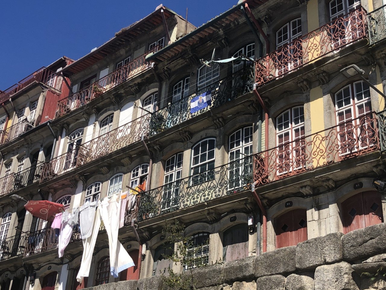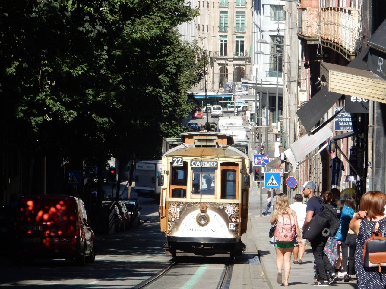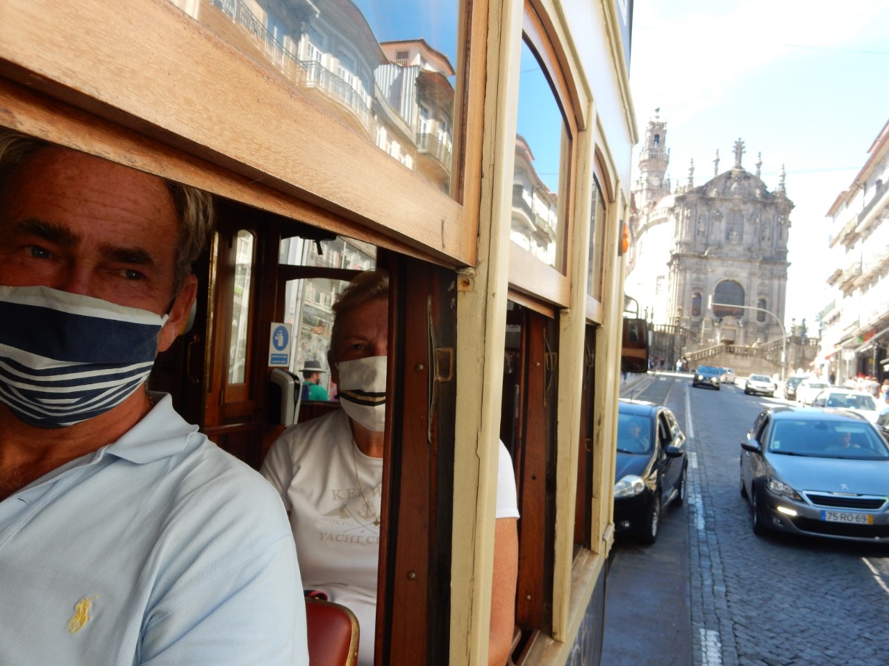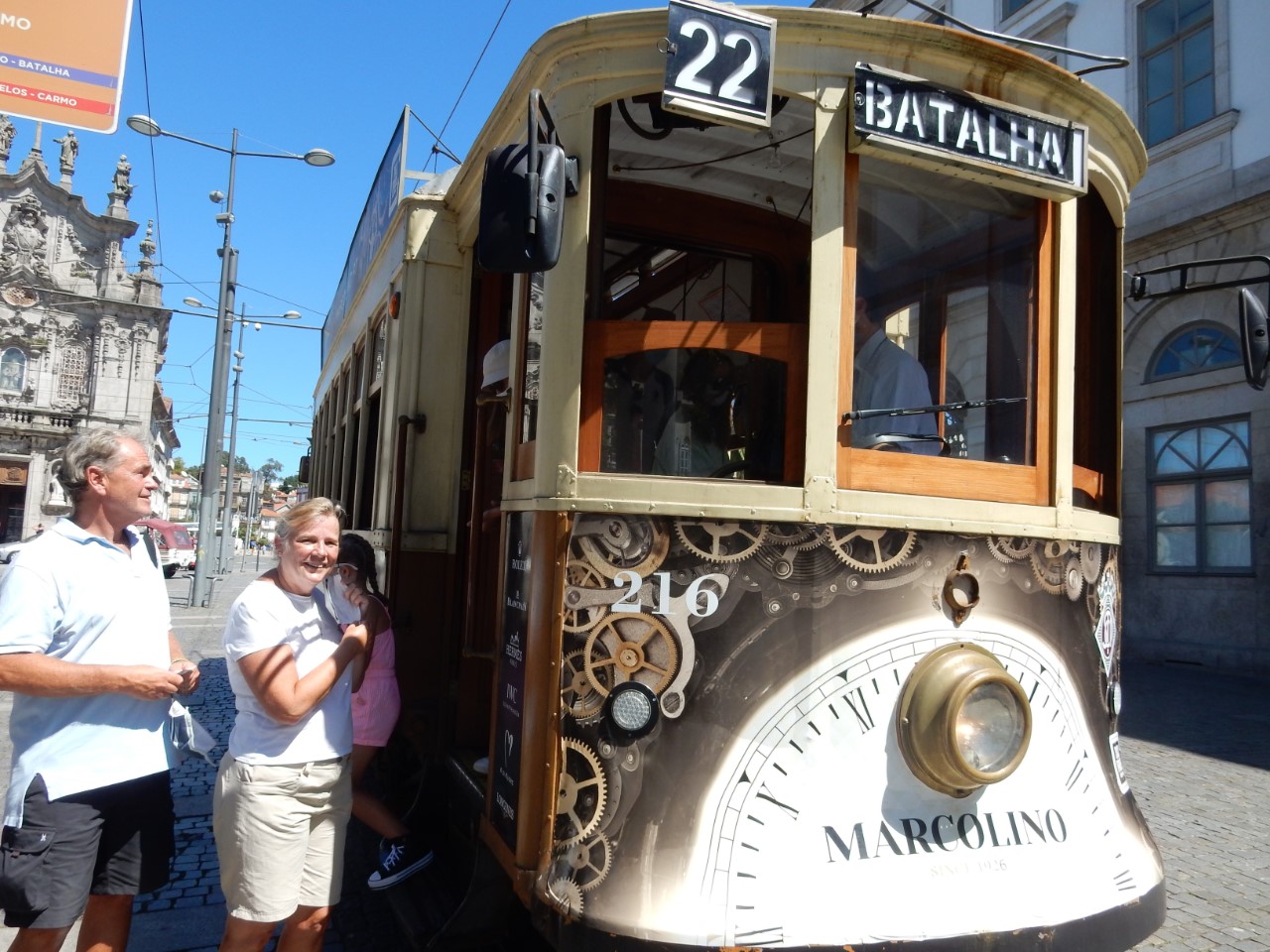 Via een winkelpromenade, pleinen, monumenten en gebouwen met architectuur kwamen we aan bij het station, waar mooie grote tegelwanden de stationshal verfraaien. We bezochten kerken en zagen street art en ook moderne kunst. We hebben een steile klim gemaakt naar het oude historische centrum met z’n supersmalle straatjes en lange trappen, waar ook nog de was hangt te drogen. Bij de laatste lange trap gelukkig weer naar beneden stonden we op de levendige kade van de snel stromende rivier, de Douro, met z’n mooie ijzeren boogbrug ontworpen door een leerling van Eifel. Er waren veel terrasjes en goede straatmuzikanten. We hadden lang genoeg gelopen en stapten in het oude trammetje, de lijn 22, die een rondje door de stad maakte. Er waren allemaal leuke oude details in de tram, mooie houten afwerking, een lange koord naar de bestuurder voor de stopbel en door een mooie constructie van de zitstoel rij je altijd voorwaarts.