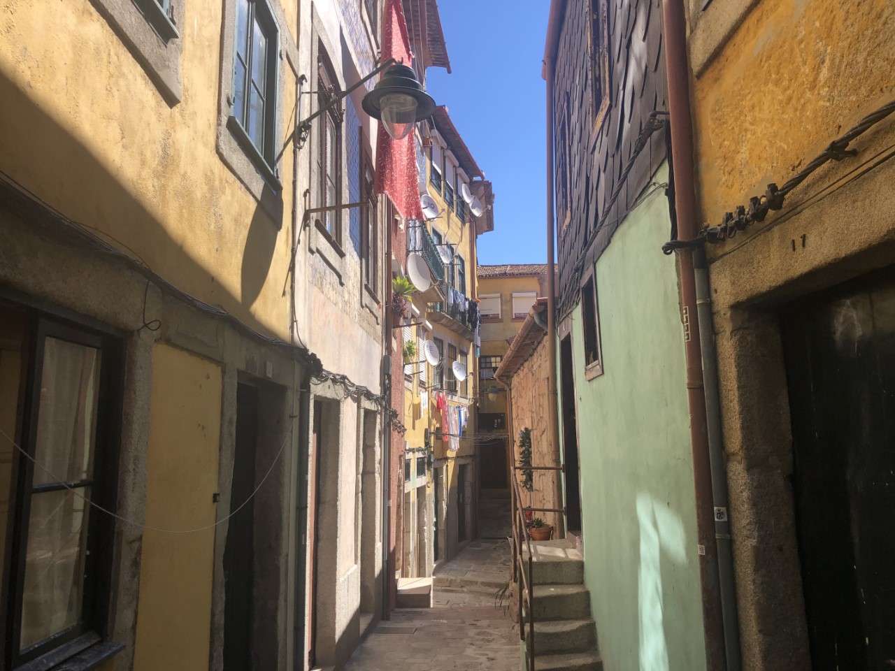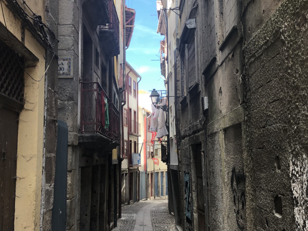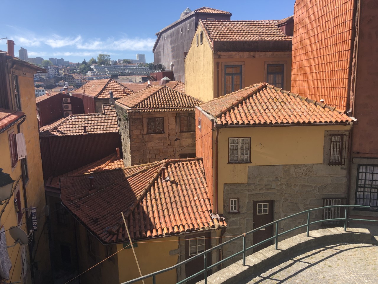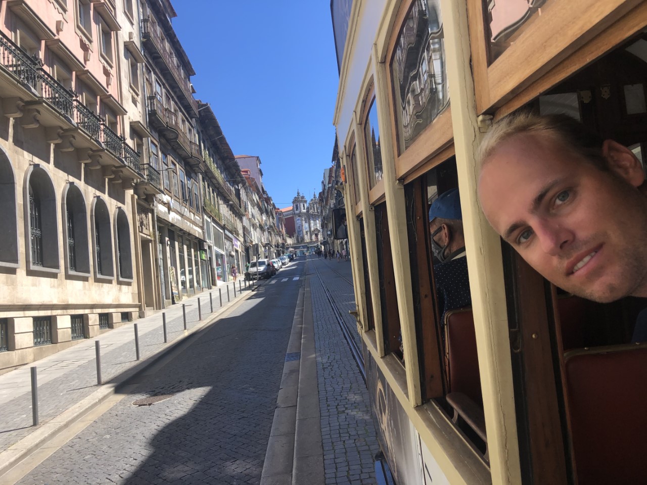 Via een winkelpromenade, pleinen, monumenten en gebouwen met architectuur kwamen we aan bij het station, waar mooie grote tegelwanden de stationshal verfraaien. We bezochten kerken en zagen street art en ook moderne kunst. We hebben een steile klim gemaakt naar het oude historische centrum met z’n supersmalle straatjes en lange trappen, waar ook nog de was hangt te drogen. Bij de laatste lange trap gelukkig weer naar beneden stonden we op de levendige kade van de snel stromende rivier, de Douro, met z’n mooie ijzeren boogbrug ontworpen door een leerling van Eifel. Er waren veel terrasjes en goede straatmuzikanten. We hadden lang genoeg gelopen en stapten in het oude trammetje, de lijn 22, die een rondje door de stad maakte. Er waren allemaal leuke oude details in de tram, mooie houten afwerking, een lange koord naar de bestuurder voor de stopbel en door een mooie constructie van de zitstoel rij je altijd voorwaarts.