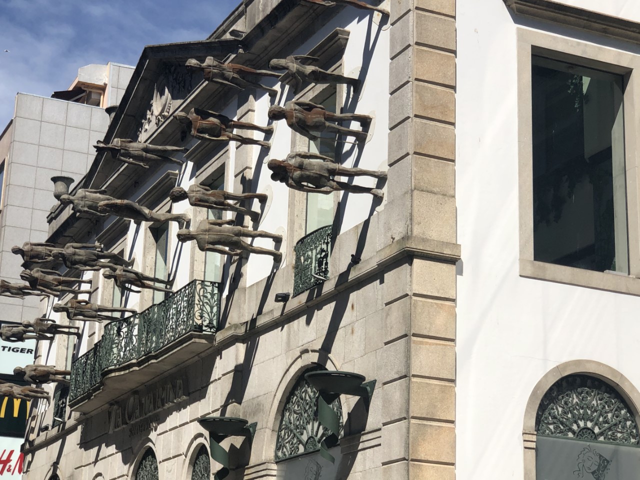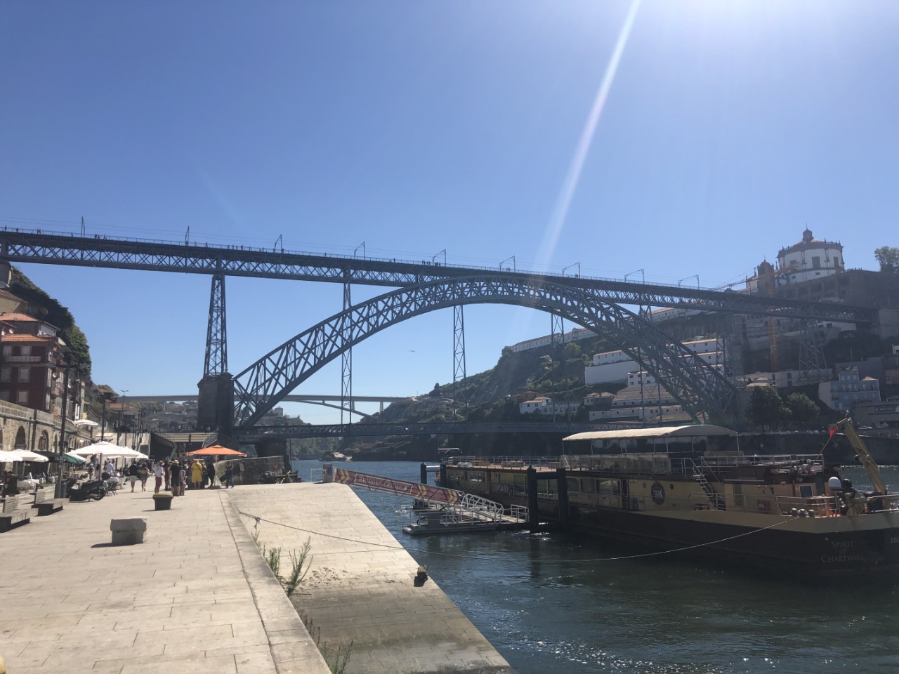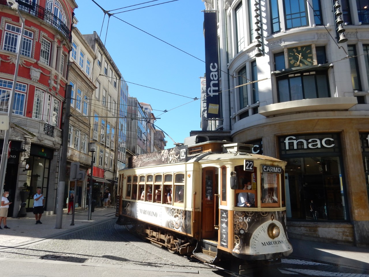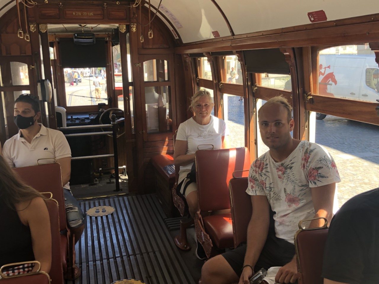 Via een winkelpromenade, pleinen, monumenten en gebouwen met architectuur kwamen we aan bij het station, waar mooie grote tegelwanden de stationshal verfraaien. We bezochten kerken en zagen street art en ook moderne kunst. We hebben een steile klim gemaakt naar het oude historische centrum met z’n supersmalle straatjes en lange trappen, waar ook nog de was hangt te drogen. Bij de laatste lange trap gelukkig weer naar beneden stonden we op de levendige kade van de snel stromende rivier, de Douro, met z’n mooie ijzeren boogbrug ontworpen door een leerling van Eifel. Er waren veel terrasjes en goede straatmuzikanten. We hadden lang genoeg gelopen en stapten in het oude trammetje, de lijn 22, die een rondje door de stad maakte. Er waren allemaal leuke oude details in de tram, mooie houten afwerking, een lange koord naar de bestuurder voor de stopbel en door een mooie constructie van de zitstoel rij je altijd voorwaarts.