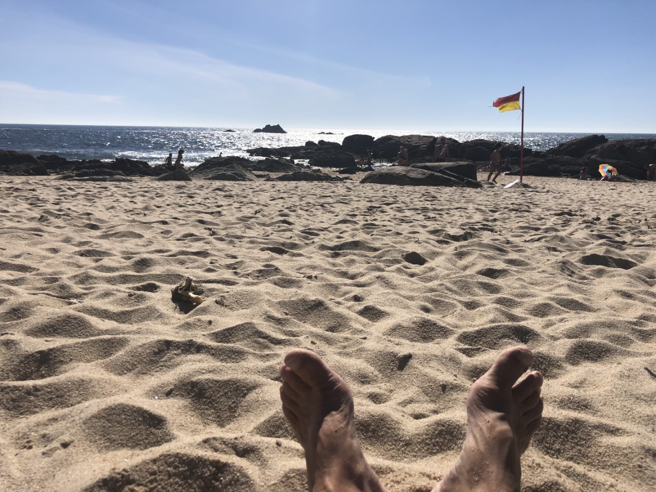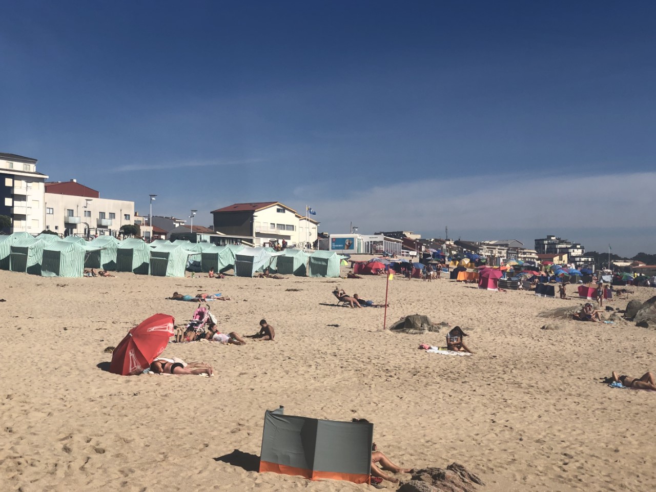 We hadden gisteren al gekeken op het Noorderstrand. Daar stonden allemaal tentjes in lange rijen haaks op de zee. We denken dat ze zo staan vanwege de wind. Langs de Portugese kust steekt er in de middag een flinke wind op van uit het noorden, die noemen ze hier de Nortada. Wij gingen vandaag naar het Zuiderstrand vlak naast onze haven. Daar was het heel erg druk en bijna iedereen had z’n plekje afgebakend met lage windschermpjes. Maar wij wilden ook een ruime zonneplek hebben en wat denk je? Er stonden tussen al die windschermpjes, tien rijen van die tentjes en voor die tentjes en de zee lag niemand. Of dat niet mocht, wij weten het niet, maar wij hadden alle ruimte.