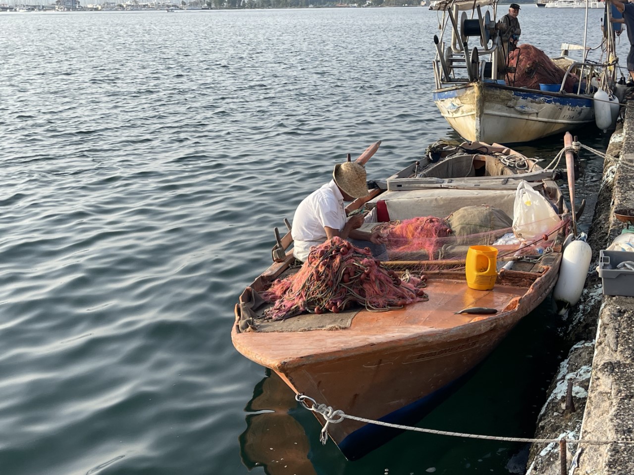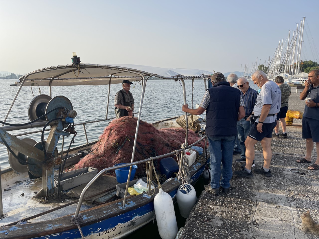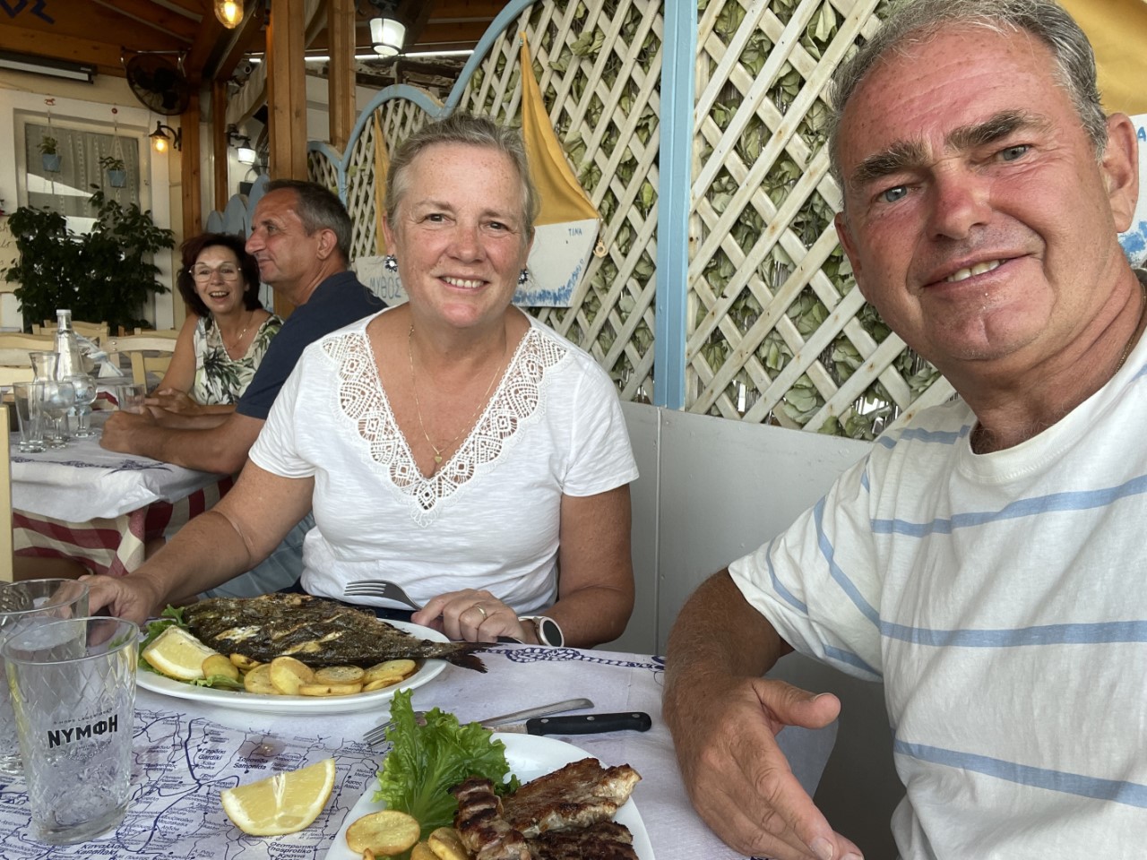 De rest van de middag zitten we onderuit in het kuipje met de waterslang en plantenspuit als verkoeling. Vroeg in de avond zijn we naar Mythos gegaan, het restaurantje dat we uiteindelijk hebben uitgekozen. Het is op de stadskade en vanuit onze kuip kunnen we zien wanneer het terras een beetje volloopt. Marianne bestelt een gegrilde dorade en ik bestel de BBQ mix grill samen met een lekkere Griekse salade en als dessert Griekse yoghurt met honing en walnoten.