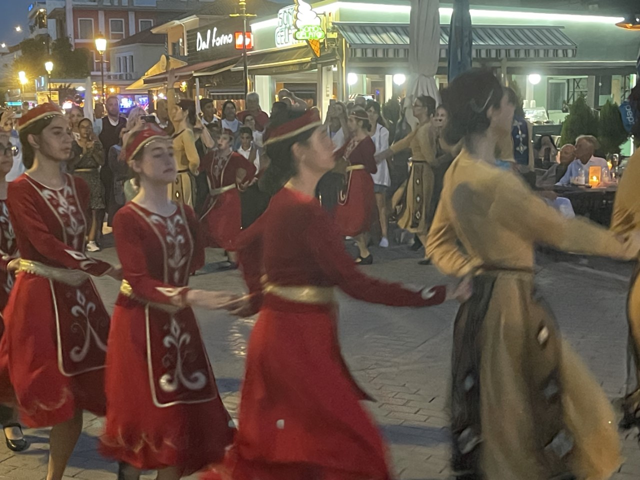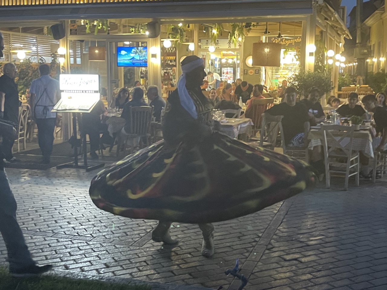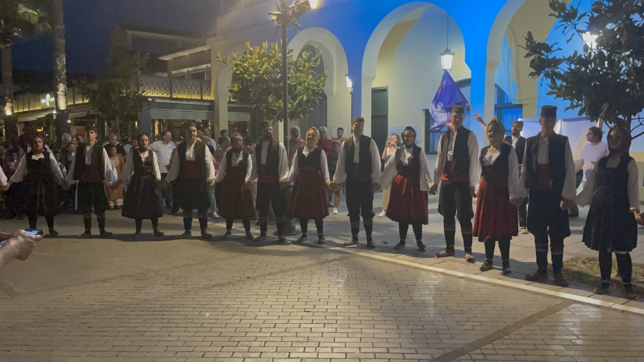 Het culturele dansfestival, waar we gisteren naar hebben lopen zoeken, loopt dansend langs de Just. Wij gaan de stoet achterna, die veelvuldig halt houdt om een dansje uit te voeren. Gezellig en leuk om mee te maken. Bij het eindpunt is een podium met stoeltjes. We denken dat daar nog meer optredens te zien zullen zijn, maar dat valt tegen. Er zijn een hoop toespraken in het Grieks en gebrekkig Engels. We hebben het een tijdje aangehoord, maar dan hebben we het wel gezien en zijn terug gewandeld naar de Just.