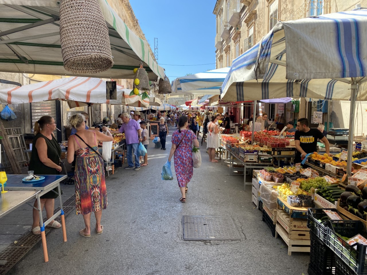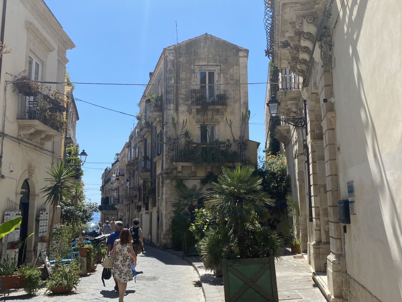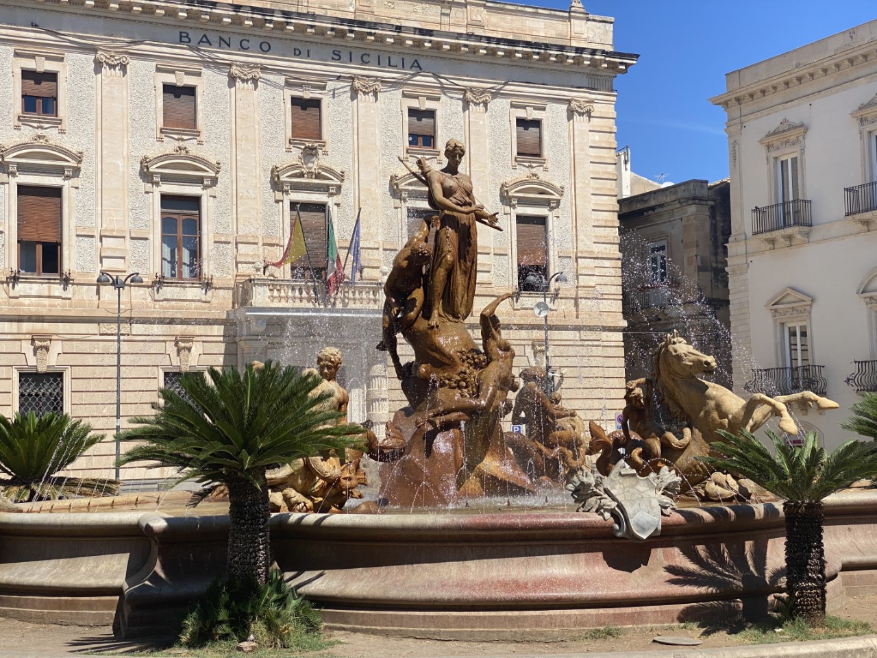 Wij gaan langzaam aan naar ons eigen Superjacht, want we willen nog wat van Siracusa zien. Als eerste wandelen we naar de markt, vervolgens naar de Diana Fontein. Via de Joodse Giudecca wijk met z’n hele smalle straatjes komen we bij een uitzichtpunt over de zee. Iets verder is nog een Arethusa fontein/bron met wat vissen en papyrusplanten, waar een bijzonder Grieks mythisch verhaal over is. Vandaaruit lopen we de boulevard op, waar ons Superjacht aangemeerd ligt. Het is weer warm en we creëren een schaduwplekje met een groot laken, tijd om te relaxen. Dacht ik. Marianne gaat de maandadministratie doen en ik mag achter het fornuis in die hitte. Van Daniel krijgen we veel filmpjes vanuit Zandvoort van de Formule 1 vrije trainingen.
