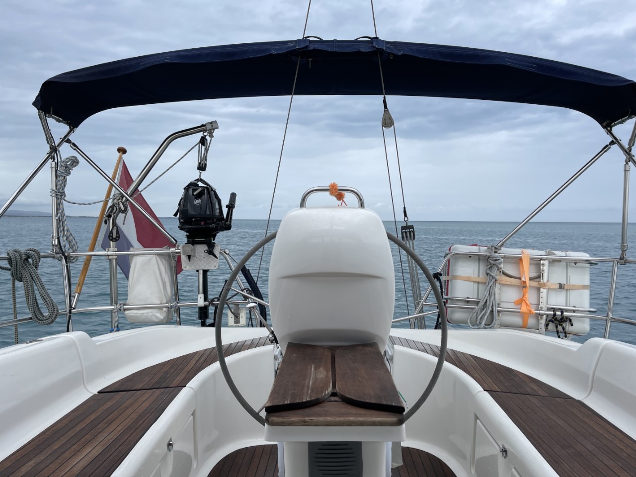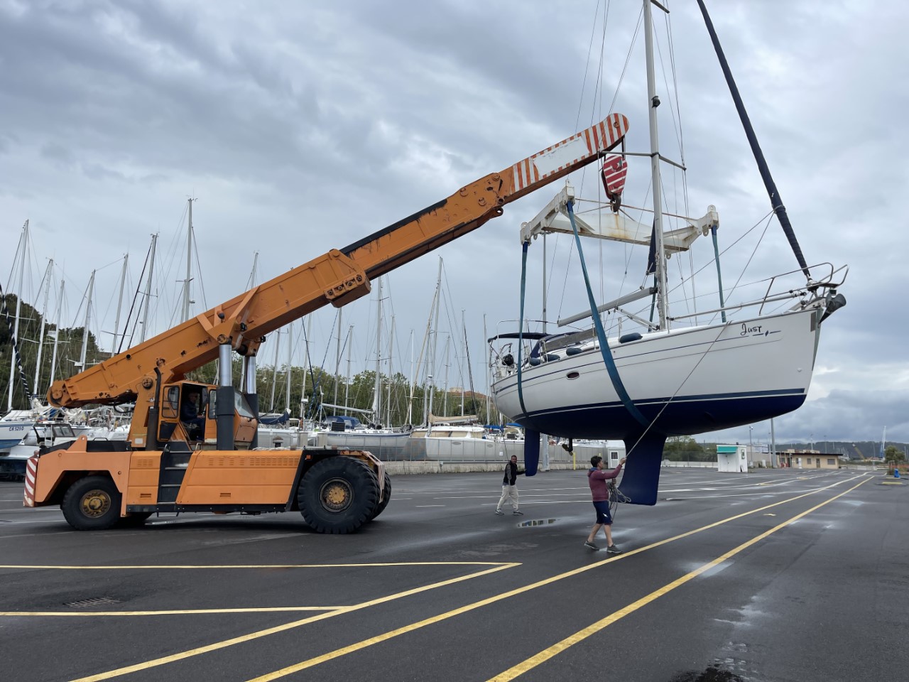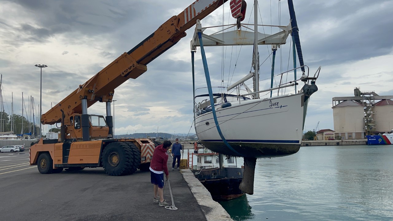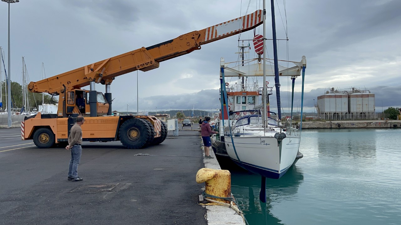 Dag drie. Toch nog even vroeg naar de Just om de watertanks te vullen en de jerrycans met diesel en benzine. We zijn er klaar voor. Nog even een ontbijtje bij de B&B en we halen een paar verse broodjes bij de Carrefour. We zijn benieuwd of het weer een Italiaans uurtje wordt dat de Just in de takels hangt. Gelukkig, slechts een half uurtje later dan afgesproken drijven we weer.