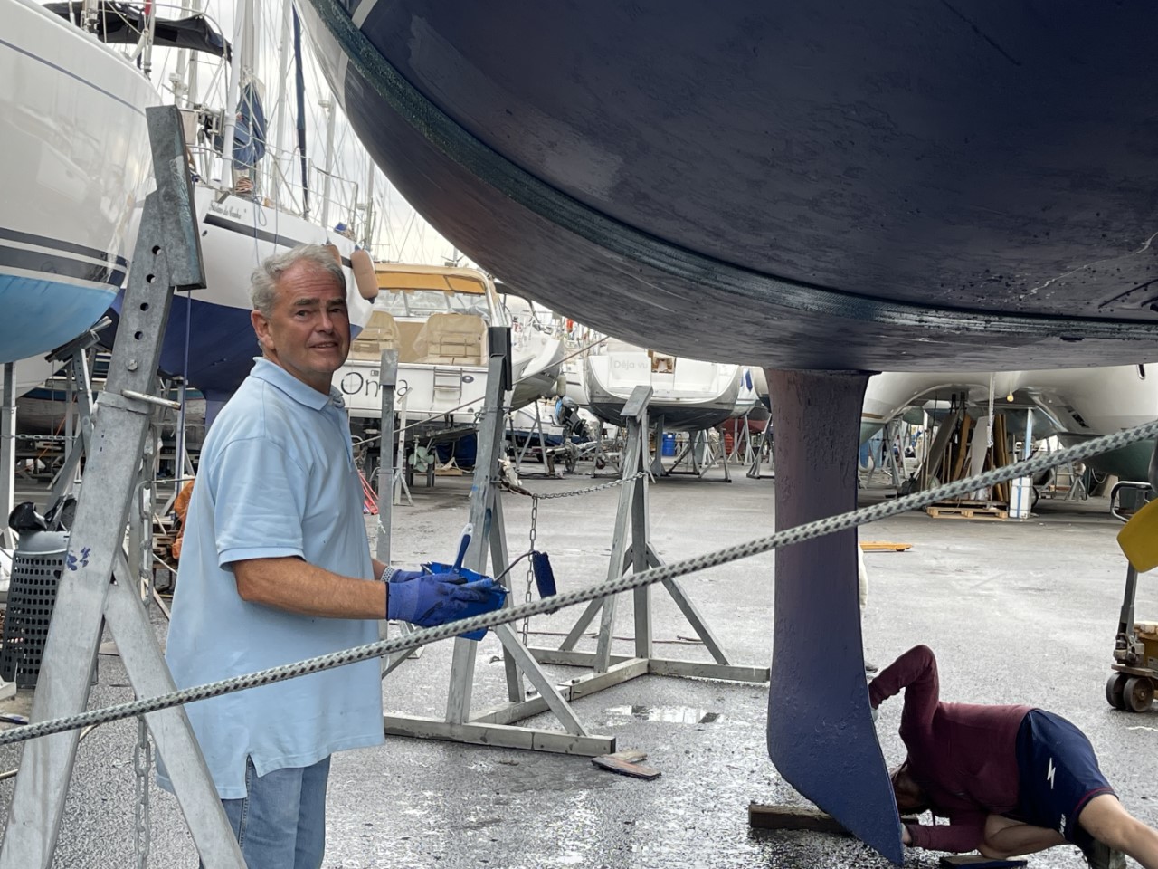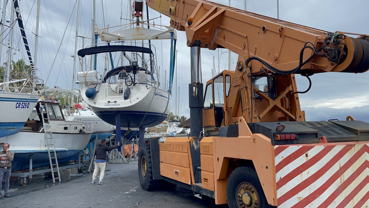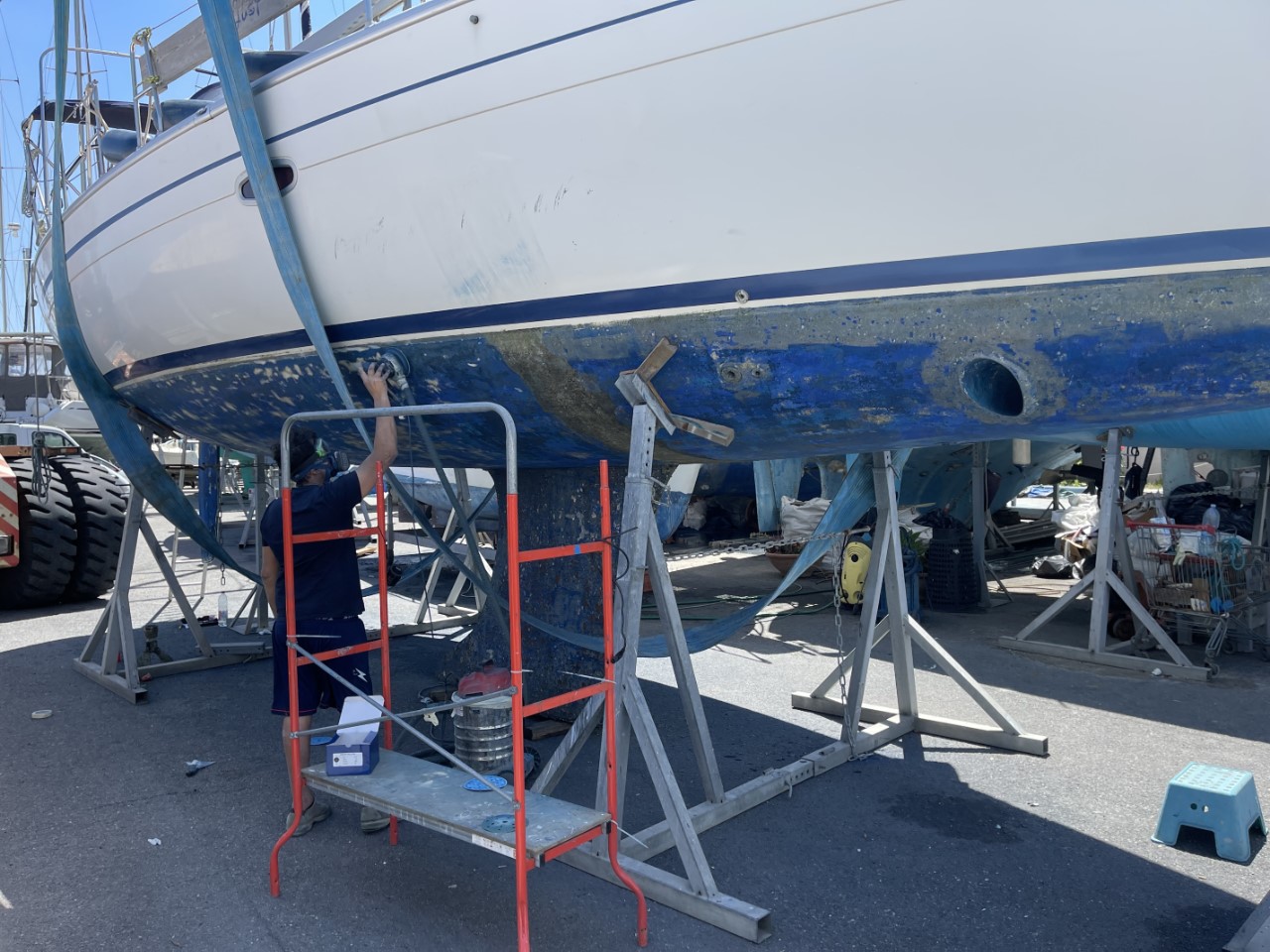 Dag één, gisteren stelde Elio (de werfcapo) voor, om tegen een redelijke prijs heel het onderwaterschip te schuren. Graag natuurlijk en ze beginnen er al mee, als ik om 07:30 uur kom aanwandelen. Ik begin met het demonteren van de Gori klapschroef. Die klapt niet meer, doordat we vorig jaar voor de kust van Corsica een aanvaring hadden met een grote ton onder het wateroppervlak. Tegen 14:00 uur zijn de schuurwerkzaamheden klaar en kan ik de waterlijn afplakken en beginnen met de eerste laag antifouling. Rond 20:00 uur is de klus geklaard en gaan we naar een kebabrestaurantje. Terug in onze B&B vallen m’n oogjes snel dicht.