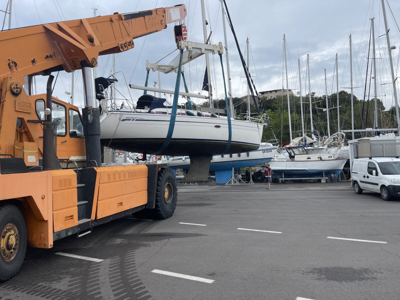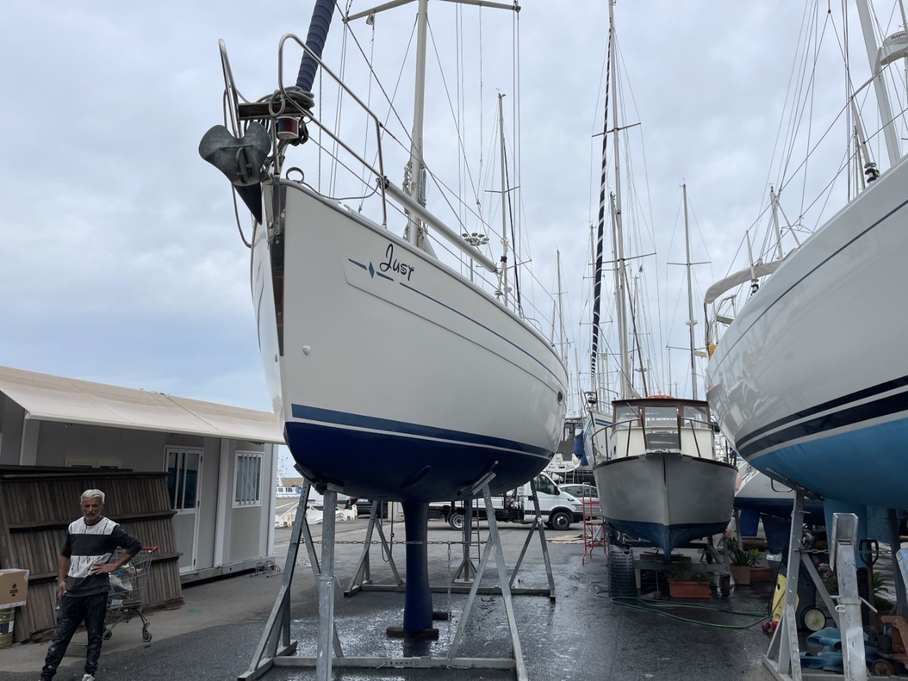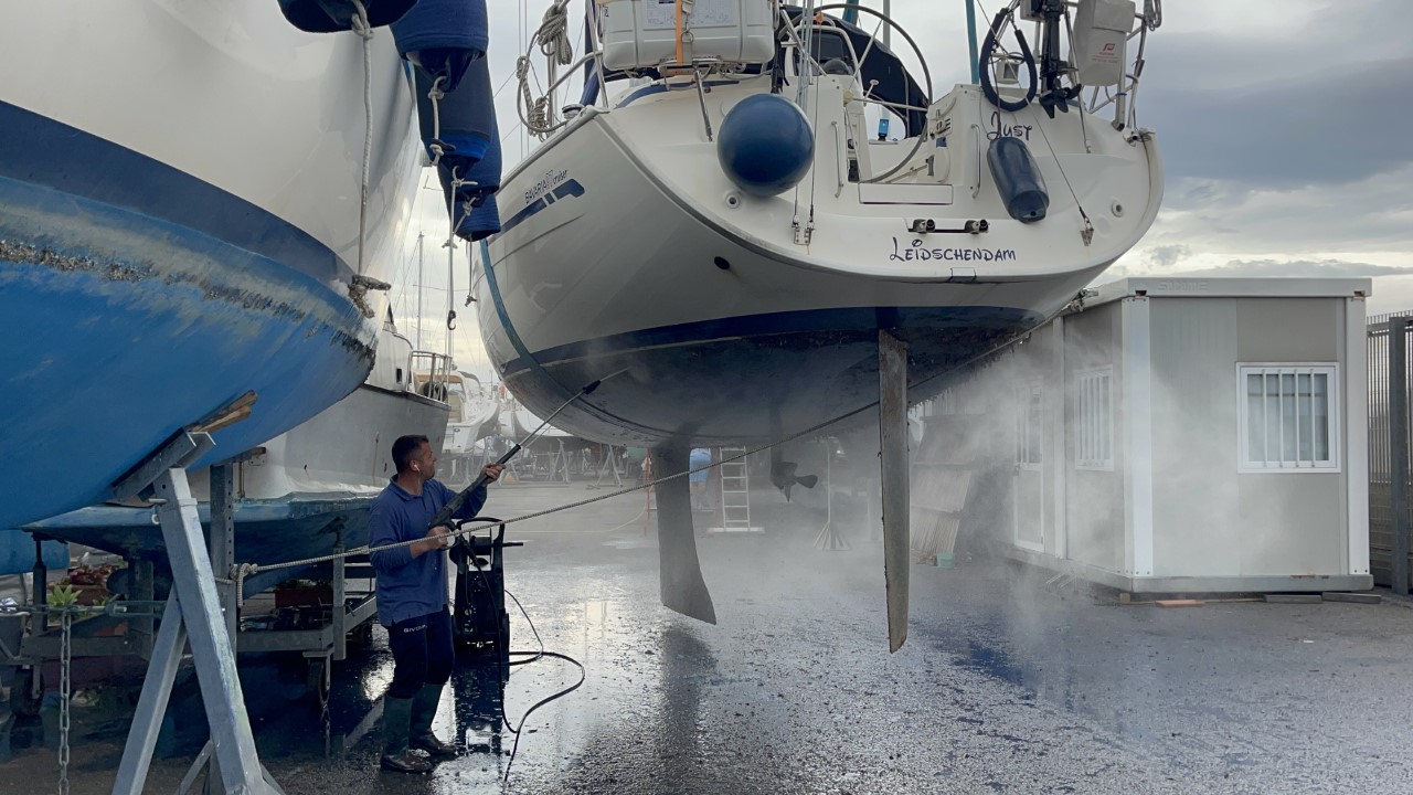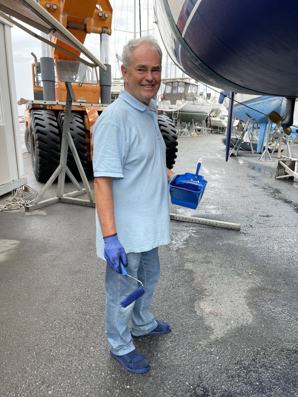 Dag één, gisteren stelde Elio (de werfcapo) voor, om tegen een redelijke prijs heel het onderwaterschip te schuren. Graag natuurlijk en ze beginnen er al mee, als ik om 07:30 uur kom aanwandelen. Ik begin met het demonteren van de Gori klapschroef. Die klapt niet meer, doordat we vorig jaar voor de kust van Corsica een aanvaring hadden met een grote ton onder het wateroppervlak. Tegen 14:00 uur zijn de schuurwerkzaamheden klaar en kan ik de waterlijn afplakken en beginnen met de eerste laag antifouling. Rond 20:00 uur is de klus geklaard en gaan we naar een kebabrestaurantje. Terug in onze B&B vallen m’n oogjes snel dicht.
