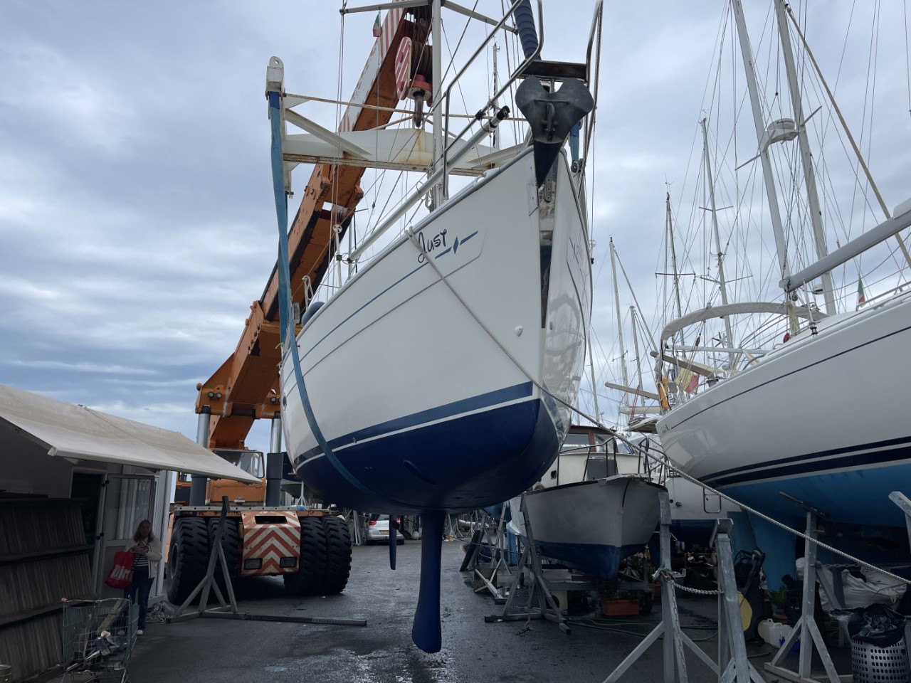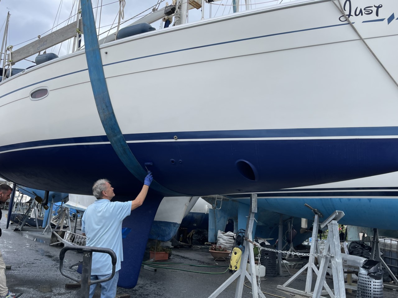 Dag twee, de tweede laag antifouling is snel gesmeerd. Marianne komt rond lunchtijd ook mij verwennen met een lekkere panini. Na de lunch vervang ik de anodes van de saildrive en de boegschroef en monteer ik een nieuwe schroef. Nog een heel klein beetje poetsen en de Just is klaar voor de tewaterlating morgenochtend.