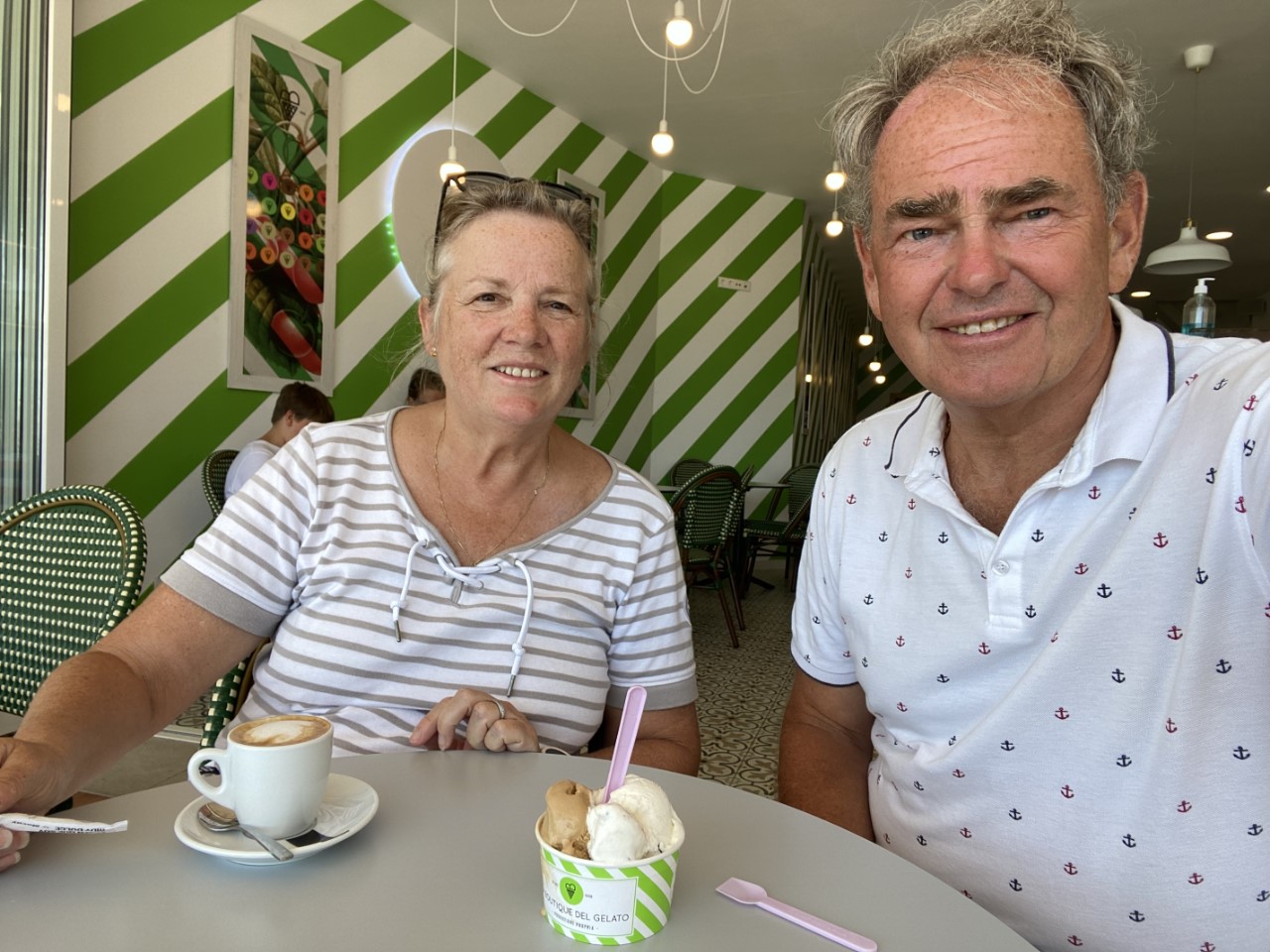 Marianne belt de haven en vraagt of we een dagje eerder ook welkom zijn. Geen probleem volgens de havenmeester. We hijsen het bijbootje op het voordek en halen het anker op. Bij het aanleggen hebben we een flinke zijwind, maar het gaat perfect. We gaan wat wandelen en strijken neer op het eerste terrasje aan de boulevard voor een bakkie en een ijsje. Bij de toeristeninformatie halen we een stadsplattegrond en daarmee hebben we wat rondgewandeld. Onze eerste indruk is, gezellig.