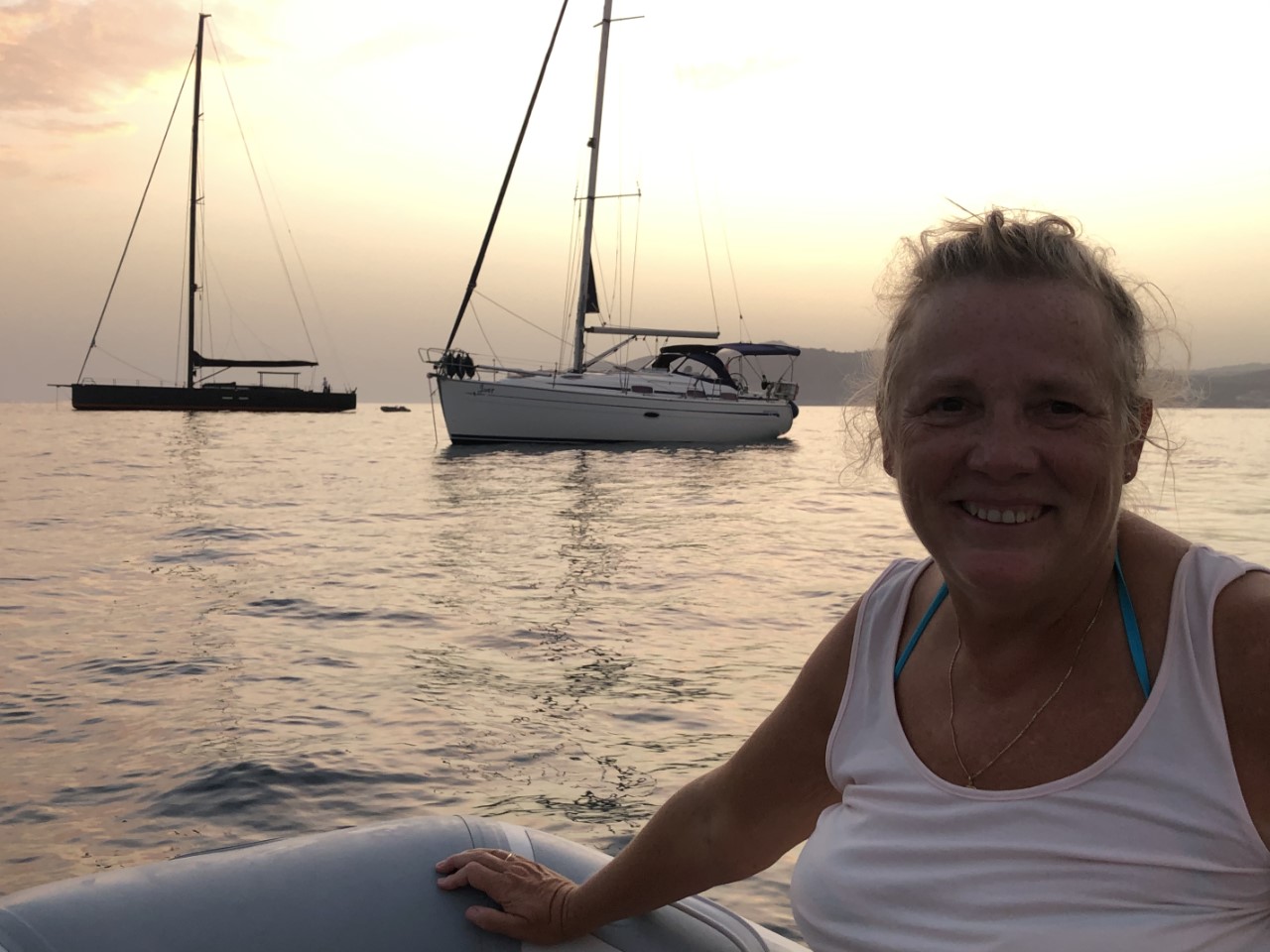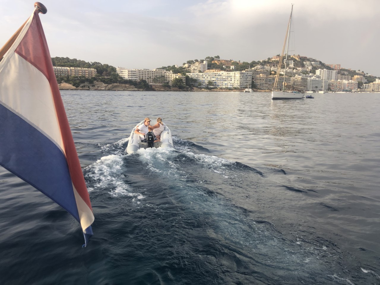 Tegen de avond zijn Marianne en Daniel met het bijbootje even het stadje gaan bezoeken. Beetje om te kijken of we hier nog een dagje blijven? Of gaan we hier alleen boodschappen halen en dan verder. We zijn er nog niet uit. Ik heb ondertussen de vlag in een sopje gezet, want die was rood, oranje, blauw. Toen ze terug kwamen, hadden ze een vers stokbroodje en een grote beker ijs meegenomen.