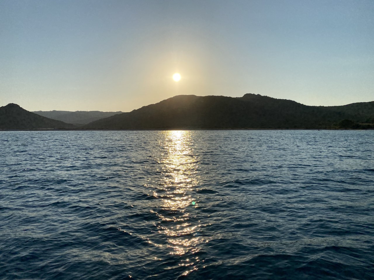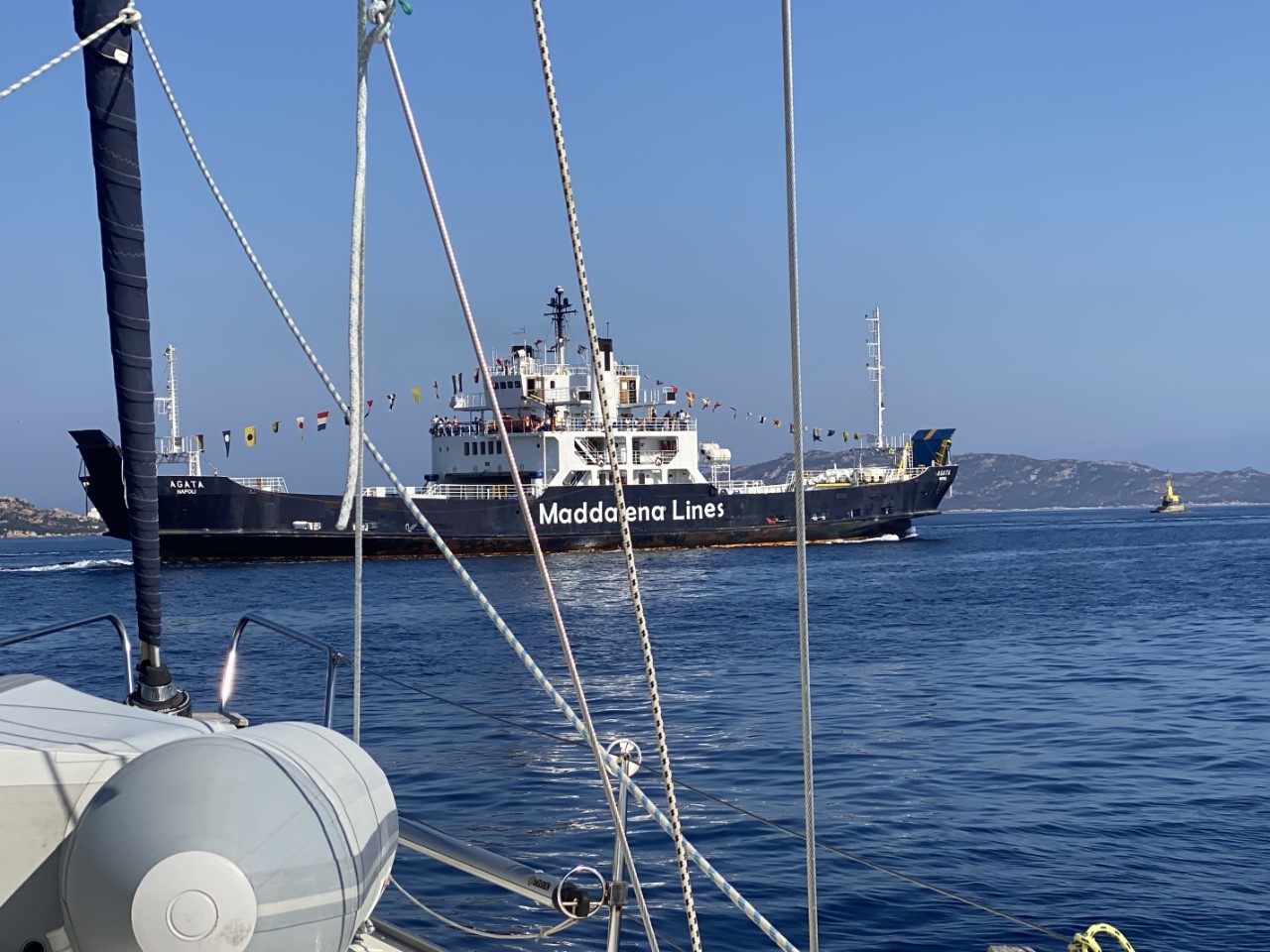 Alle duikspullen hebben we met zoetwater afgespoeld. De spullen hangen rondom in de kuip te drogen, terwijl we langzaam langs de Maddalena eilanden tuffen. We kunnen na een tijdje nog een uurtje motorzeilen.