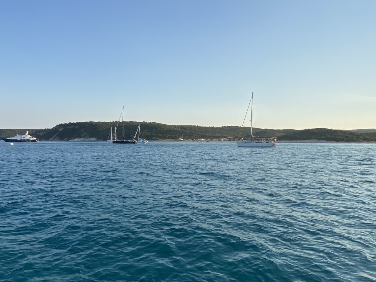 Even na het middaguur zijn we terug in Corsica. In één van de eerste baaien gooien we ons anker uit. Nu niet in de modder, maar in het zeegras. Ik zie het tijdens het controleren. Bij de tweede poging gaat het beter. We hebben een ruime zandplek en het anker ligt mooi ingegraven. De afgelopen vijf dagen hadden we heerlijk helder water, maar de bodem was groenig en zodoende het water ook. Nu hebben we weer het mooie turquoise water. We duiken er veelvuldig in voor verkoeling. Morgen blijven we nog een dagje in deze baai.