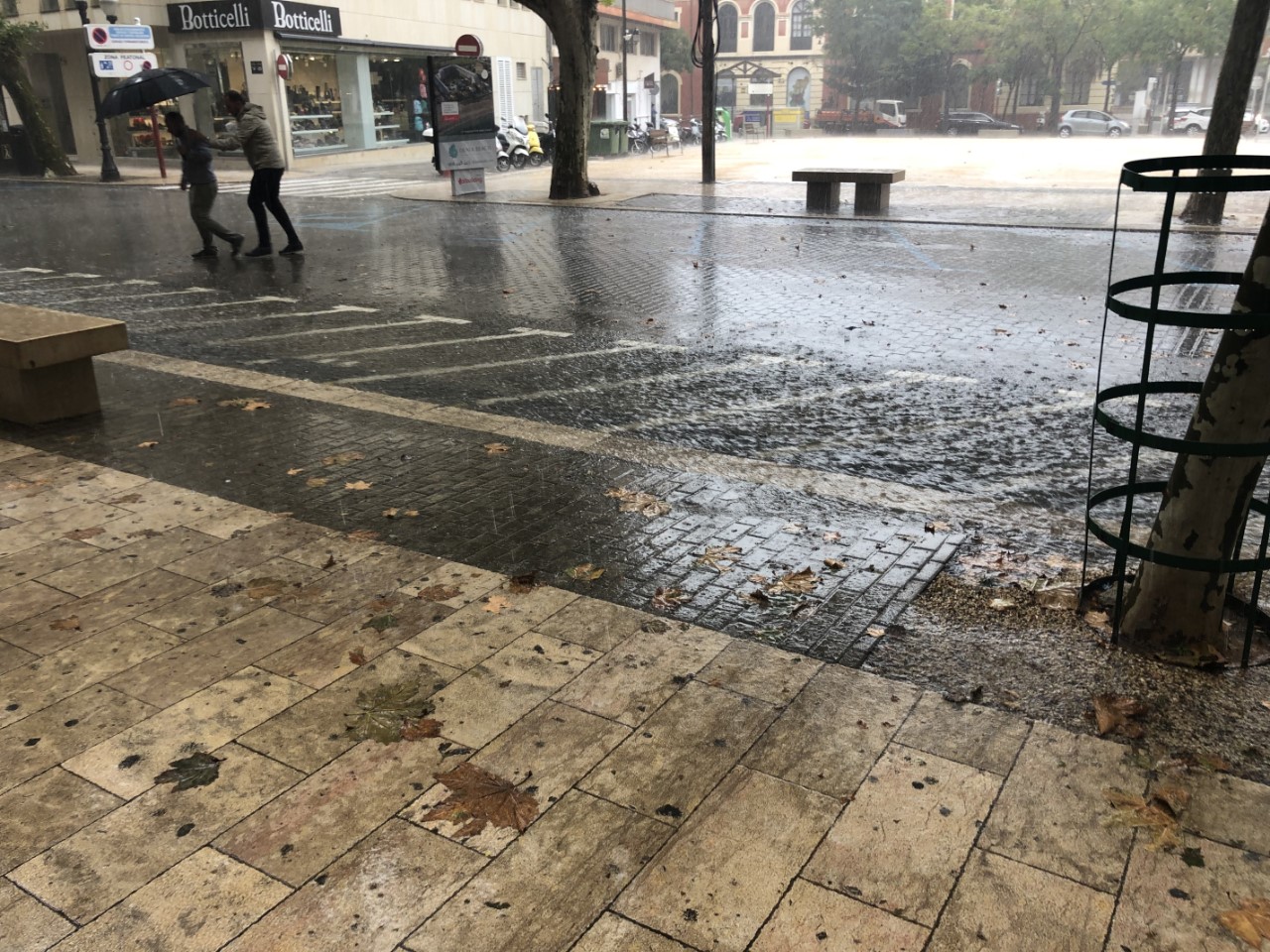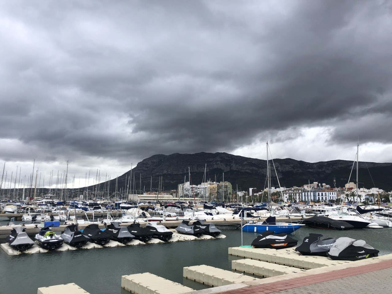 Inmiddels is het begonnen te regenen en we gaan bij een gezellig uitziend tentje binnen voor een bakkie koffie. Maar het blijft maar regenen en we duiken wat kledingwinkels in. Nog steeds neemt de regen niet af, maar wordt veel heftiger. De straten in Denia zijn veranderd in snel stromende rivieren. Soms een brede stroom van een meter, maar ook staat af en toe de gehele straat blank. Uiteindelijk zijn we toch maar naar de Just gelopen, zigzaggend door de straatjes om niet tot ver boven je enkels de rivieren over te hoeven steken. We hadden verwacht dat het nog droog zou worden, maar het wordt alleen maar erger. Uiteindelijk waden we dan ook maar tot onze enkels door het water.