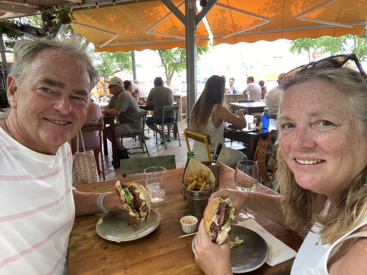 Het liep inmiddels tegen lunchtijd. Gisteren liepen we langs een gezellig uitziende ‘chiringuito’ een soort van beachclub, waar ze volgens de reviews een perfecte hamburger serveren. Daar was niks te veel van gezegd, een heerlijke goed gebakken, ruim belegde hamburger met een basket vol met lekkere patatjes. De laatste 400 meter naar de Just hebben we rollend afgelegd.