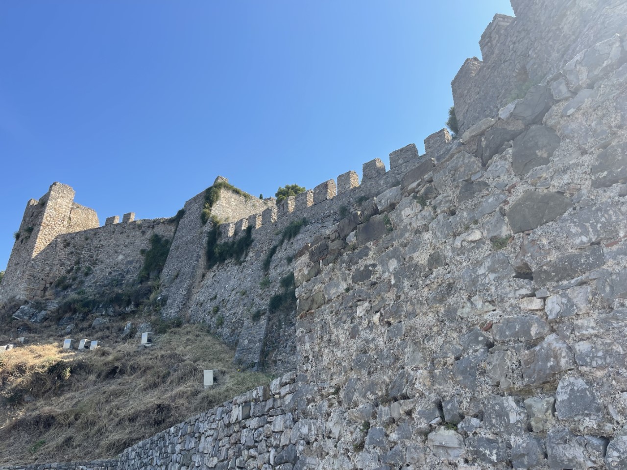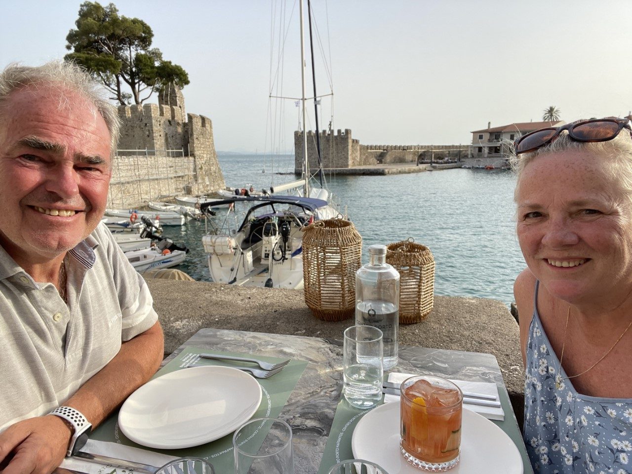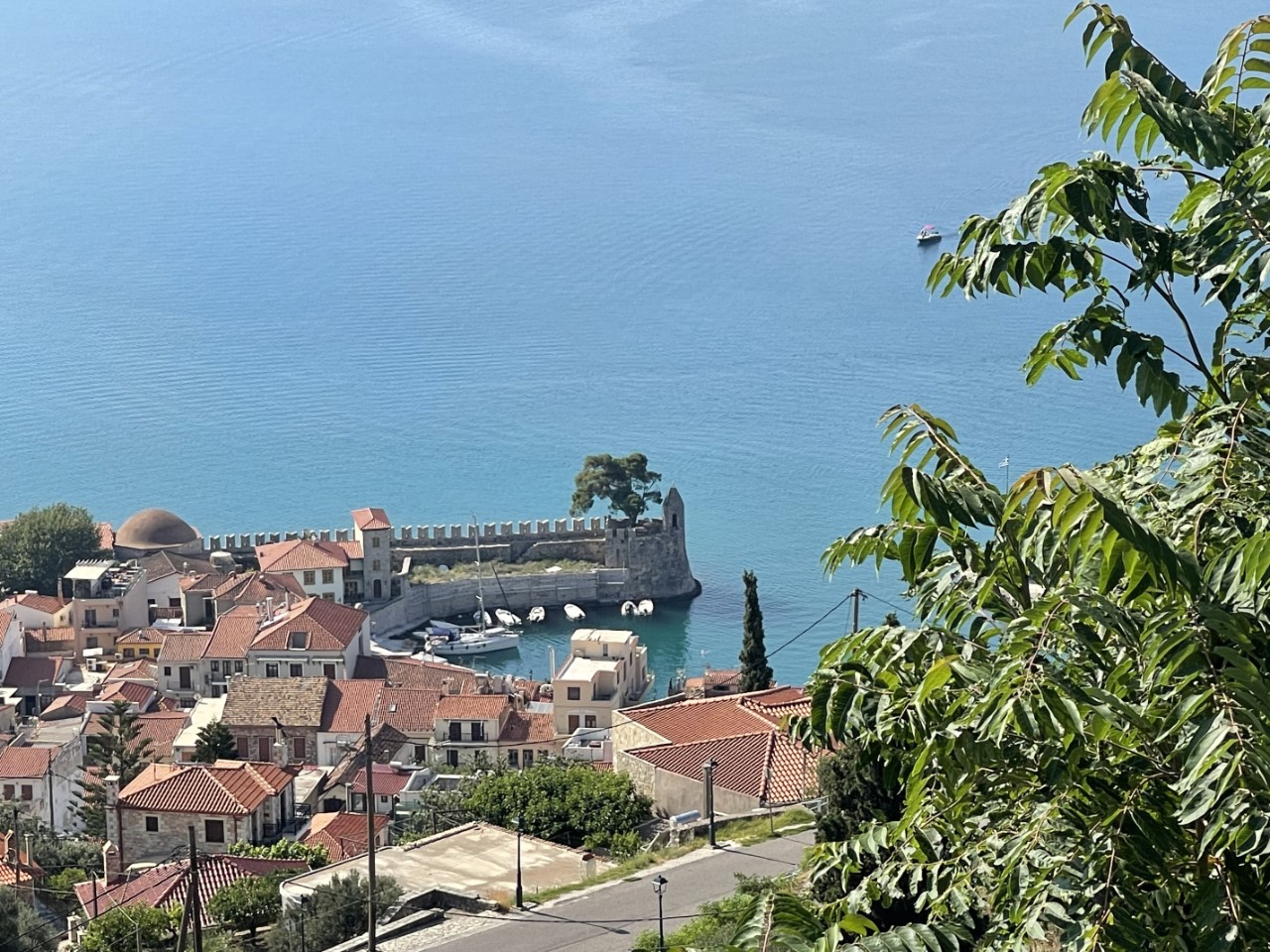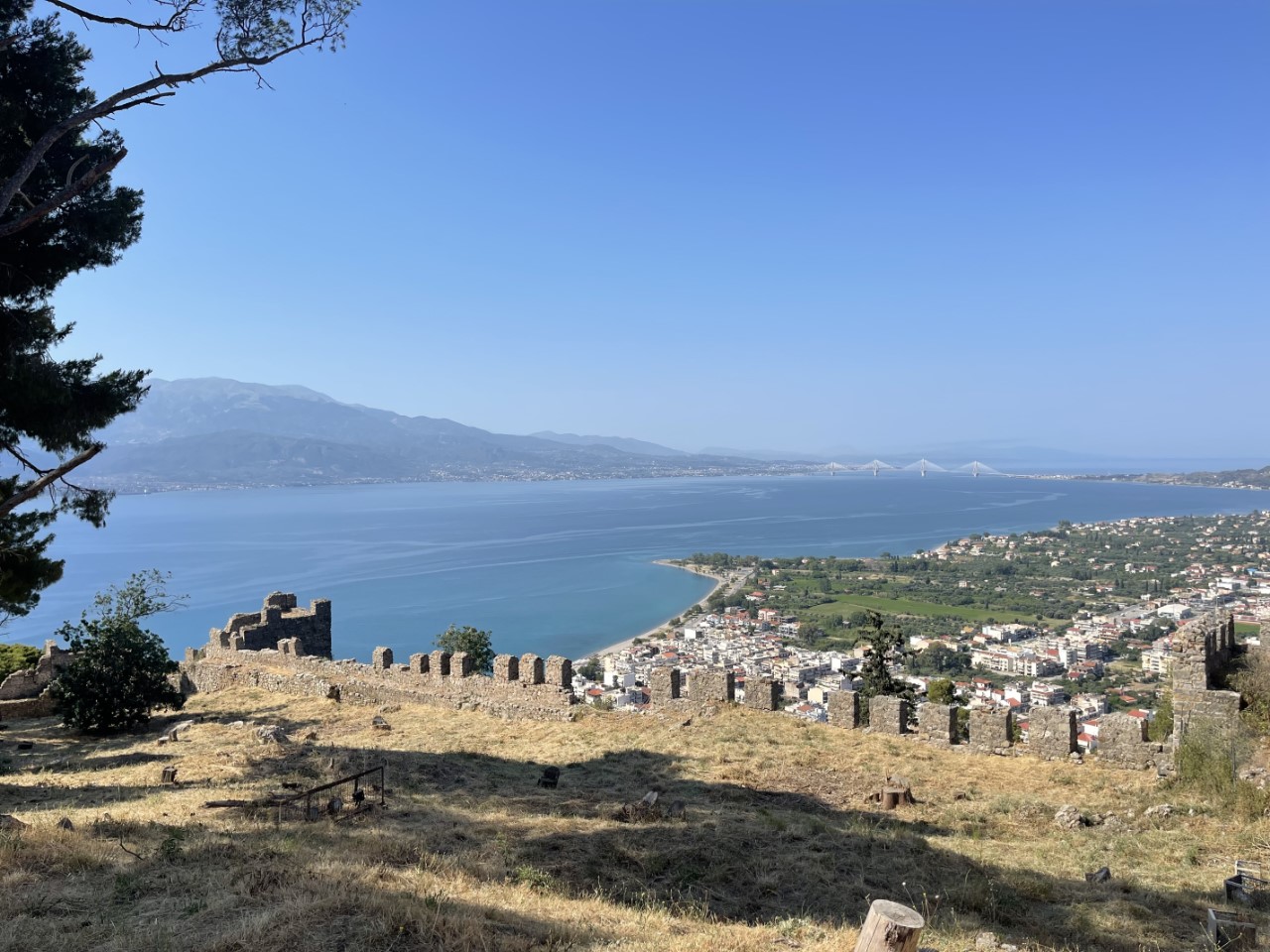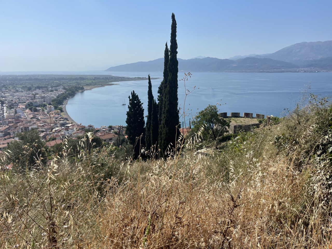 Na een flink zondags ontbijt hebben we genoeg energie om de beklimming te ondernemen naar het kasteel van Náfpaktos. We gaan zo vroeg mogelijk, want om dit in de middag te doen met ruim 35 graden, dan lopen we een appelflauwte op. Ook nu was het zwaar, heel zwaar. Er zijn veel trappen en iets te steile hellinkjes, maar we hebben het gehaald. Even uitpuffen bij het kassahokje op een bankje in de schaduw. We dachten dat we alle beklimming hadden gehad, maar ook binnen het kasteel is het nog veel klimmen, voordat we het hoogste punt bereiken.
