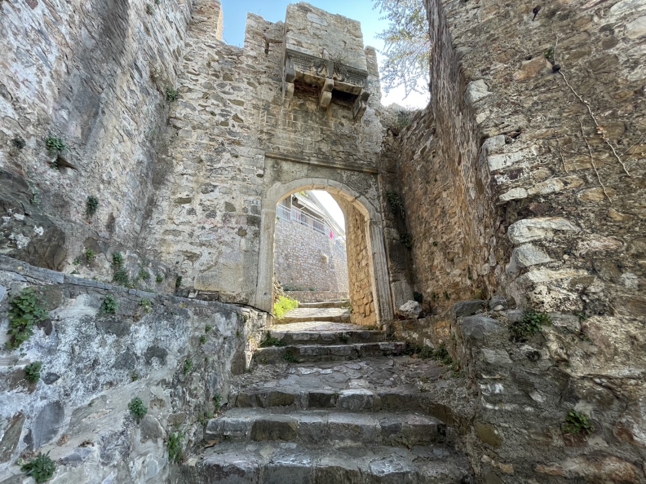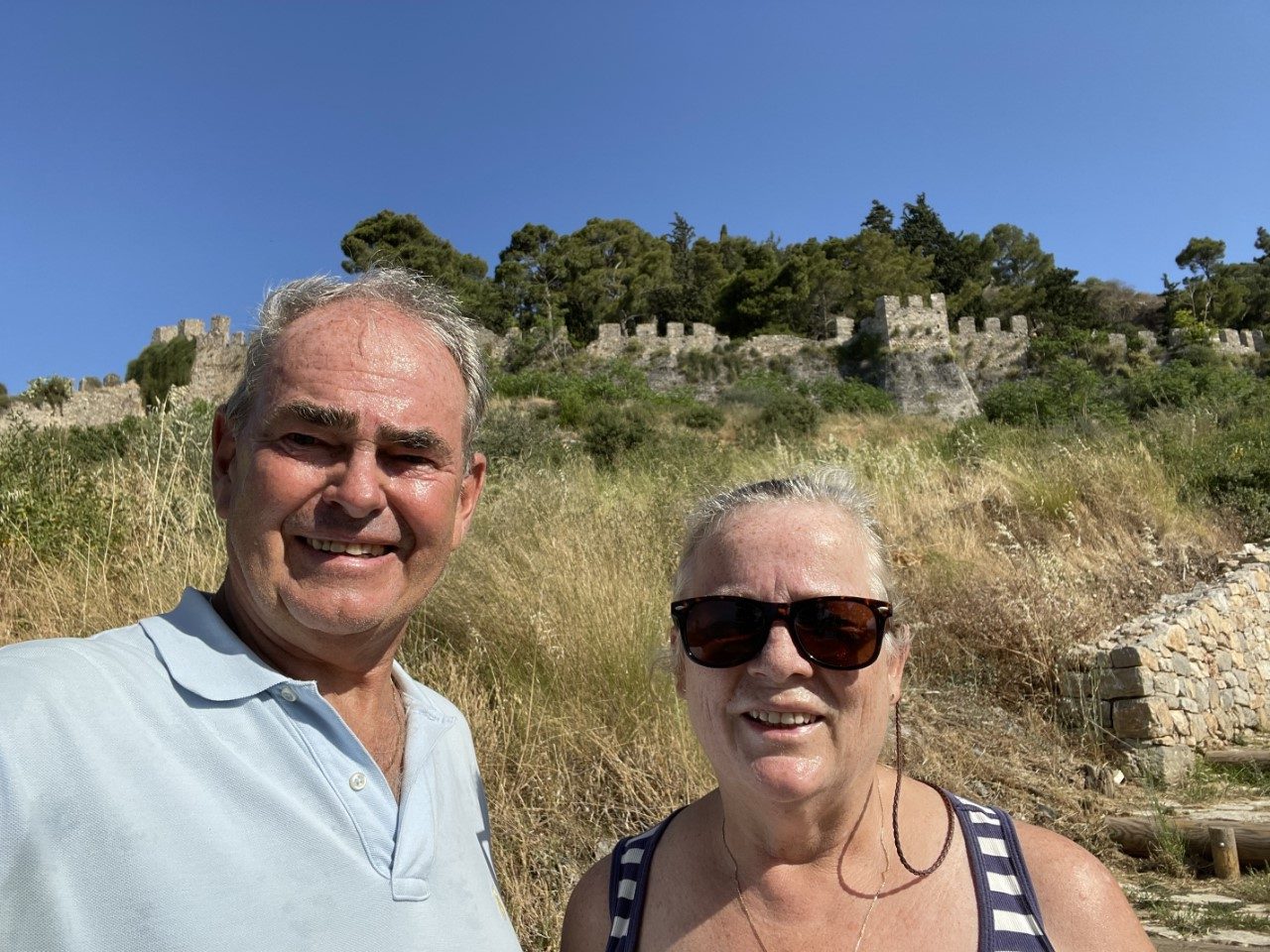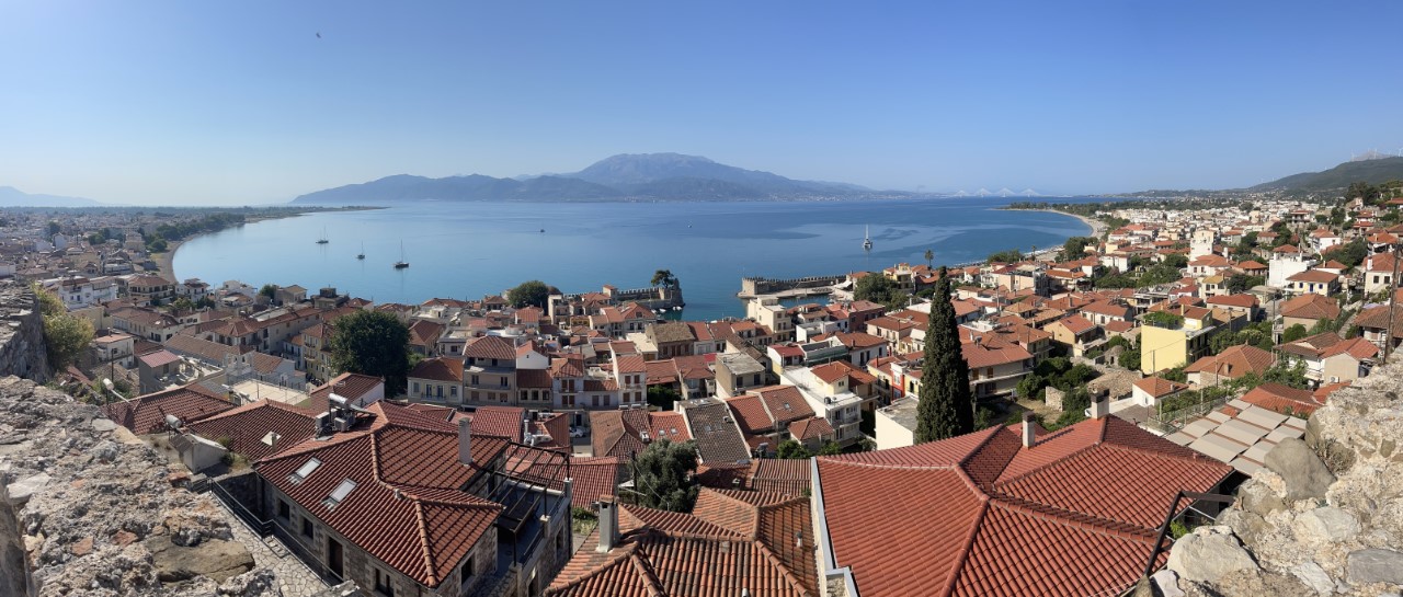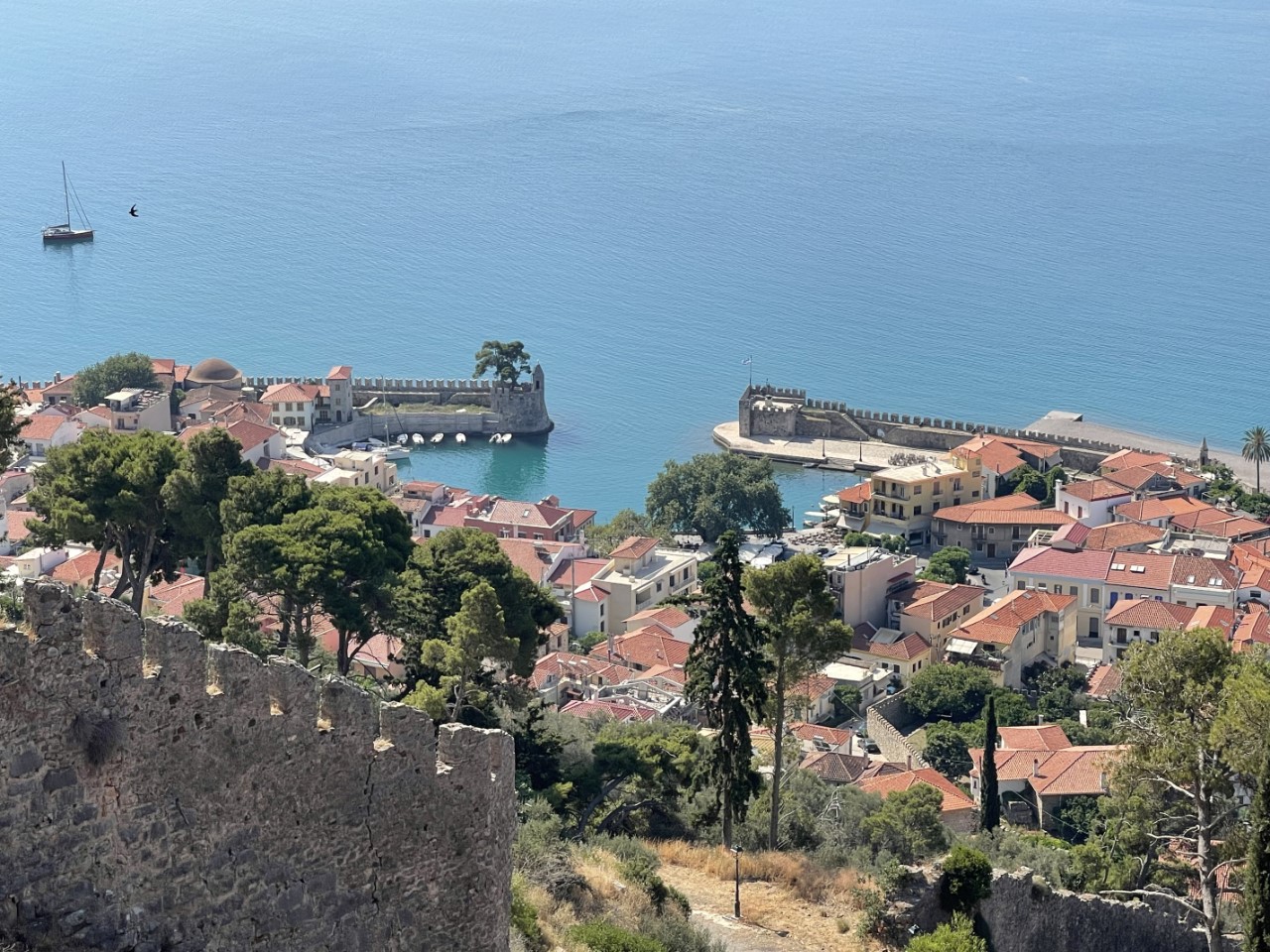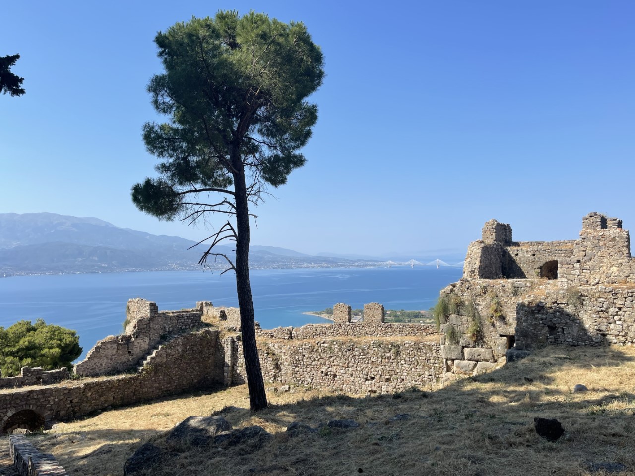 Na een flink zondags ontbijt hebben we genoeg energie om de beklimming te ondernemen naar het kasteel van Náfpaktos. We gaan zo vroeg mogelijk, want om dit in de middag te doen met ruim 35 graden, dan lopen we een appelflauwte op. Ook nu was het zwaar, heel zwaar. Er zijn veel trappen en iets te steile hellinkjes, maar we hebben het gehaald. Even uitpuffen bij het kassahokje op een bankje in de schaduw. We dachten dat we alle beklimming hadden gehad, maar ook binnen het kasteel is het nog veel klimmen, voordat we het hoogste punt bereiken.