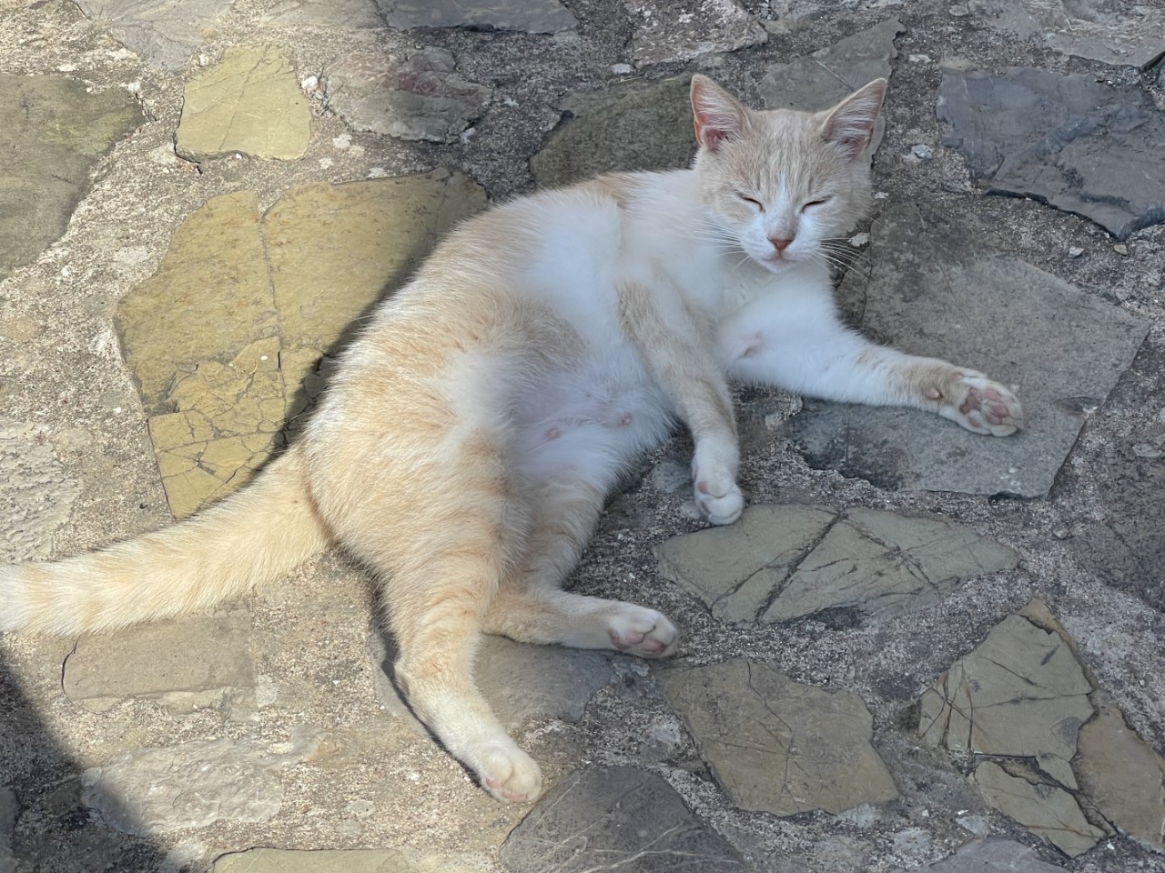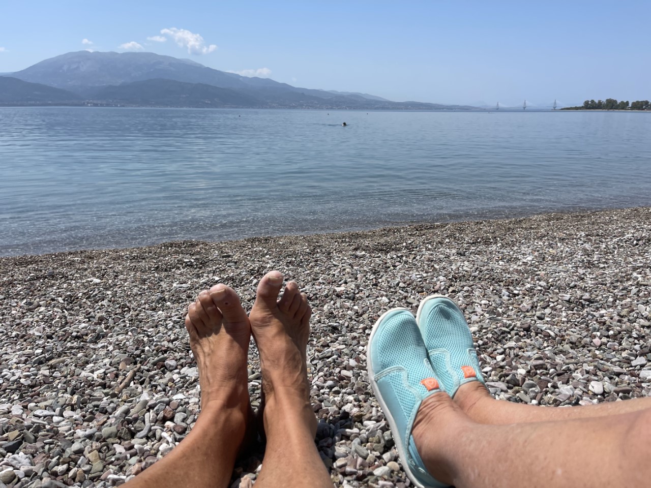 We hebben alles gezien en gaan via een autoweg naar beneden, wat iets makkelijker lopen is. Bij het restaurantje achter de Just nemen we beiden een lekkere, koele frappè cappuccino. We hebben nog meer verkoeling nodig en zijn bijna direct naar het strand gewandeld. Daar nemen we een duik om onze verhitte lichamen nog meer af te koelen, wat met sissen gepaard ging.