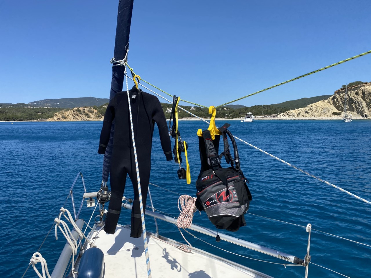 Het vakantie gevoel begint te komen. De eerste Cala, aan een ankertje, een rustige nacht, beetje uitslapen en prachtig mooi weer. Maar er staan wat klusjes op het programma. Er moet gedoken worden. De schroef en romp zitten helemaal vol met kokkels en aangroei van de 6 maanden stil liggen in Valencia. Dus na het ontbijt de duikspullen aan en het water in.