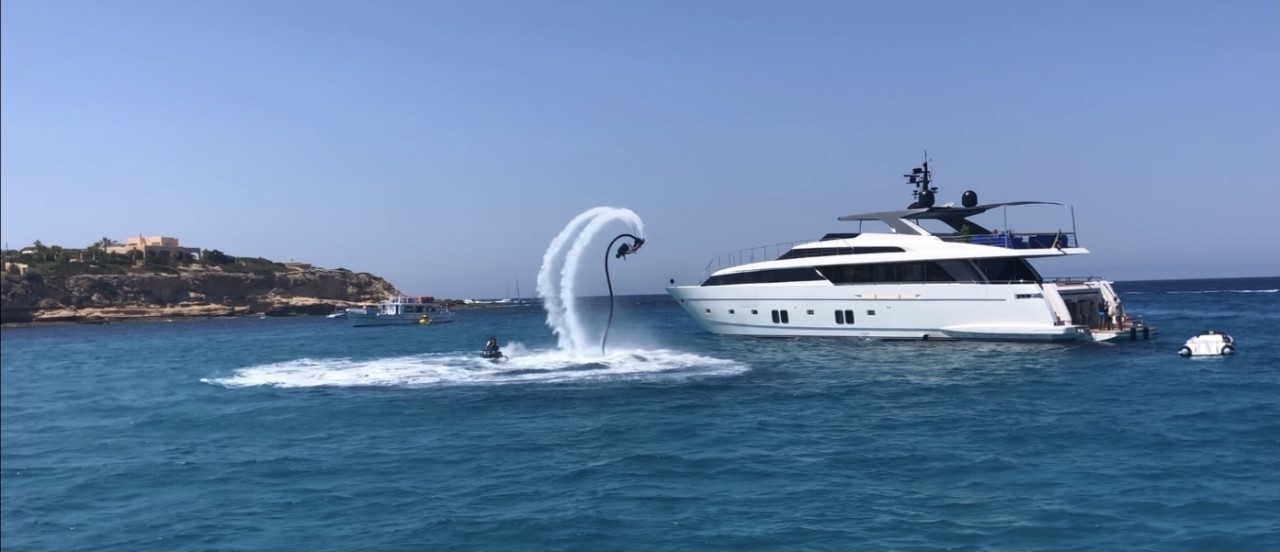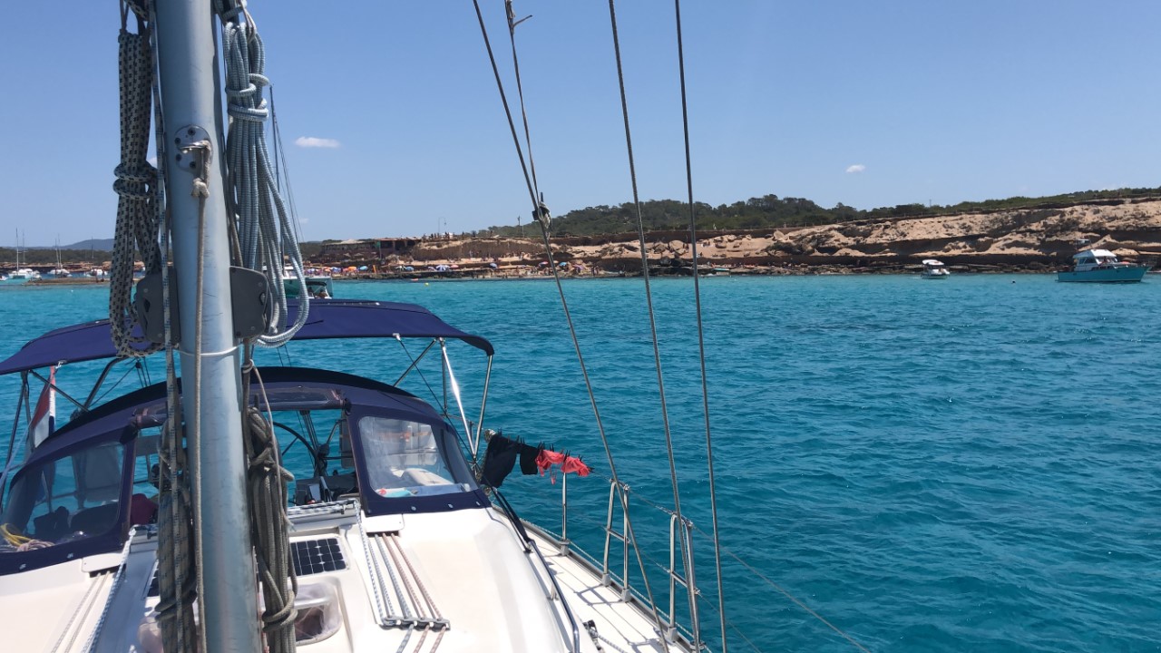 We kunnen eindelijk beginnen aan een verlaat zondagsontbijtje. Marianne heeft daarna de gehele kuip voor zichzelf en zat verdiept in een boekje. Ik zoek de zon op en zit wat te lezen op het voordekje. En ondertussen kijken we naar de capriolen van alweer een superjacht met z’n waterspeeltjes, leuk om te zien.