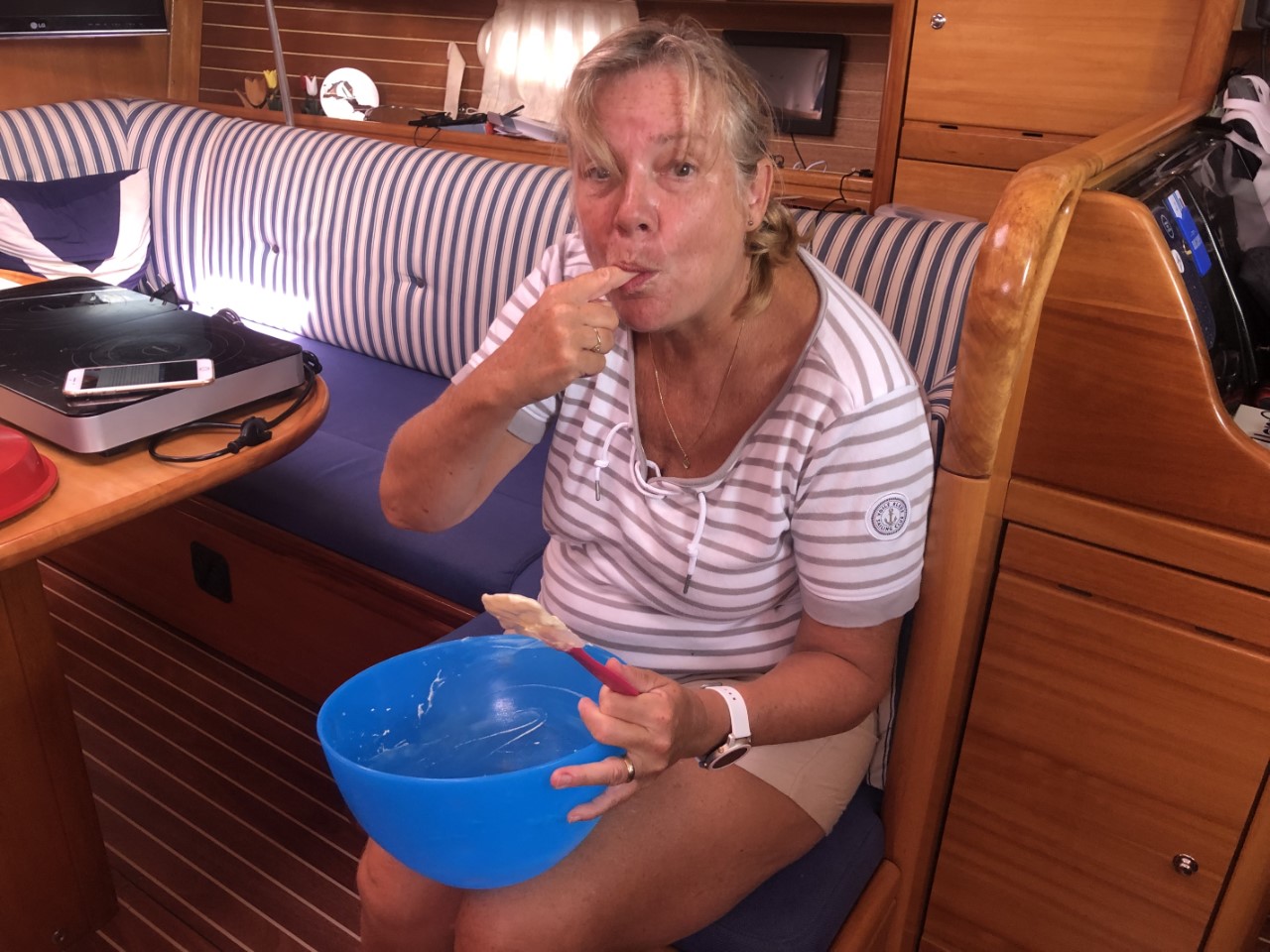 Tegen de avond krijgen we een whatsappje van de Flegma (Marion & Paul) dat ze op koers liggen naar onze baai en of er nog plek is. Er zijn nog wat plekjes en een uurtje later konden ze hun anker uitgooien na hun tocht vanaf Valencia. Wij krijgen een uitnodiging om even bij te kletsen en zijn naar ze toe geroeid. We hebben verhalen aangehoord over hoe gezellig Valencia is en wij hebben verteld over onze ervaringen op Ibiza, met een hapje en drankje was het gezellig. Als het begint te schemeren en het zonnetje verdwenen is, hebben we de Just weer opgezocht.
