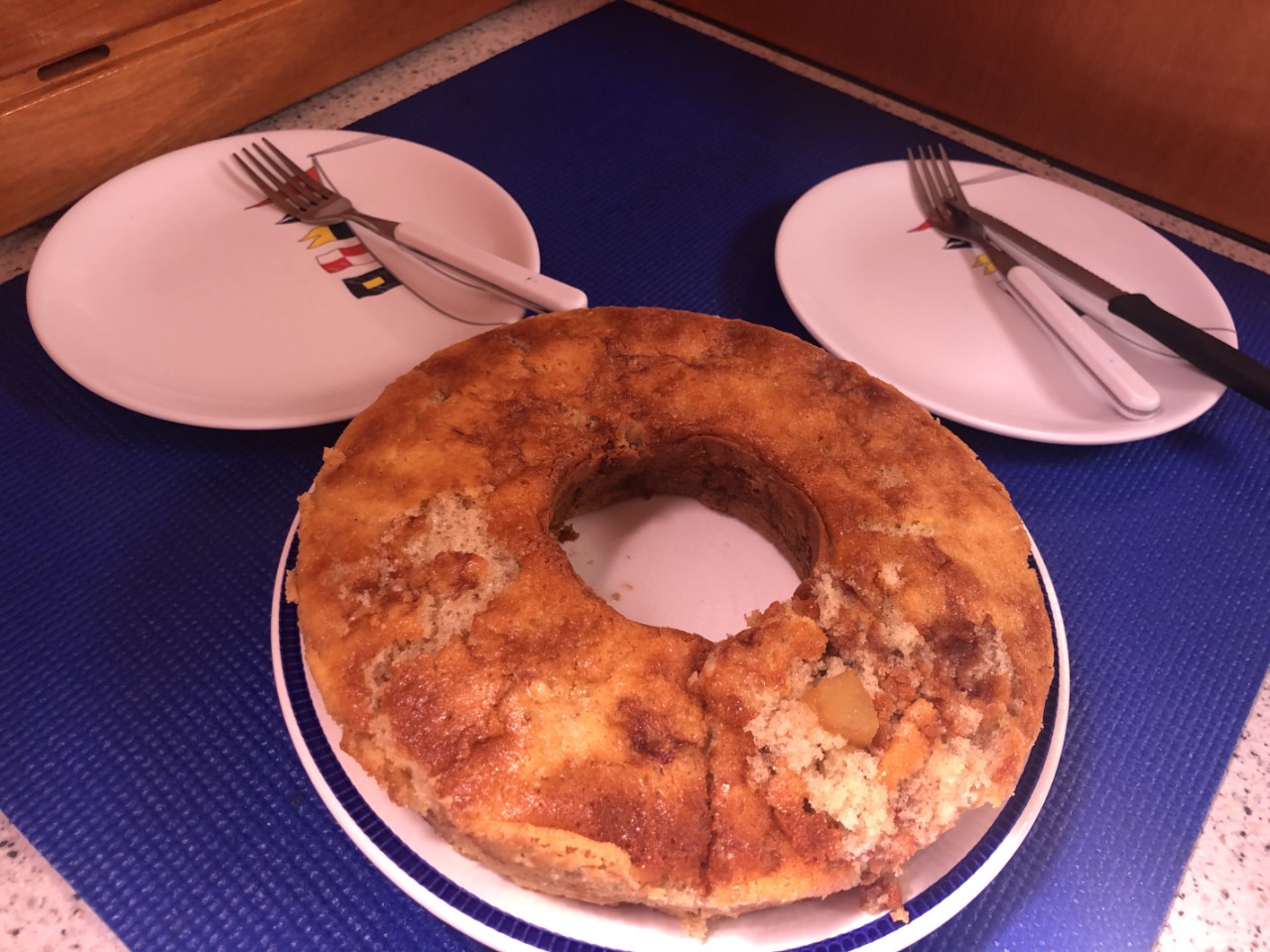 Vandaag weer een feestje. Jammer genoeg niet aan boord, maar in Lisse. Mark is jarig, 34 jaar alweer. Om toch een beetje het feestje mee te kunnen vieren maken we een appelcake in de wonderpan. Het resultaat ziet er mooi uit, smaakte voortreffelijk, maar hij had nog een paar minuten langer kunnen bakken, een leerles voor de volgende keer.
