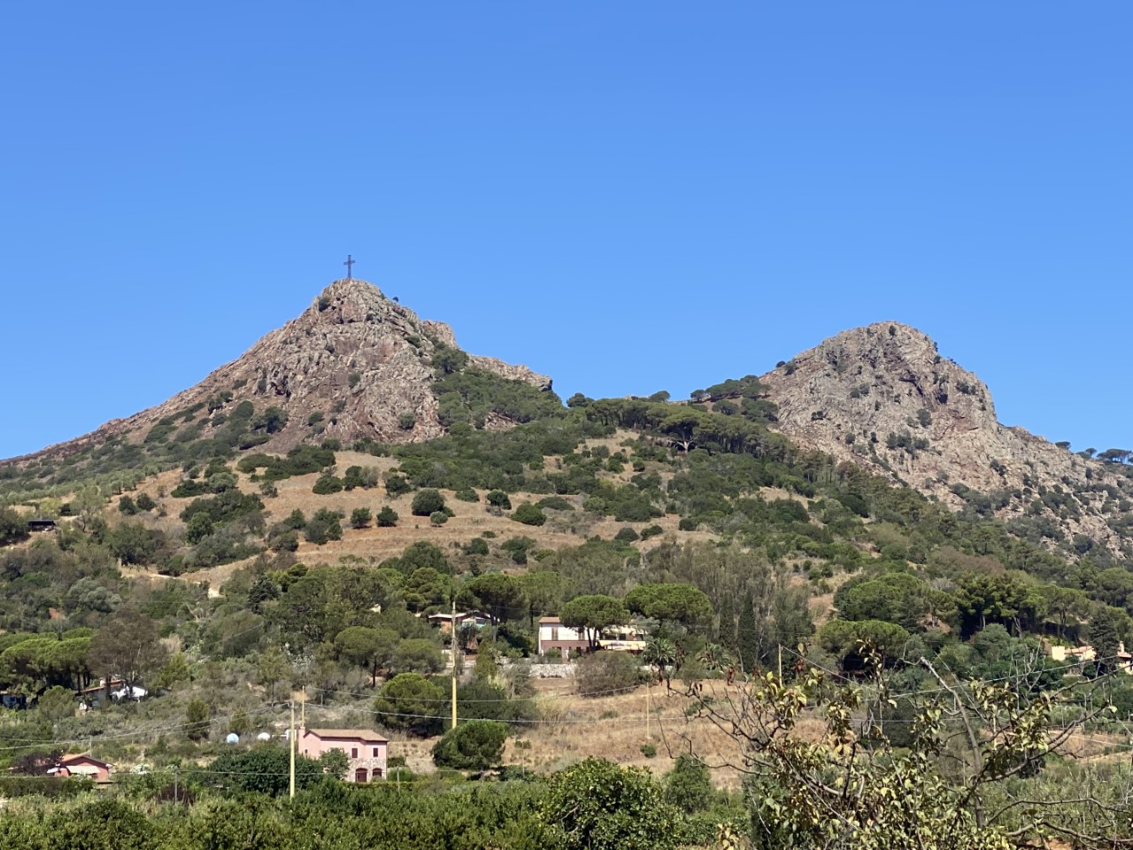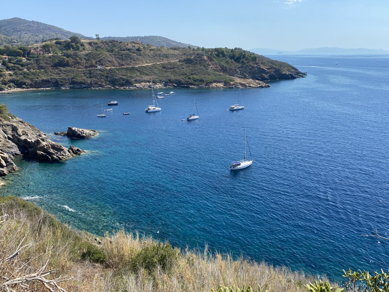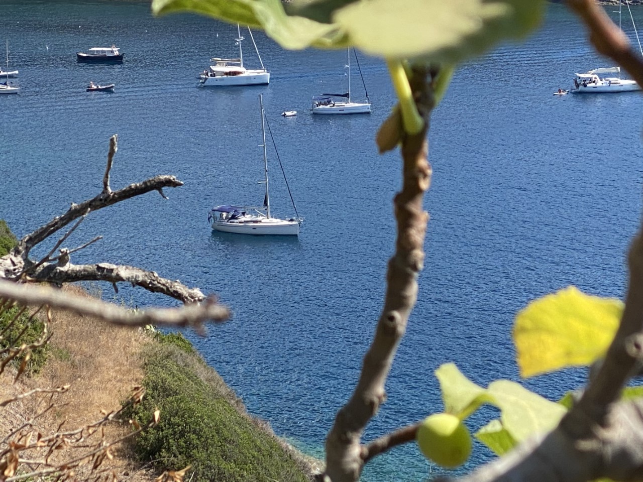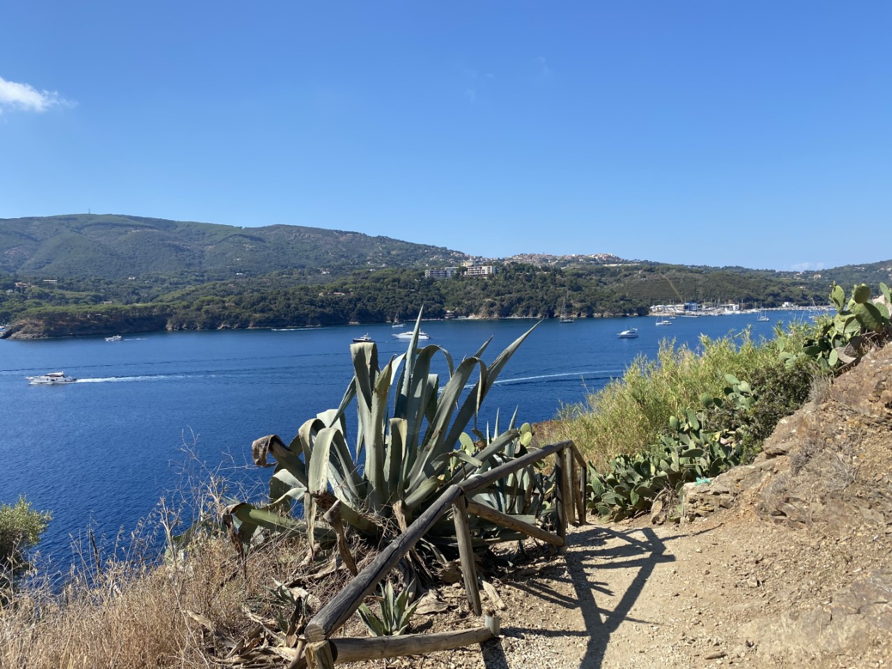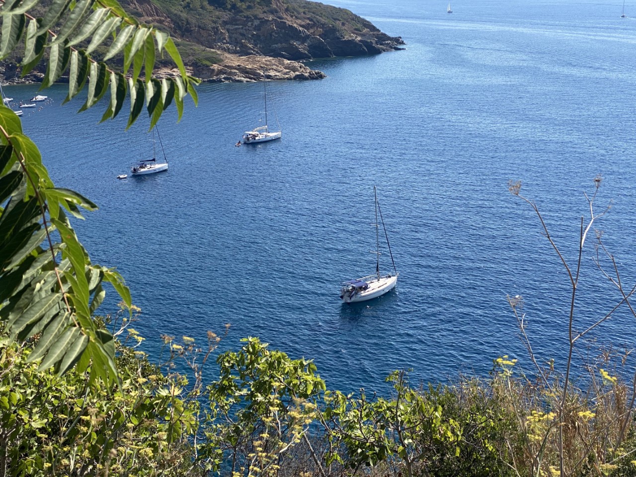 Daarna zijn we met het bijbootje naar de haven gevaren. De wandelroute begint rustig, alles vlak, maar dat was van korte duur. Al snel doemt er een onregelmatige trap op van wel 150 treden. Dan zijn we wel op het hoogste punt, waar we al snel een bankje in de schaduw vinden. Na het rustpunt lopen we langs een voormalige gevangenis met een mooi uitzicht over de baai van Azzurro. Verderop is er een oud fort, waar de Just onder voor anker ligt. De weg is redelijk vlak verder, totdat we aan de afdaling beginnen. Via een zig zag pad komen we bij het strandje en gaan we meer het land in langs wat landbouwgronden. Daar beslissen we of we via de weg terug gaan naar Porto Azzurro of dat we de route afmaken met de wetenschap, dat het hoogste punt op meer dan 200 meter ligt. We bekijken de route van een afstand en zien dat als we verder gaan alles in de volle zon gelopen moet worden op het heetst van de dag. We nemen dan maar de snelste en veiligste route. Zo is het anderhalf uur later tijd voor een bakkie koffie en koud water. Bij de supermarkt hebben we voor de komende vijf dagen boodschappen ingeslagen. Nog een laatste ijsje op de kade en dan terug naar de Just.