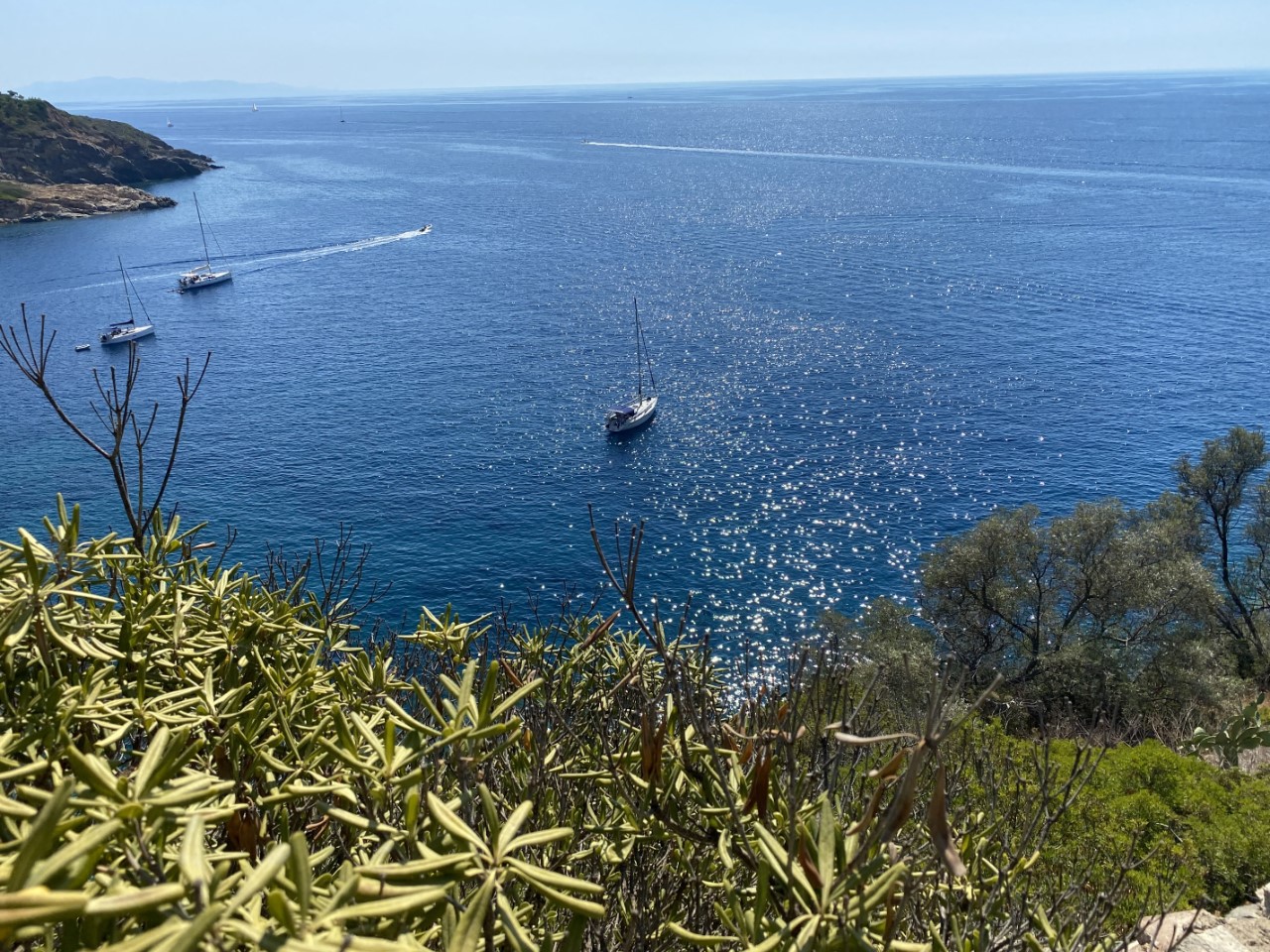 Vandaag gaan we flink aan de wandel. Op de rots boven onze ligplaats is een kust pad. Marianne heeft de route uitgestippeld, die we zo gaan wandelen. Maar eerst ga ik naar het strandje. Daar vertrekt iedere dag een bootje met duikers. Mijn duikfles is helemaal leeg, heel misschien willen ze de fles vullen. Jammer, de fles is van 2017 en die moet eerst gekeurd worden. Gelukkig kan ik wel een volle fles lenen. Nu kan ik met voldoende lucht duiken om te kijken naar de klapschroef, die niet meer helemaal in wil klappen. We vermoeden, dat het gebeurd is langs de kust van Corsica, toen we over onderwater gelegen tonnetjes vaarden. Met vooruit varen zijn er geen problemen, maar achteruit gaat minder soepel. Zonder duikfles had ik al gekeken en heb ik schelpjes en aangroei tussen de tandwielen verwijderd. Nu met een duikfles gaat het stukken makkelijker, maar helaas kan ik het niet repareren. Iets loopt aan. Dat wordt een klusje voor het voorjaar als de Just op de kant staat.