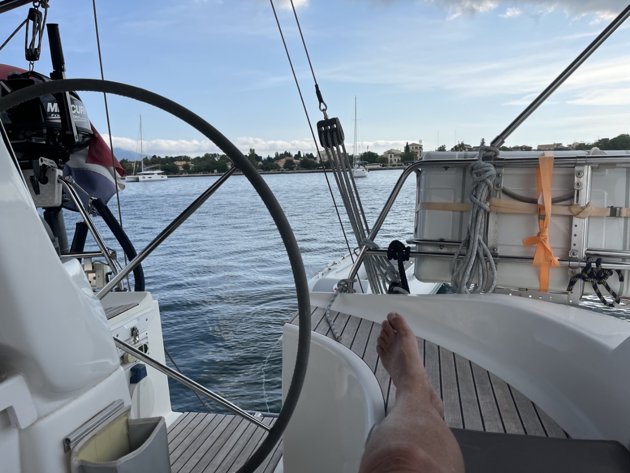 Ik ging al vroeg naar de Lidl. De verwachte regenbui laat nog even op zich wachten, voorlopig is het schitterend weer. Met twee volle tassen kom ik terug op de Just. Genoeg voor de komende vier- vijf dagen. Ons laatste dagje bij Corfu-stad doen we niet veel meer. Behalve een duik in het water voor wat verfrissing. Ook hebben we een planning gemaakt. We willen de Blauwe grot bezoeken. Daarvoor moeten we een stuk terug varen, om dan Corfu noordelijk te ronden en daarna af te zakken langs de westkant.