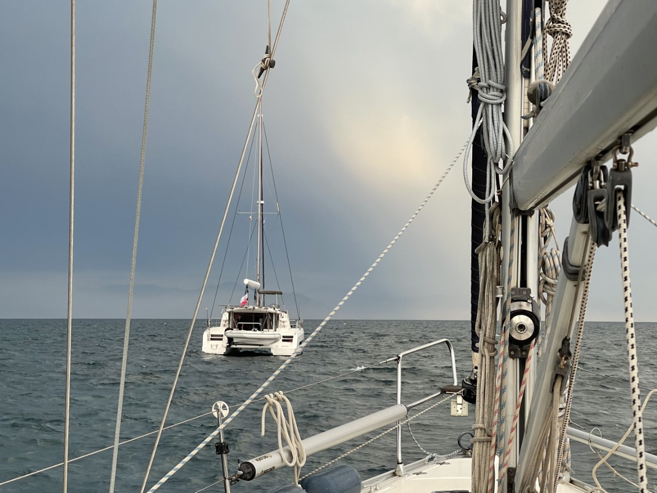 Tegen 18:00 uur begint het boven Albanië te donderen met af en toe een bliksemschicht. Bij ons in de baai begint de wind iets meer te loeien. Niet veel later meten we ruim 25 knopen met een fikse regenbui. Kloppen de voorspellingen toch, alleen komt het iets later. We staan geruime tijd in de kuip te kijken of de catamaran, die voor ons ligt niet losslaat van z’n anker. Pas na een uur komen de eigenaren terug en halen we opgelucht adem.