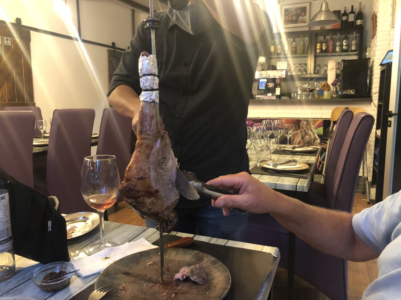 Voor ons laatste dagje in Fuengirola zochten we nog een gezellig restaurantje. Marianne had een voorkeur voor La Ola waar we 43 jaar geleden romantisch gedineerd hadden, maar die was niet meer terug te vinden. Een van de havenrestaurantjes serveerde super grote Duitse schnitzels, maar dat tentje vonden we geen leuke uitstraling hebben. Maar we vonden in een wijkje met allerlei restaurantjes een mooi uitziend Braziliaans churrascaria restaurant, waar vlees op spiezen werd geserveerd. We hebben er heerlijk gegeten en gedronken.