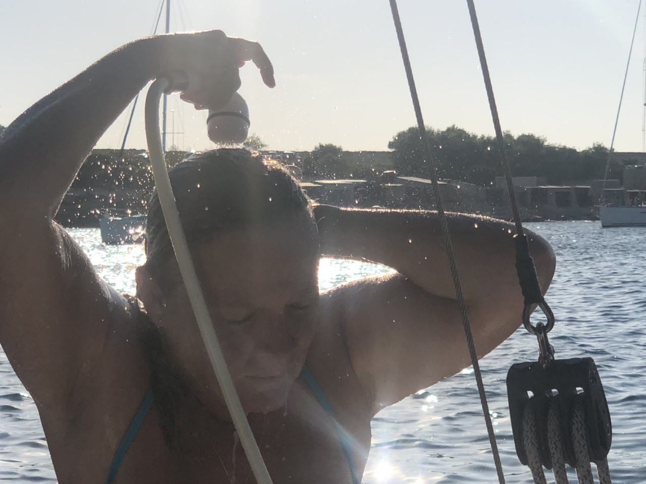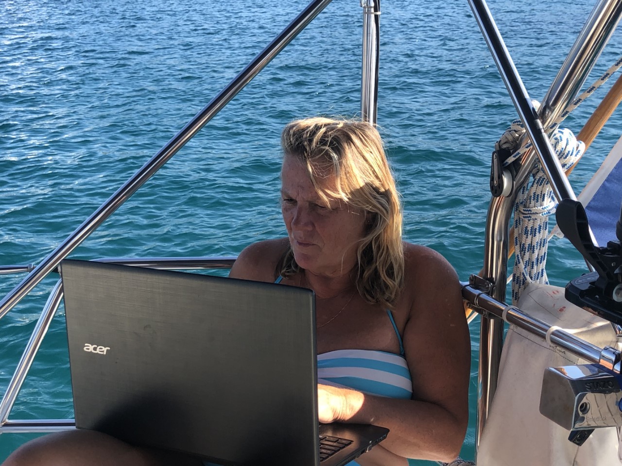 Na onze middagmaaltijd zijn we naar de Flegma gezwommen voor wat beweging en een praatje. We weten nu wat onze eindbestemming gaat worden dit jaar, dus de volgende stap is het boeken van de vliegtickets. Maar daar waren we snel uit en we vliegen nu op een mooie tijd naar huis. Morgenochtend nog wat boodschappen halen en dan proberen een windstille baai uit te zoeken om Daniel met het bijbootje op te halen.