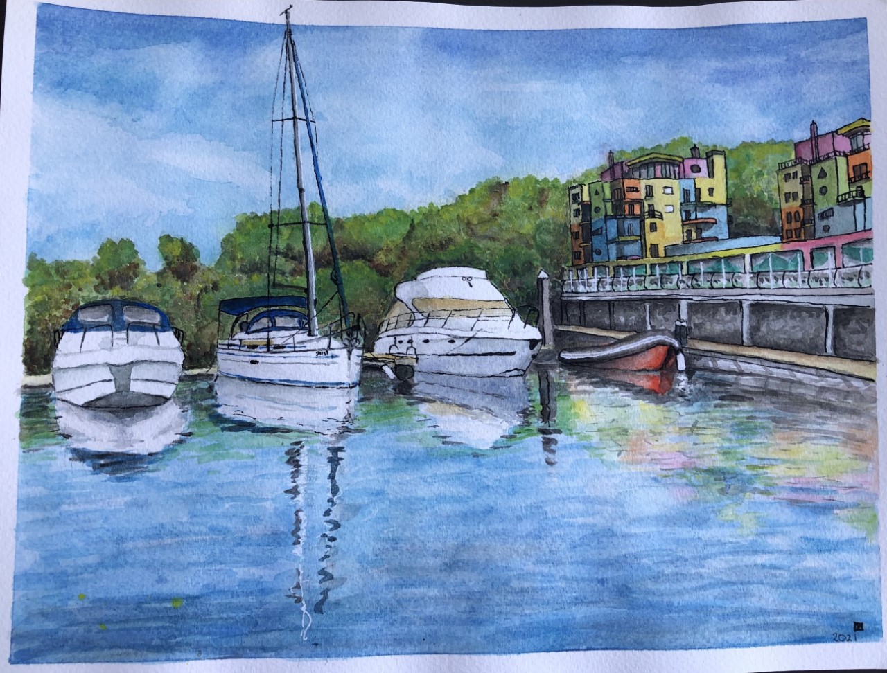 Marianne is heel de ochtend druk geweest met hoe en waar we Daniel morgenavond het beste kunnen ophalen. Het vervelende is, dat juist morgenavond de wind toeneemt en precies in de baaien staat, waar we willen ankeren, maar niks veranderlijker dan het weer. Ik heb heel de ochtend niks gedaan, een boekje lezen, een klein tukkie en weer verder met lezen. Marianne was veel actiever, want die heeft ook de laatste puntjes van haar Albufeira schilderijtje aangepakt en officieel van haar handtekening voorzien.