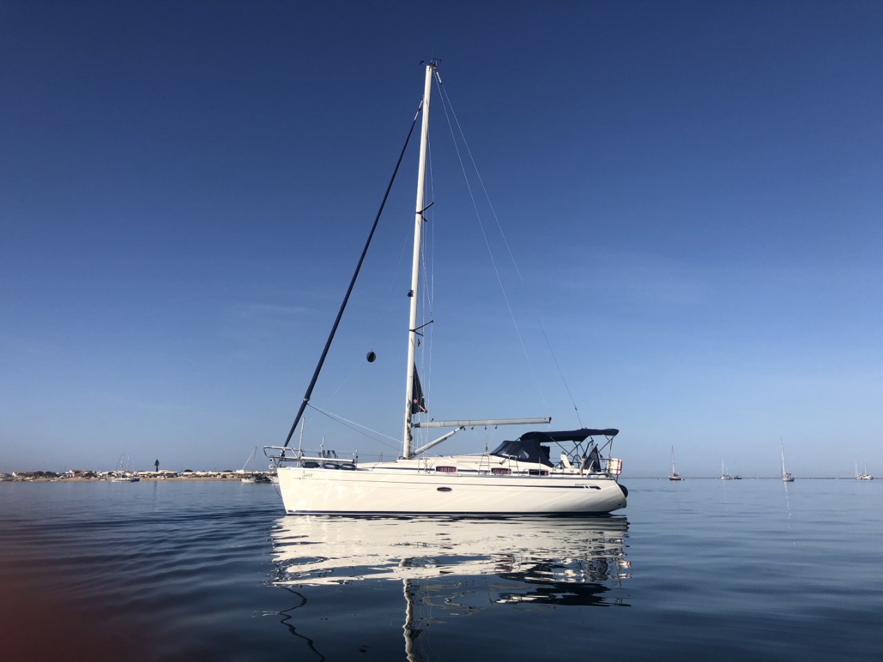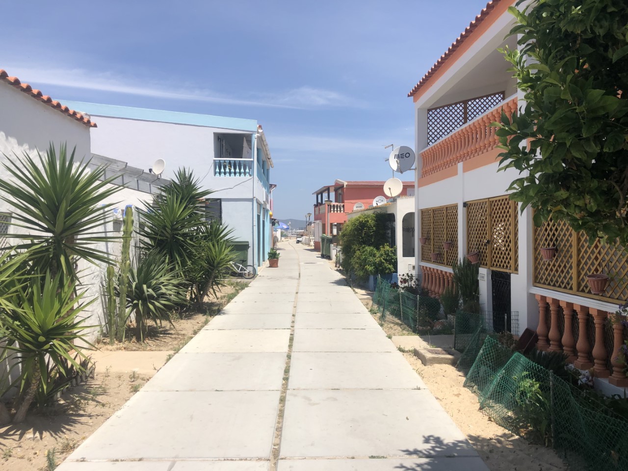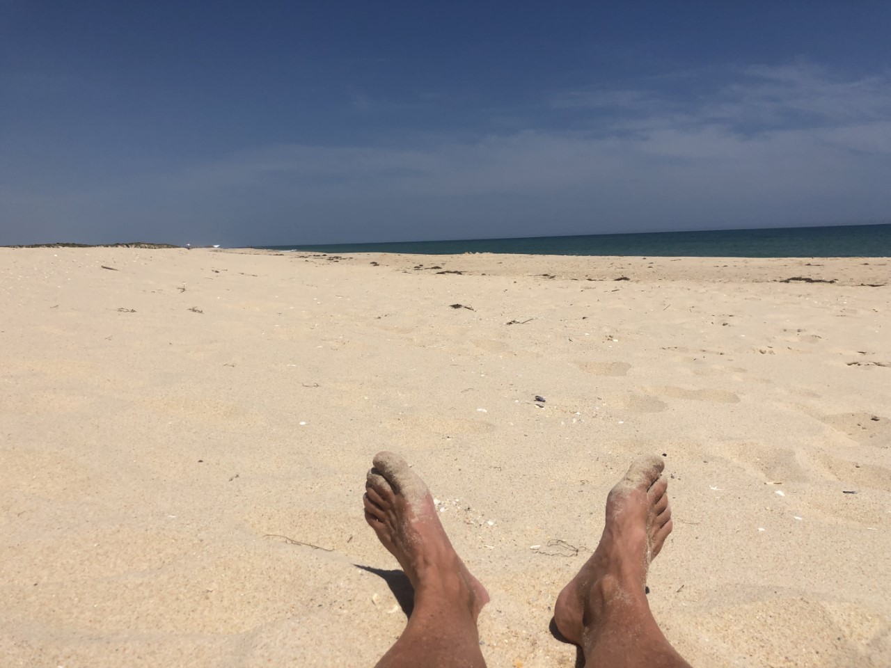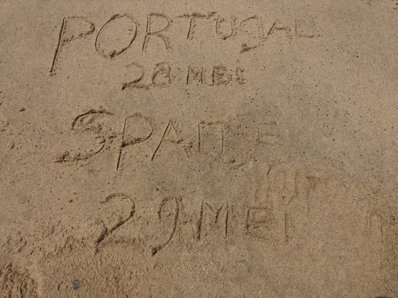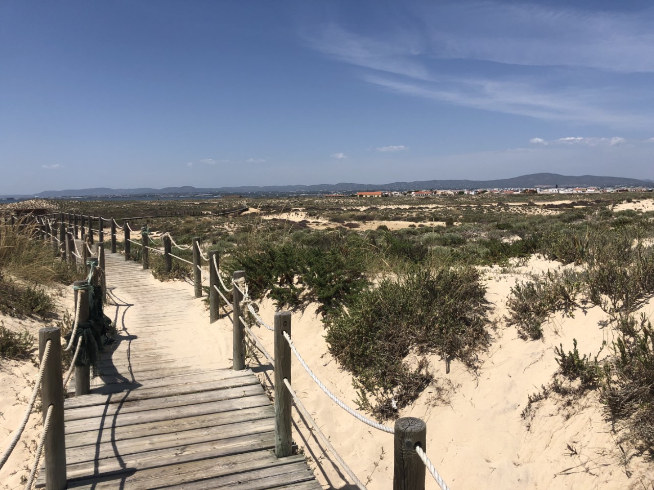 We zijn toen bakboord uit de haven uitgevaren om ons avontuurlijke rondje om de zandbank af te maken. Ook hier was het ondiep en we raakten even licht de zandplaat. We waren snel los. Iets later kwam er een vissersbootje langs ons en die had een mooie snelheid om te volgen, wat voor ons makkelijker was om de ondieptes te ontwijken. Toen we terug in dieper water waren, hebben we een kort bezoekje gebracht aan de Pincoya, die we ieder jaar wel eens een keertje tegen komen. Na een kort praatje hebben we ze uitgenodigd voor een drankje in de namiddag. Terug op de Just hebben we na een korte lunch de handdoeken gepakt en zijn naar Culatra gevaren om naar het mooie zandstrand te gaan. Prachtig wit zand, een lange duinenrij, één enkel strandhutje voor een drankje en je kon er klaargezette parasols huren, maar de paar strandgasten gingen liever bakken in de zon. Na wat bakken, pootje baaien in het ijskoude oceaanwater en een wandeling langs de vloedlijn, hebben we in het dorpje het koffietentje van gisteren weer bezocht om de lokale economie te steunen.