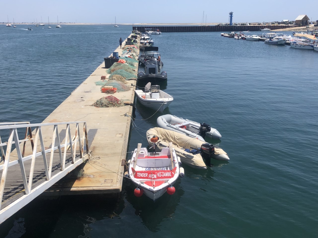 Vanmorgen waren we al vroeg op pad met het bijbootje. We dachten dat we rechtstreeks naar Olhão konden varen, maar we stuitten op een grote zandbank. Wij zijn toen maar langzaam langs de rand van de zandbank gevaren, wat voor ons een hele omweg was. We dachten dat het maximaal een kwartiertje zou duren, maar nu kwamen we pas na ruim een uur varen aan in de haven van Olhão. Het was even zoeken waar we benzine konden tanken voor het motortje en daar hebben gelijk gevraagd waar de dingysteiger was. We moesten wel voor dat ligplaatsje €3,08 per uur betalen. We hebben dan ook de kortste route naar de Lidl genomen om binnen dat uur terug te zijn. Dit keer hebben we echt de laatste keer pasteis de nata gehaald.