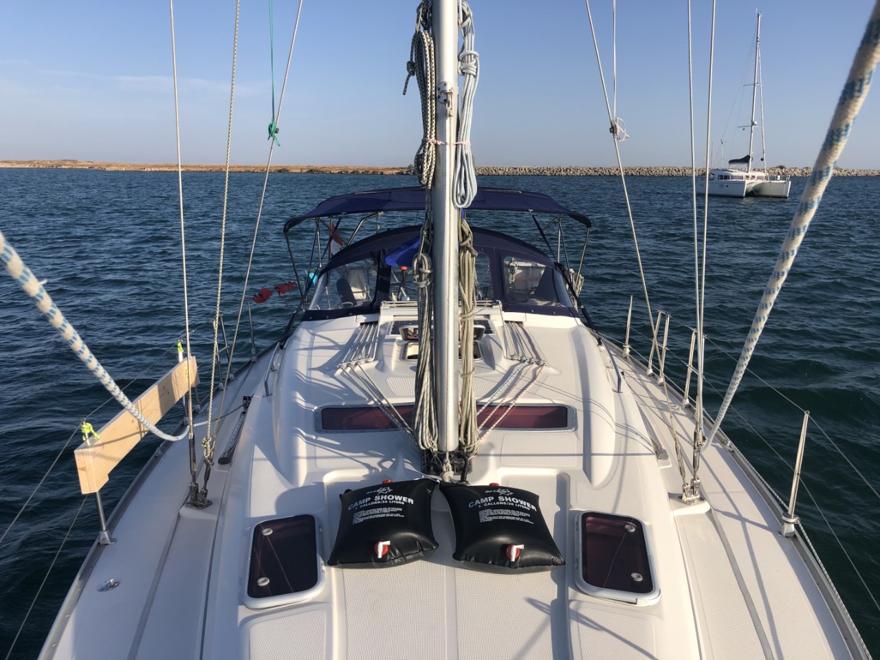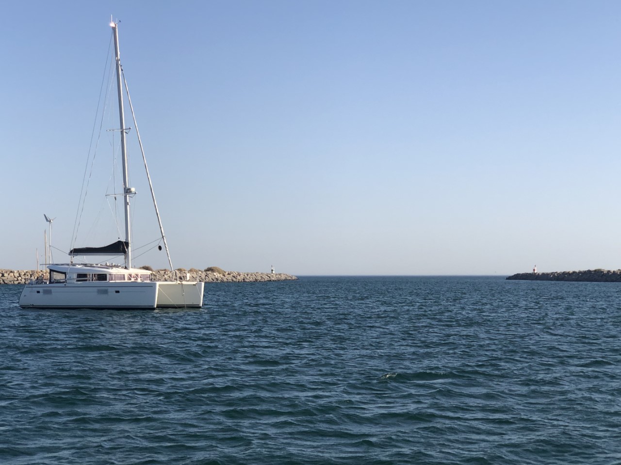 De ingang tussen de havenhoofden ziet er toch wel breed uit en we willen het gaan proberen. Marianne ging op de boeg staan om de ondieptes te zien aan de lichtere kleur van het water. Met de dieptemeter en met behulp van de kaartplotter zijn we driehonderd meter de Rio ingevaren en hebben ons anker gedropt in 4,5 meter diep water. Dan zouden we nog speling genoeg hebben met laagwater. Na een uurtje of twee nam de wind iets toe en dat voelde aan of er een warme föhn op je gericht was. Marianne nam een duik en ik genoot van het zonnetje op het voordek. Er komen rond ons heen bootjes aan en gaan weg. Na hoog water in de avond ging ook de wind weer liggen. Het is hier stil en rustig ankeren. De bedoeling is om hier twee nachtjes te blijven en dan een haventje in te duiken.