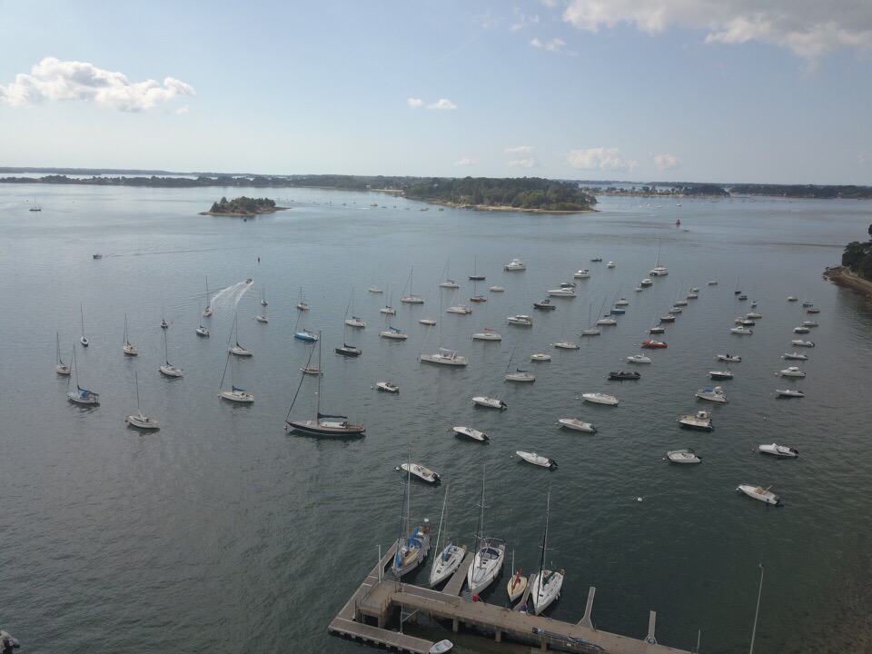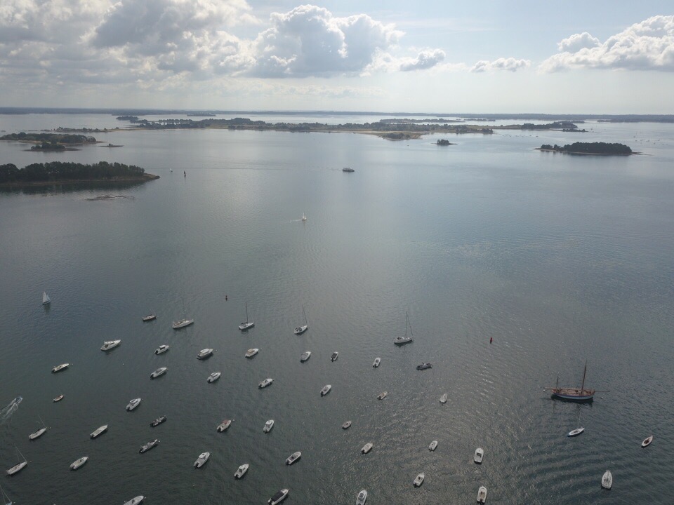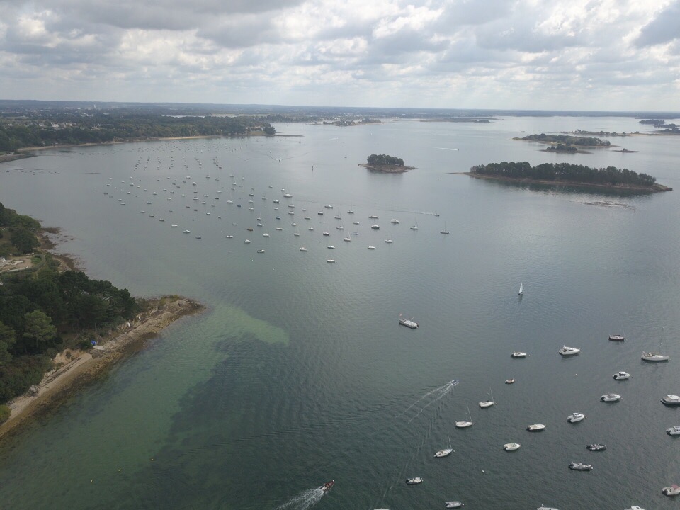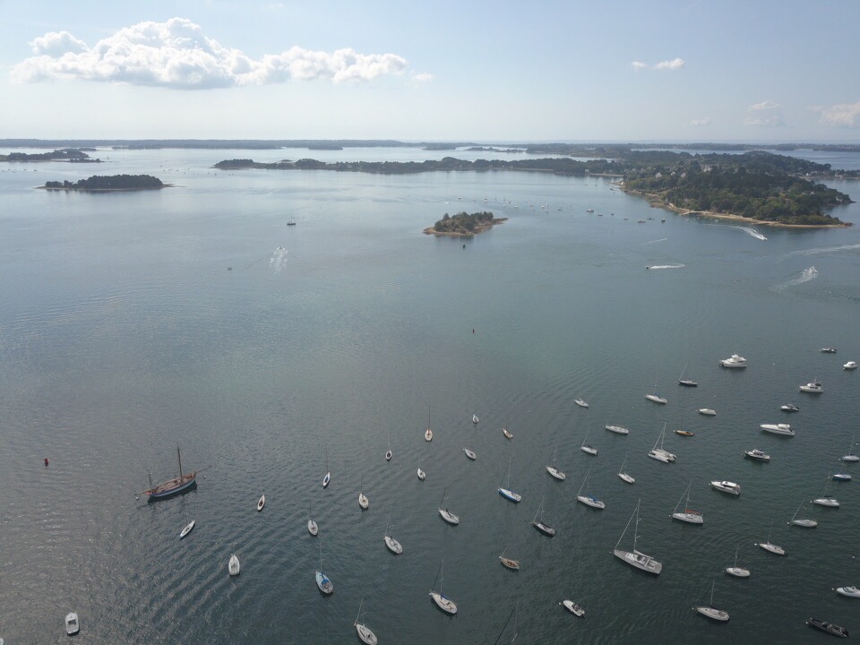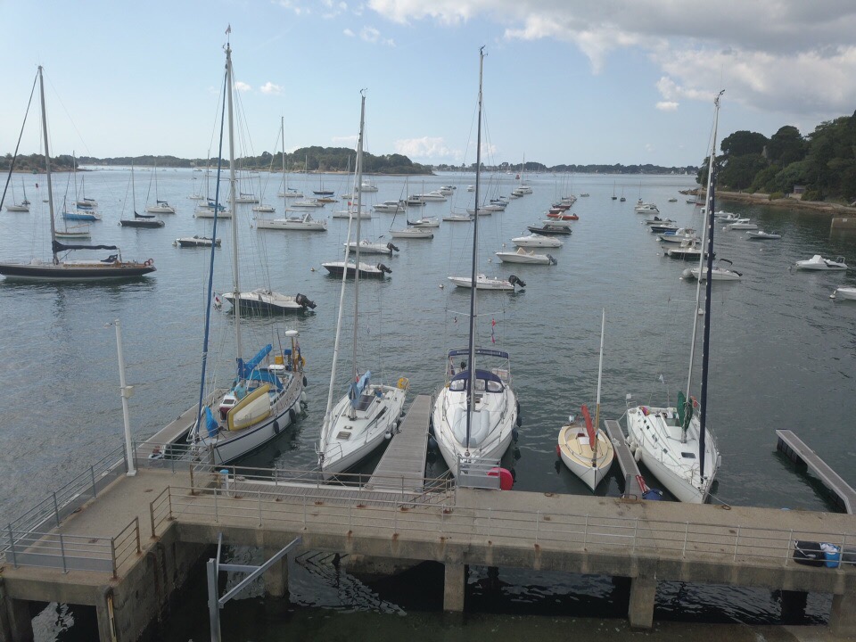 We gaan weer de Golf van Morbihan in. Daarvoor hebben we gisteravond nog even zitten rekenen, wanneer we het beste daar naar binnen kunnen varen. En hoelaat we moeten vertrekken. We hebben het plan om voor 1 dag een mooring te nemen en daarna, omdat het maandagnacht en dinsdagochtend flink gaat waaien de haven van Vannes in te duiken. Eerst worden nog even de watertanks gevuld. Het was zondagochtend 10.00 uur en het was optocht varen om de haven van Le Crouesty uit te komen. De meesten gingen richting de eilanden, maar wij zetten koers naar de ingang van Morbihan. We hadden goed gerekend en met 2 knopen stroom mee waren we in een uurtje bij de moorings van Arradon, die we op het oog hadden. Maar helaas de moorings lagen allemaal vol volgens de havenmeester, maar we konden wel aan het ponton. Daar hadden we niet op gerekend, dus snel de bolders en de landvasten klaar leggen, want we willen niet aanleggen als Fransozen. De havenmeester wees ons een plekje aan achter een mooie Lagoon catamaran. Toen we daar afgemeerd hadden, kwam hij echter langs en zei dat we wel achter de catamaran moesten, maar dan wel in één van de boxen haaks achter de catamaran, ook goed. Uiteindelijk hebben we een goed plekkie en we kunnen ook nog wandelen. Maar wat we al eerder gemerkt hadden in Morbihan, is dat de veerboten en speedboten hier snel varen met de nodige golfslag, dus we liggen ook nu weer aardig te hobbelen. Maar het is maar voor één dag en in de avond is alles weer rustig. Met de drone heb ik even gevlogen en een filmpje en wat foto’s gemaakt van de vele eilandjes in de Golf. Ik ging de race kijken en Marianne was met de voorbereidingen bezig voor ons zondagse maaltje. We hadden een lekkere maaltijd, een amuse van tonijntoastjes, rauwe ham met meloen, Port Salut met zongedroogde tomaatjes, de hoofdschotel bestond uit zacht gegaarde eendenfilet, Franse frietjes en witlofsalade met sinaasappel en dressing, als toetje gepocheerde perziken met kwark en een frambozencoulis. Na al dit lekkers hebben we een wandeling gemaakt op Pointe d’Arradon een schiereiland met allemaal grote mooie buitenhuizen. Terug op de Just was de rust weer gekeerd en gaan we een rustige nacht in.