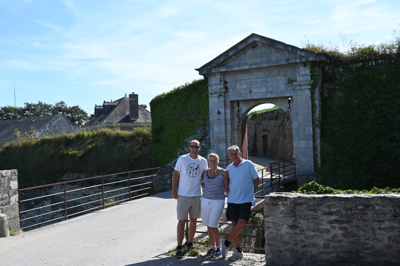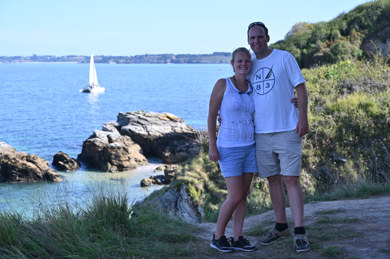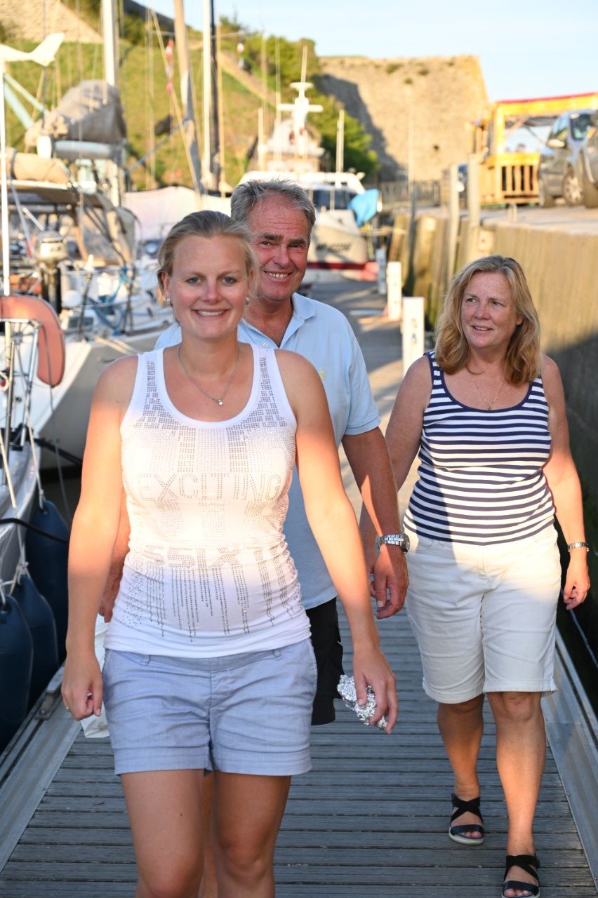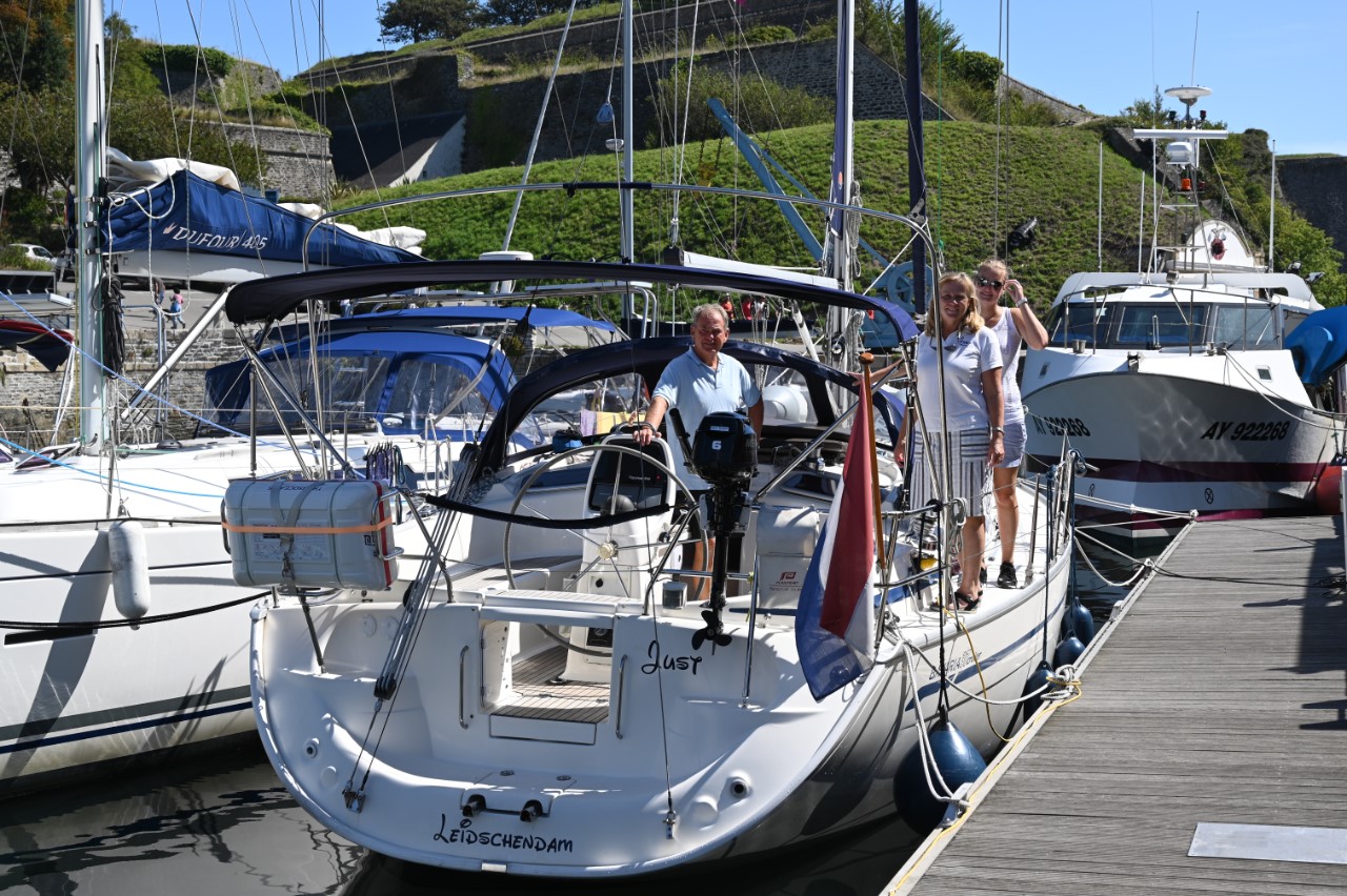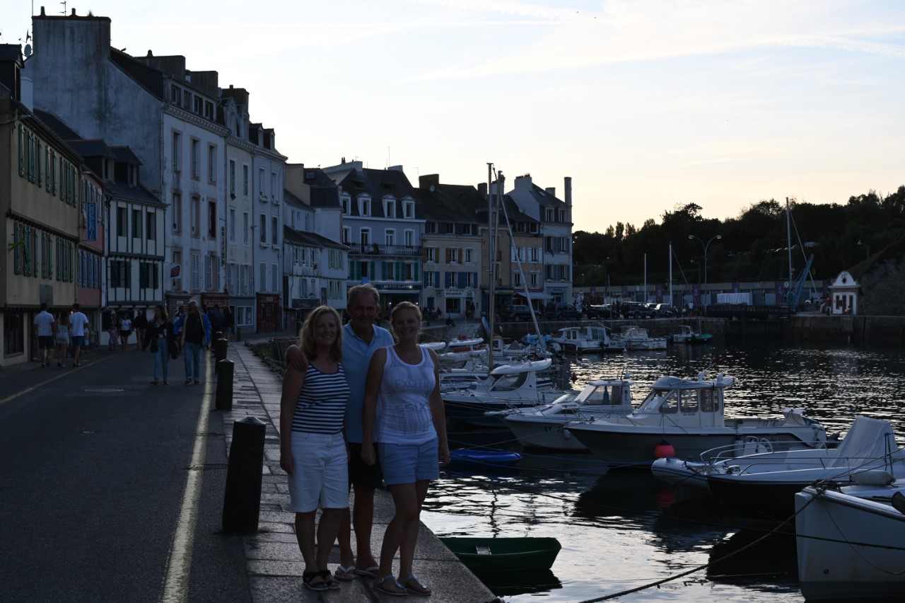 Nog voor het ontbijt was het een heel schouwspel in de haven van vertrekkende bootjes. De havenmeesters gebruikten hun rubberbootjes als veredelde boegschroef om de schippers een handje te helpen in de nauwe havenkom. De rust is weer gekeerd, dachten we, maar ook wij moesten verplaatsen naar een plekkie direct aan de kade. Eindelijk! We kunnen ontbijten in de kuip. We hebben daarna het stadje bezocht, weer langs alle babykledingshopjes en een heel klein Frans marktje. Met Mark heb ik het rondje na de lunch nogmaals gelopen om te kijken of we een leuk restaurantje konden ontdekken voor vanavond. Ondertussen zag Mark het ultieme maritieme babypakje voor zijn zoontje en heeft deze als verrassing voor de zwangere Marion meegenomen. We zijn daarna gestopt bij een ijssalon a la Blankenberge en met een 3 bollen groot ijsje zijn we richting de Just gegaan. We wandelden nogmaals rond de havenkom zonder een beslissing welk restaurant. De dames hebben een wandelroute op het douanepad bepaald. Via de ingang van de Citadel, het fort van Vauban, bereikten we het kustpad. We kwamen langs mooie rotspartijen, verborgen strandjes en volop mooie, paarse bramen die Marianne niet kon laten hangen. Rond 18:30 uur waren we terug op de Just en nog steeds was er geen plan voor onze maaltijd voor vandaag. De knoop is doorgehakt. We zoeken morgen een lekker restaurantje in Quiberon. En gaan nu wat halen bij de plaatselijke snackbar. Met een lekkere hamburger en een flinke portie Franse frietjes hadden we een lekkere vrijdagavond maaltijd. Als toetje namen we nog een ijsje, maar nu hielden we ons in. 2 bolletjes vonden we genoeg. Aan boord zitten we in spanning of het weer zo’n spektakel gaat worden als vanmorgen in de haven. Wij gaan dat spektakel morgenochtend zelf weer meemaken, als we om 10:00 uur vertrekken.